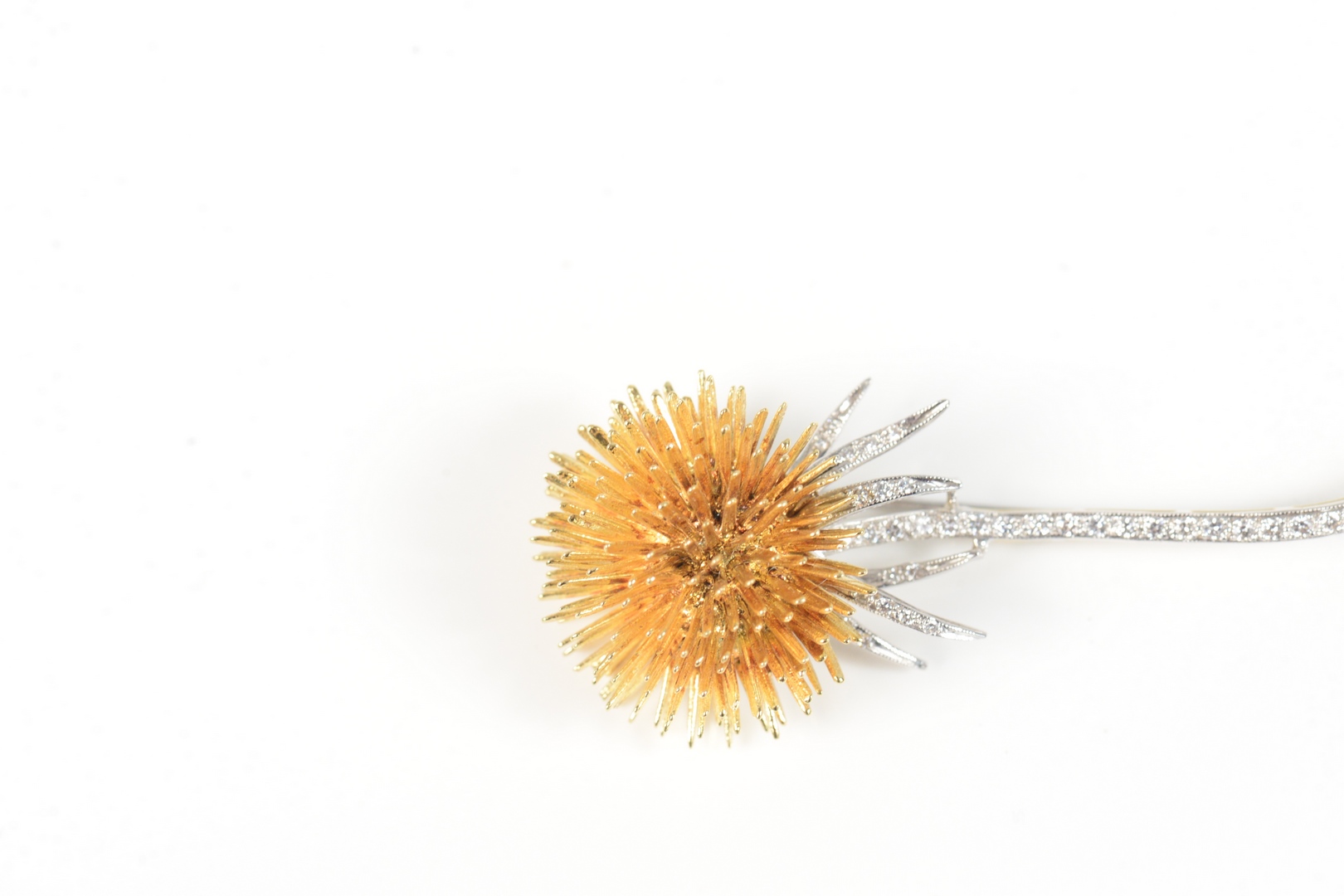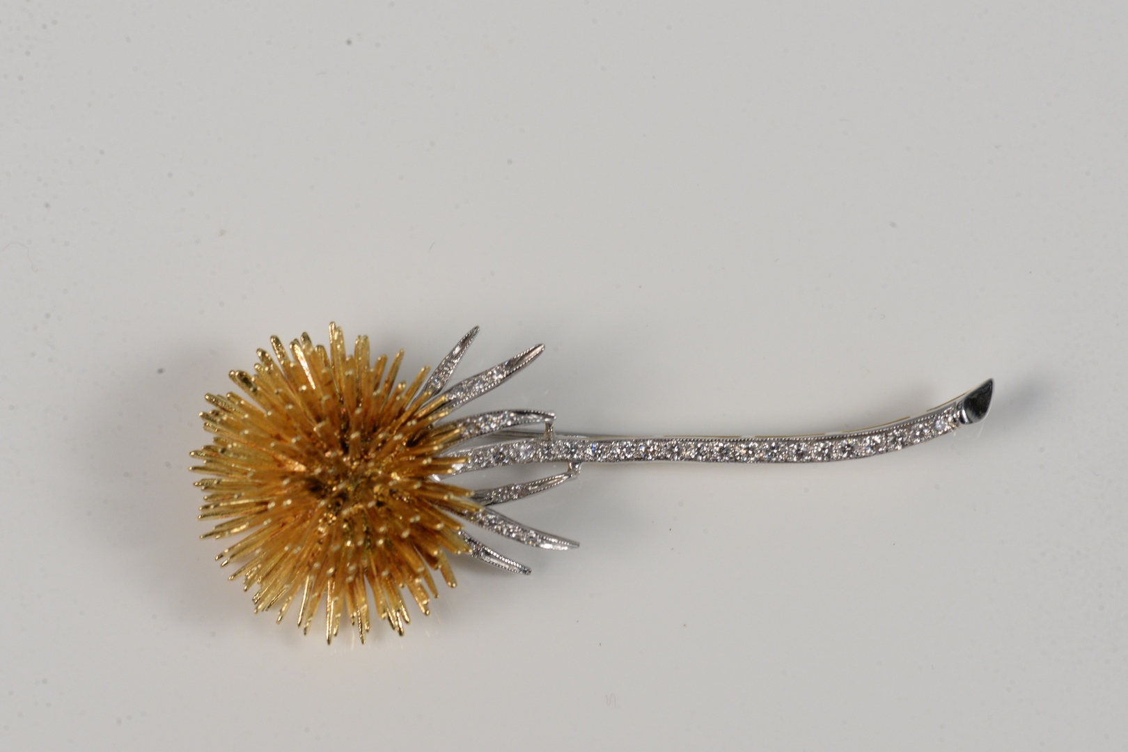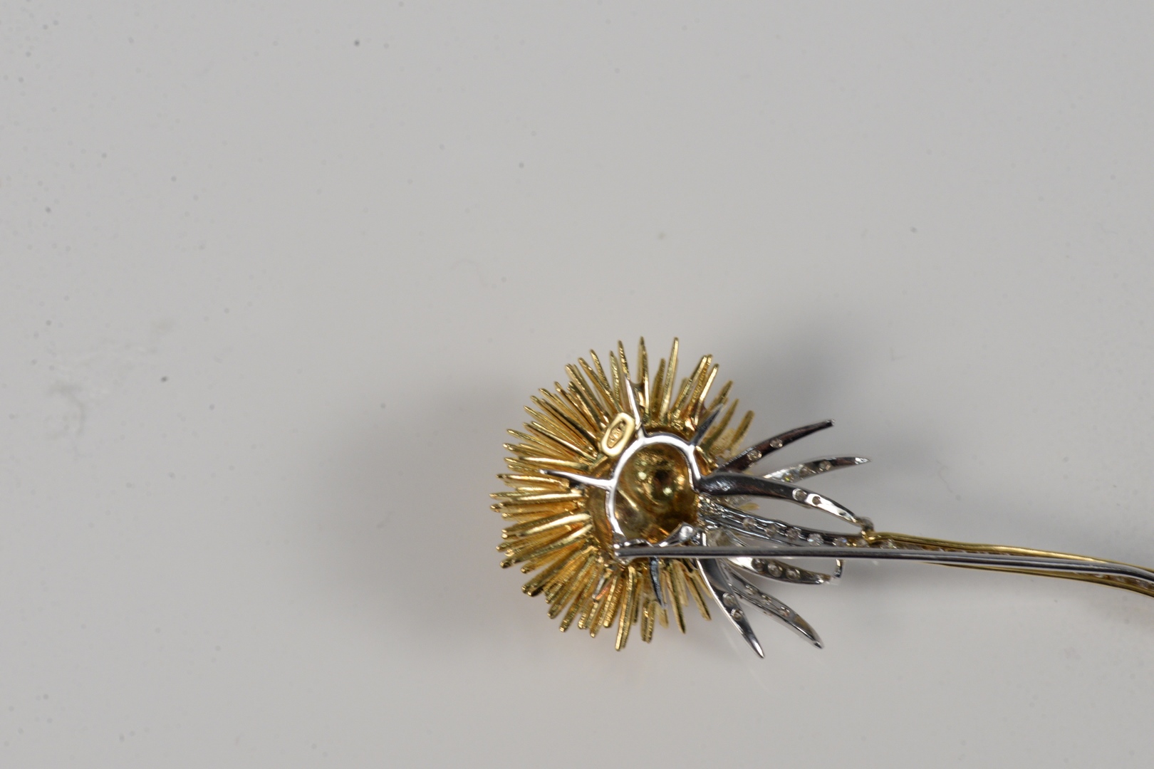 Lot 168: 18 Karat Yellow and White Gold Brooch in form of a flower, stem having inset diamonds height 2 3/4 inches 22.1 grams
