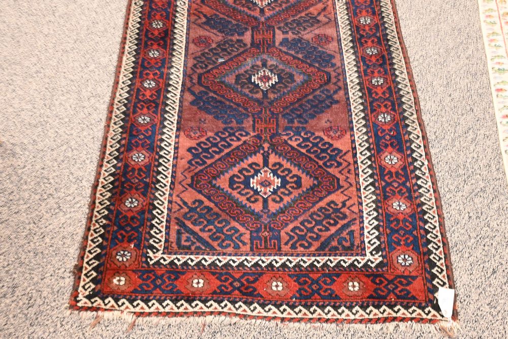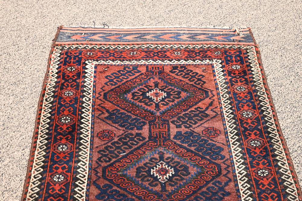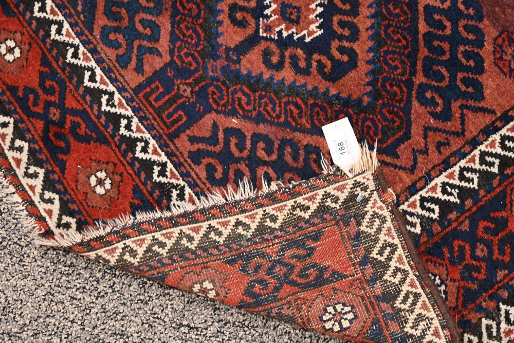Lot 168: Belouch Oriental Throw Rug 3′ x 5′ 4″ Provenance: Fifty Year Personal Collection of Clocks and American Antiques from Thomas Bailey, Manchester, Connecticut.