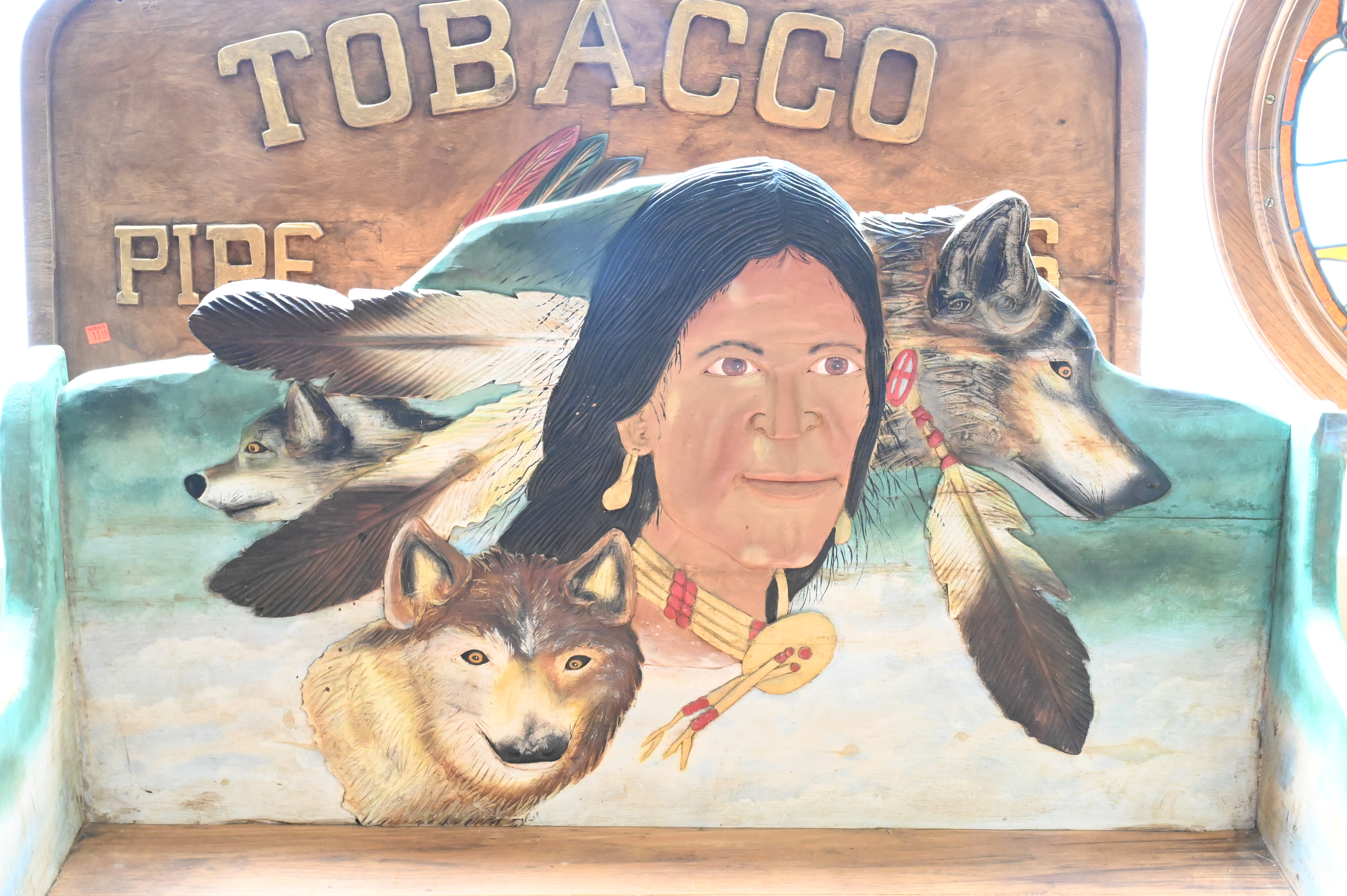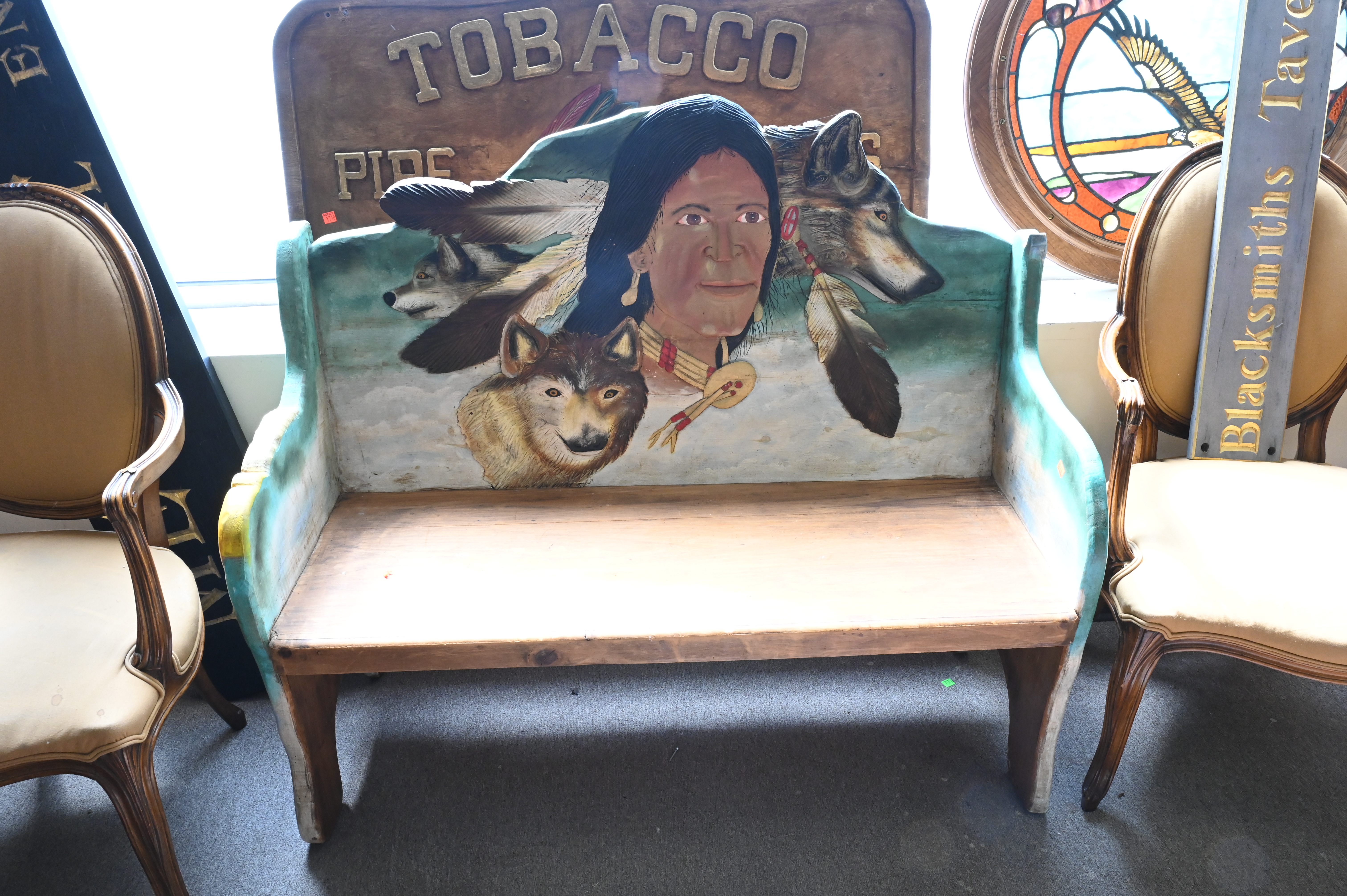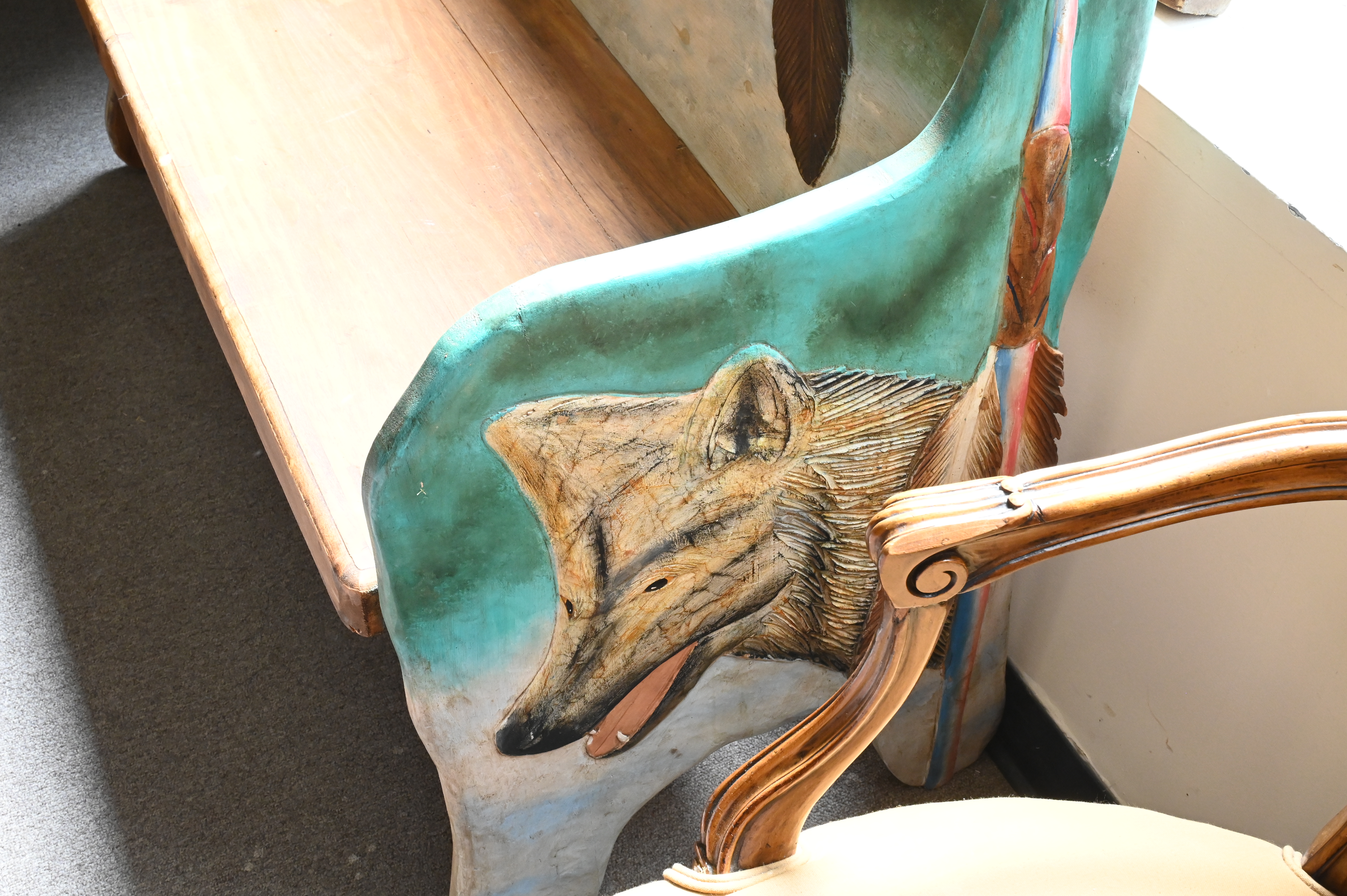 Carved and Painted Bench, with American Indian and wolves, height 40 inches, width 43 inches.