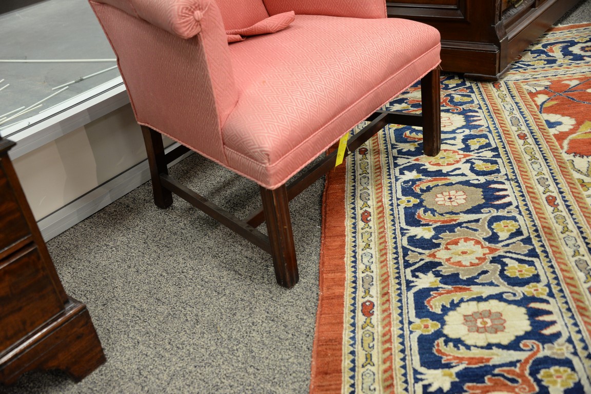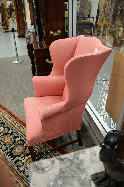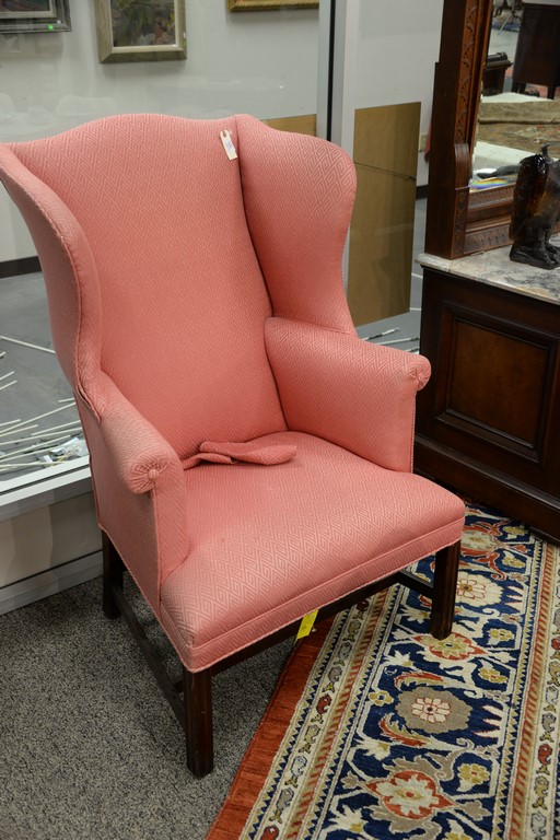 Lot 168: Chippendale mahogany upholstered wing chair set on molded square front legs with stretcher base, circa 1780. rear legs ended