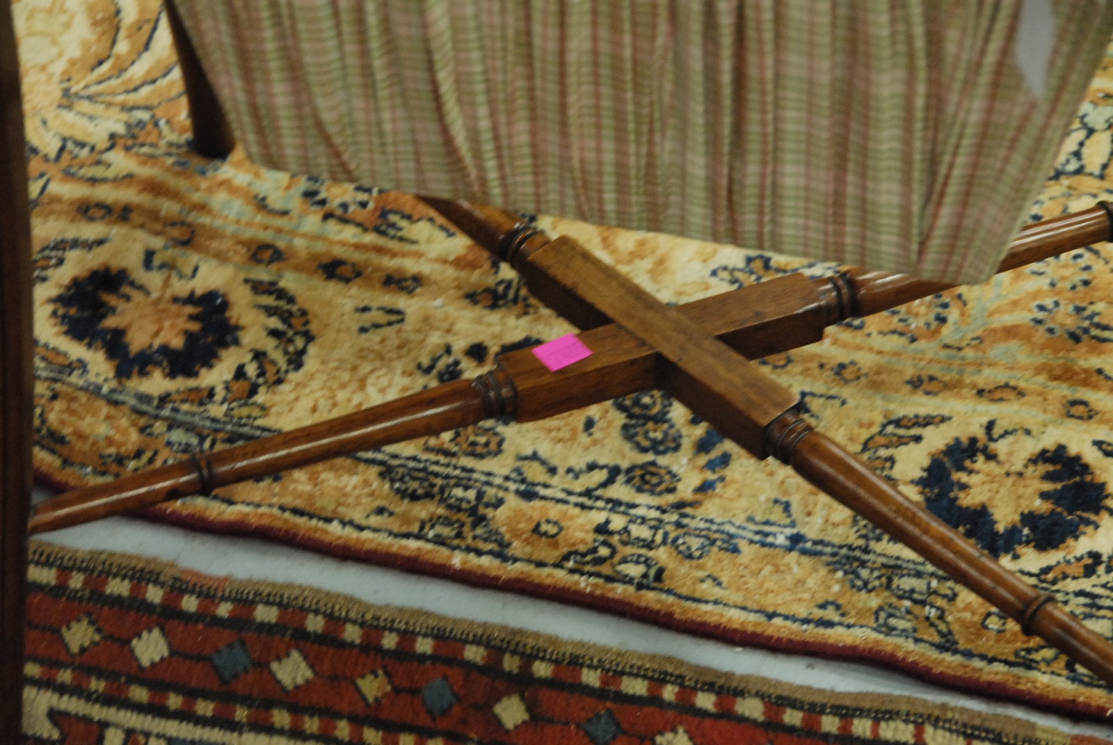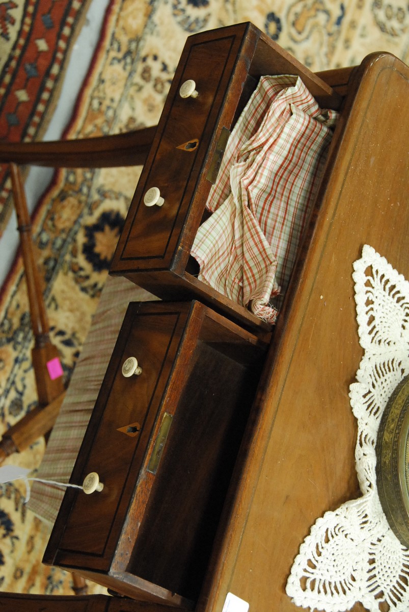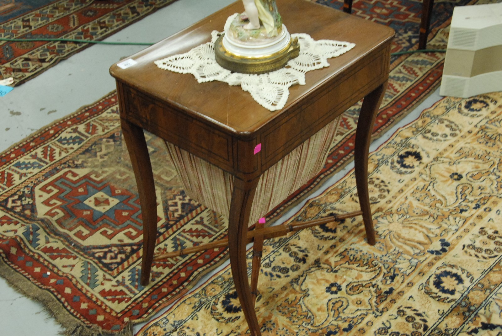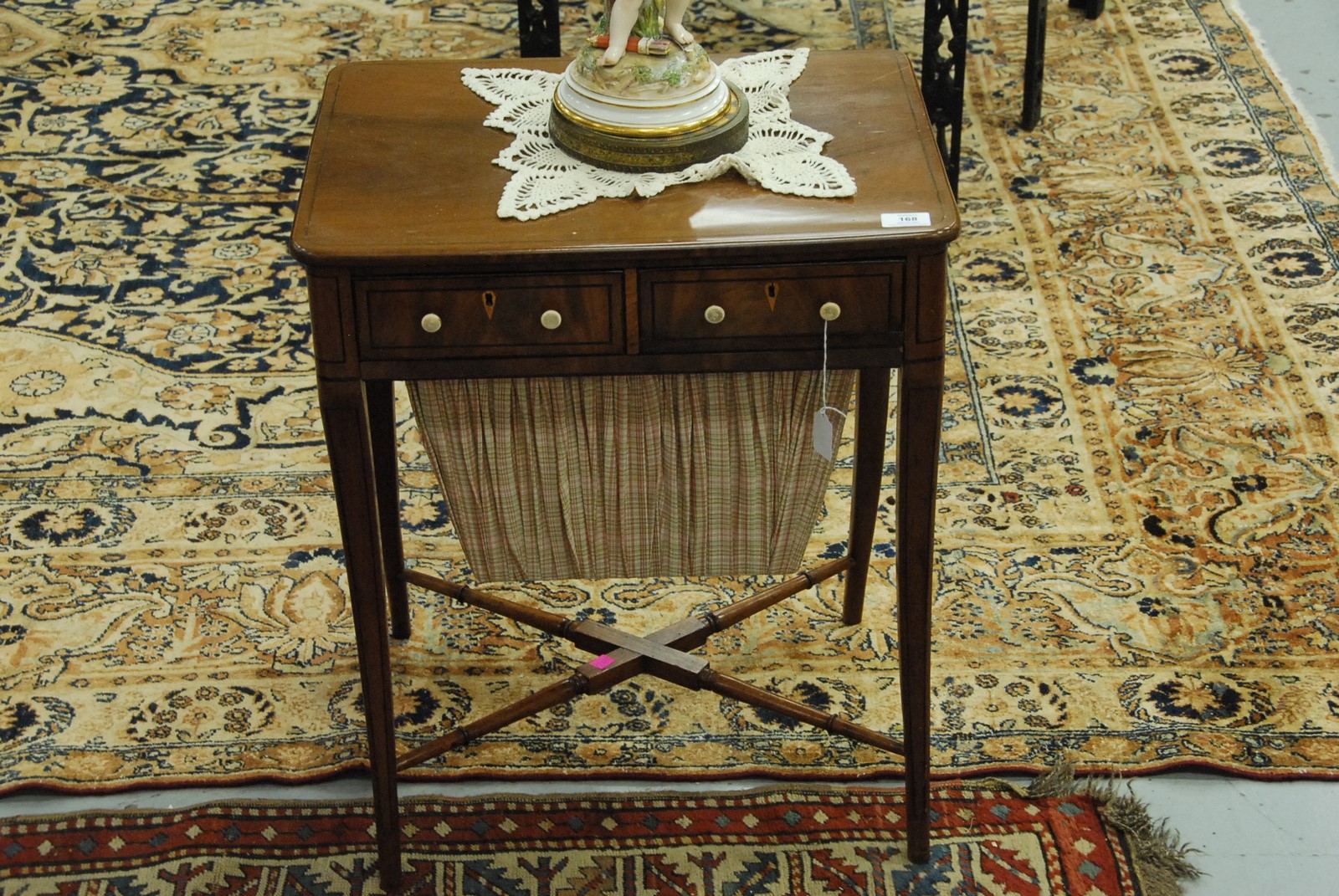 Lot 168: Continental sewing table with two short drawers over bag drawer on saber style legs with stretcher base, 19th century. ht. 35 1/2 in. top: 16 x 21 1/4