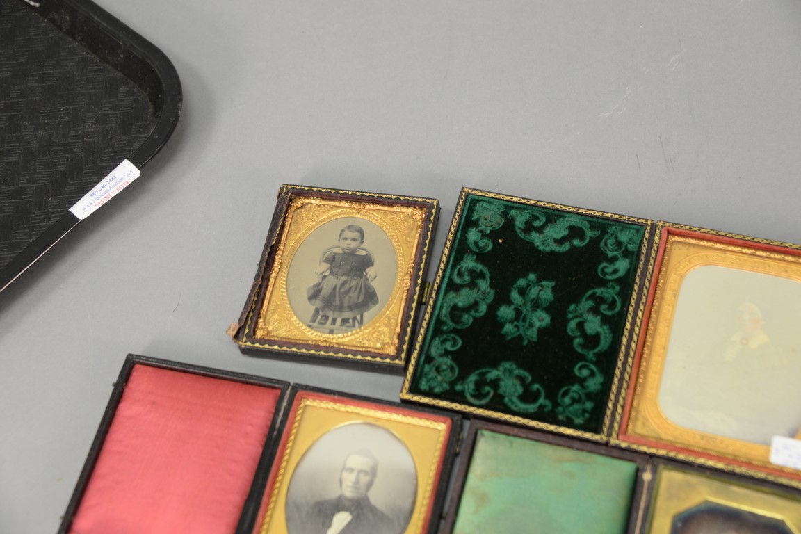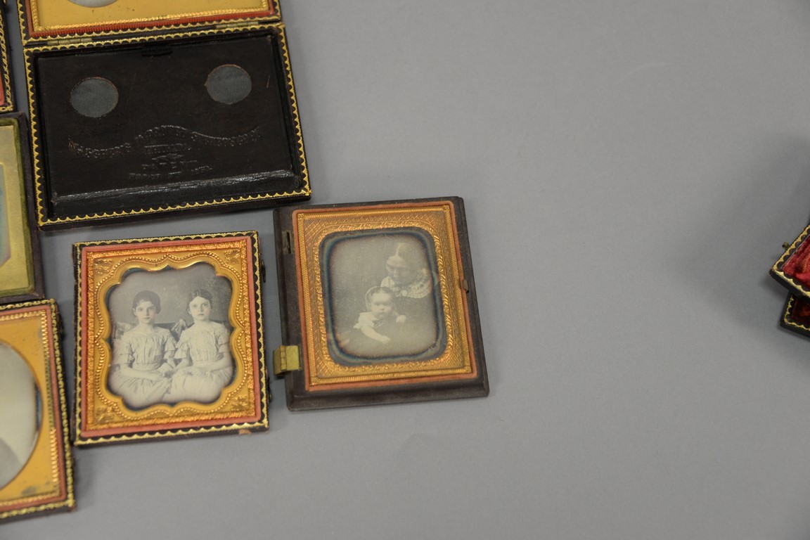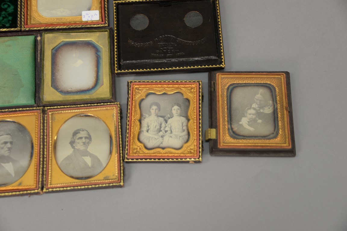 Eleven piece lot with ten daguerreotypes in eight cases, plus one ambrotype. 3 1/4 x 2 3/4 to 4 1/4 x 3 1/4