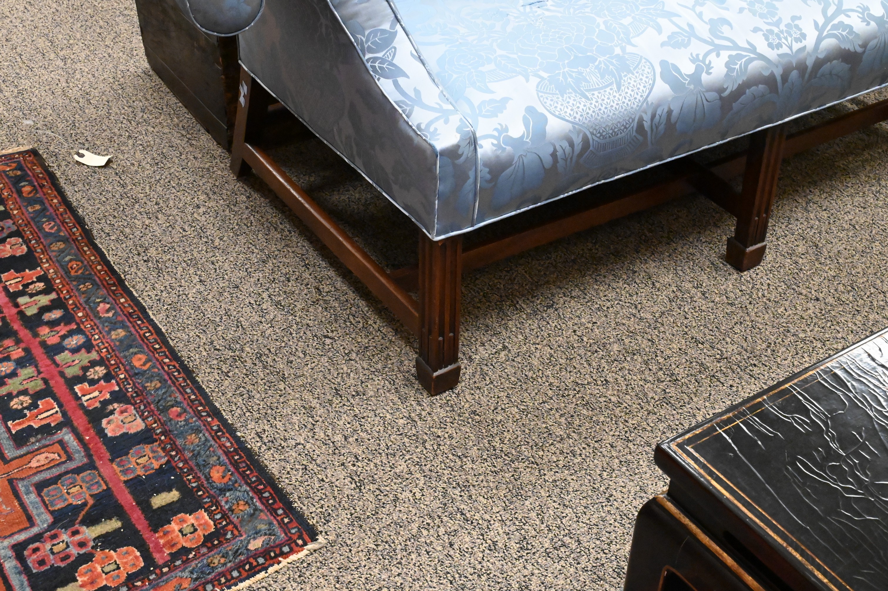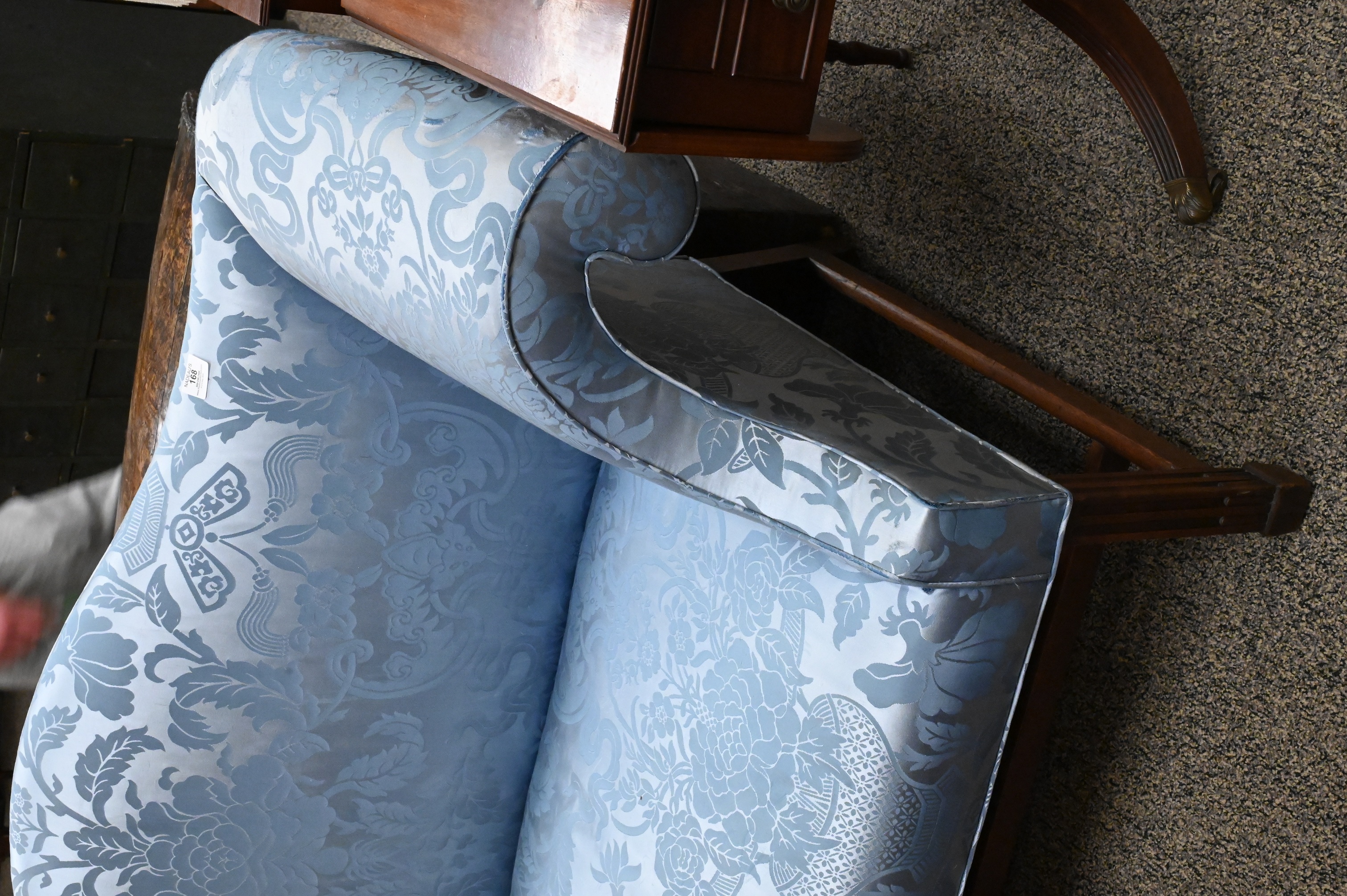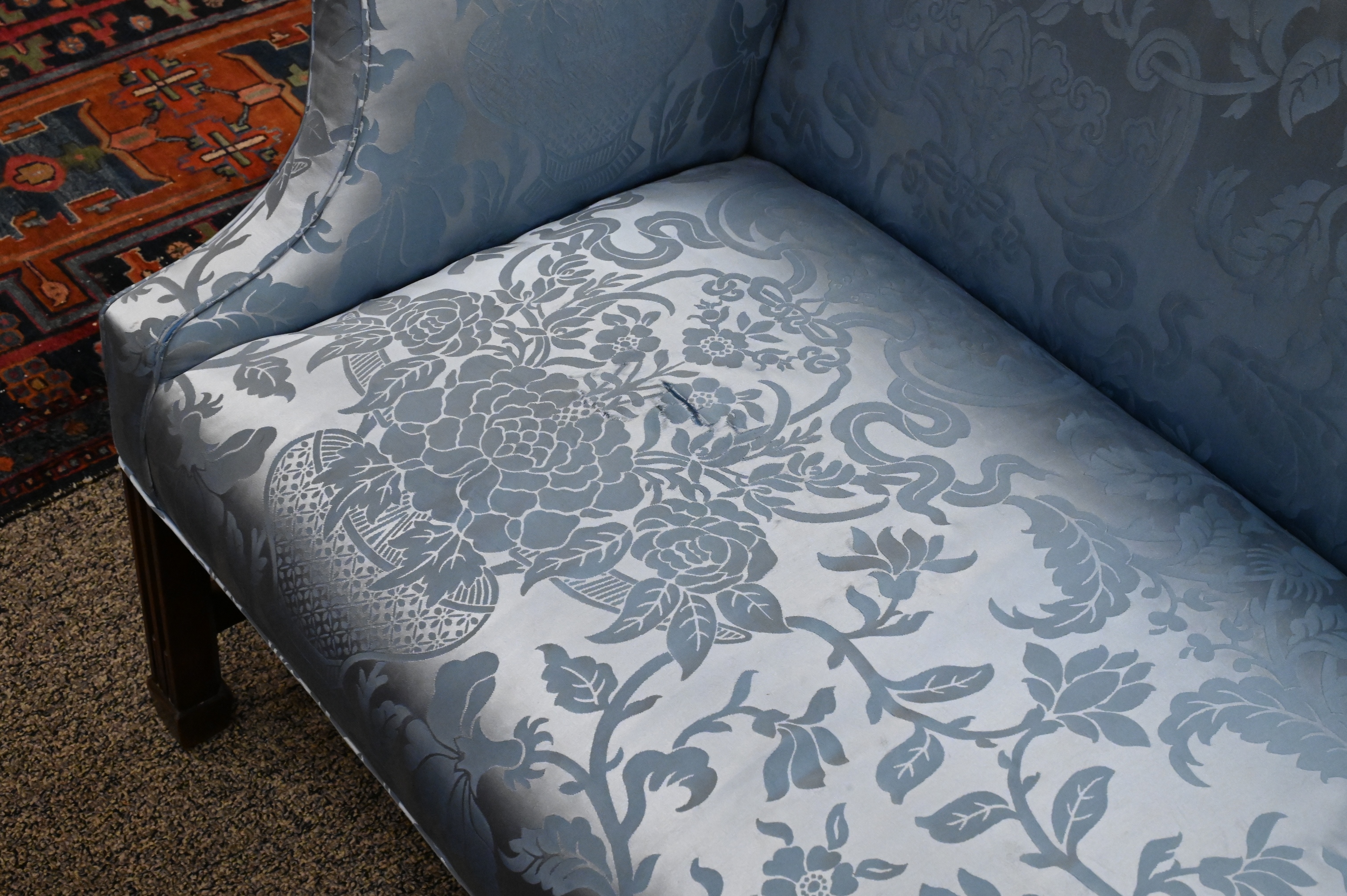 in light blue floral upholstery, mahogany frame, slight tears to upholstery