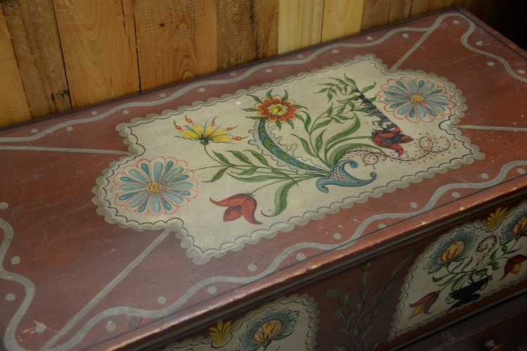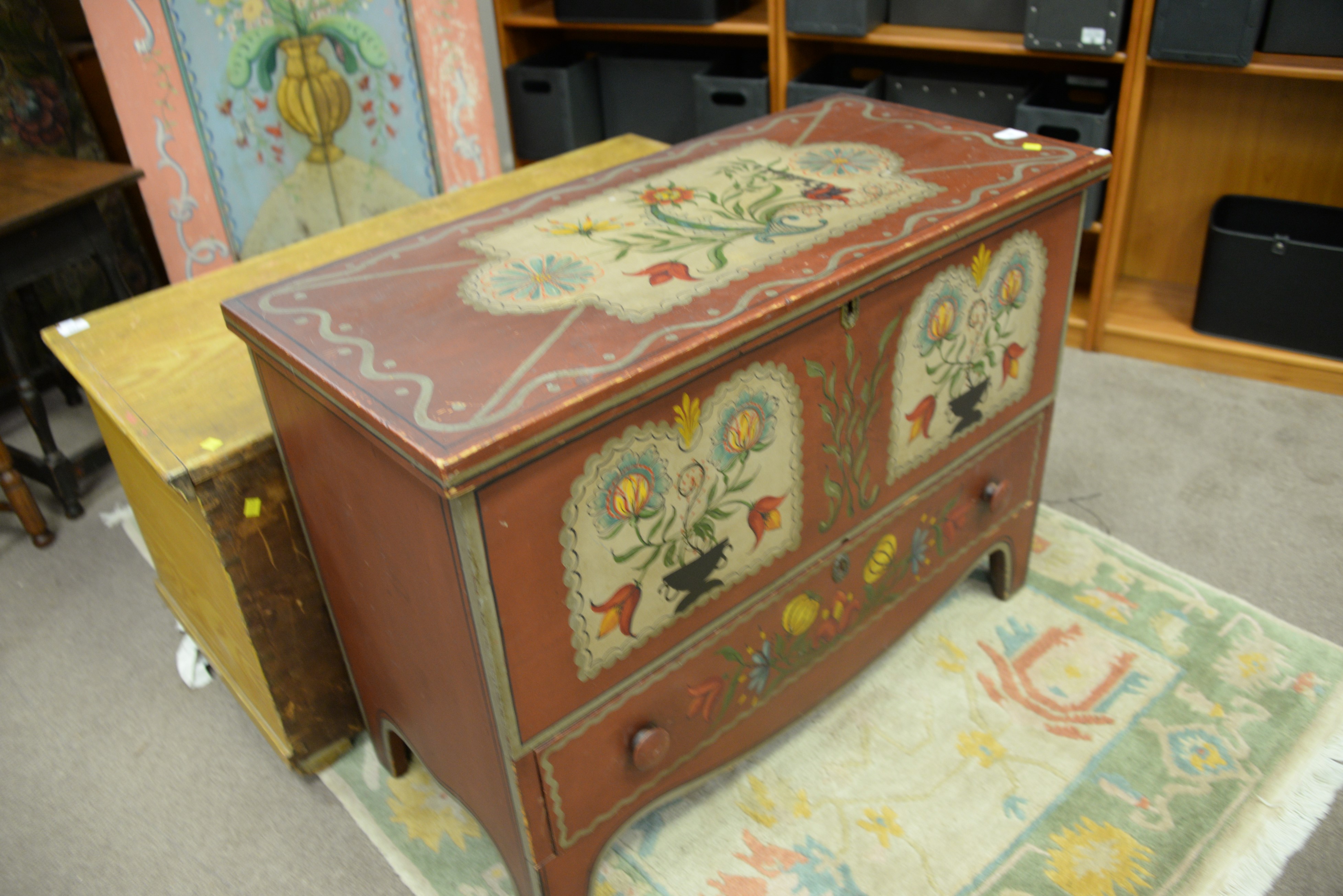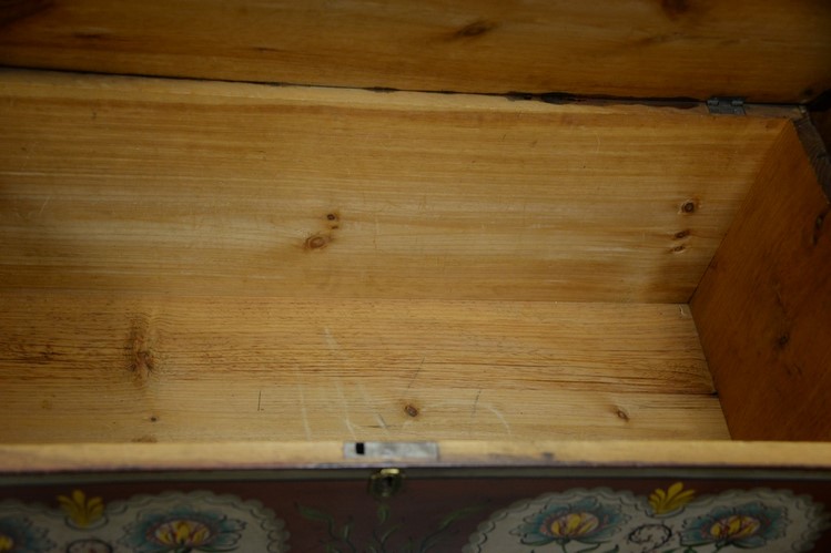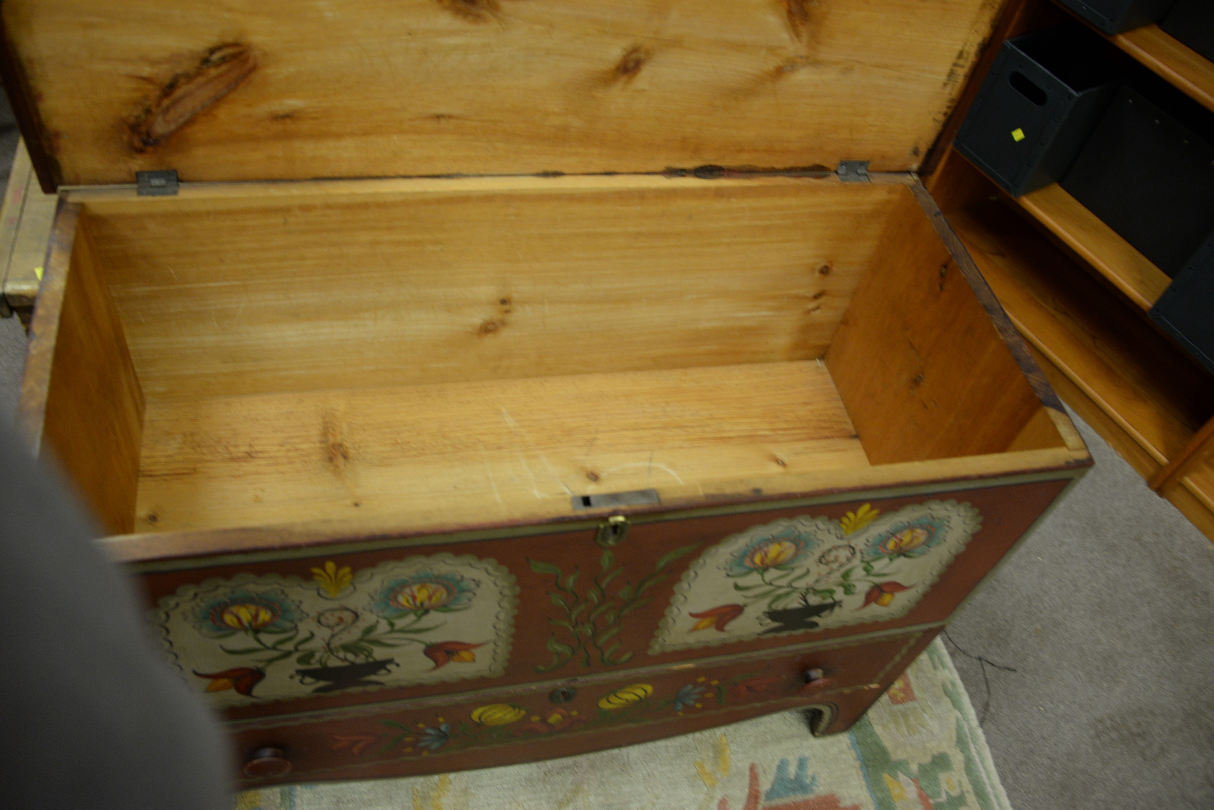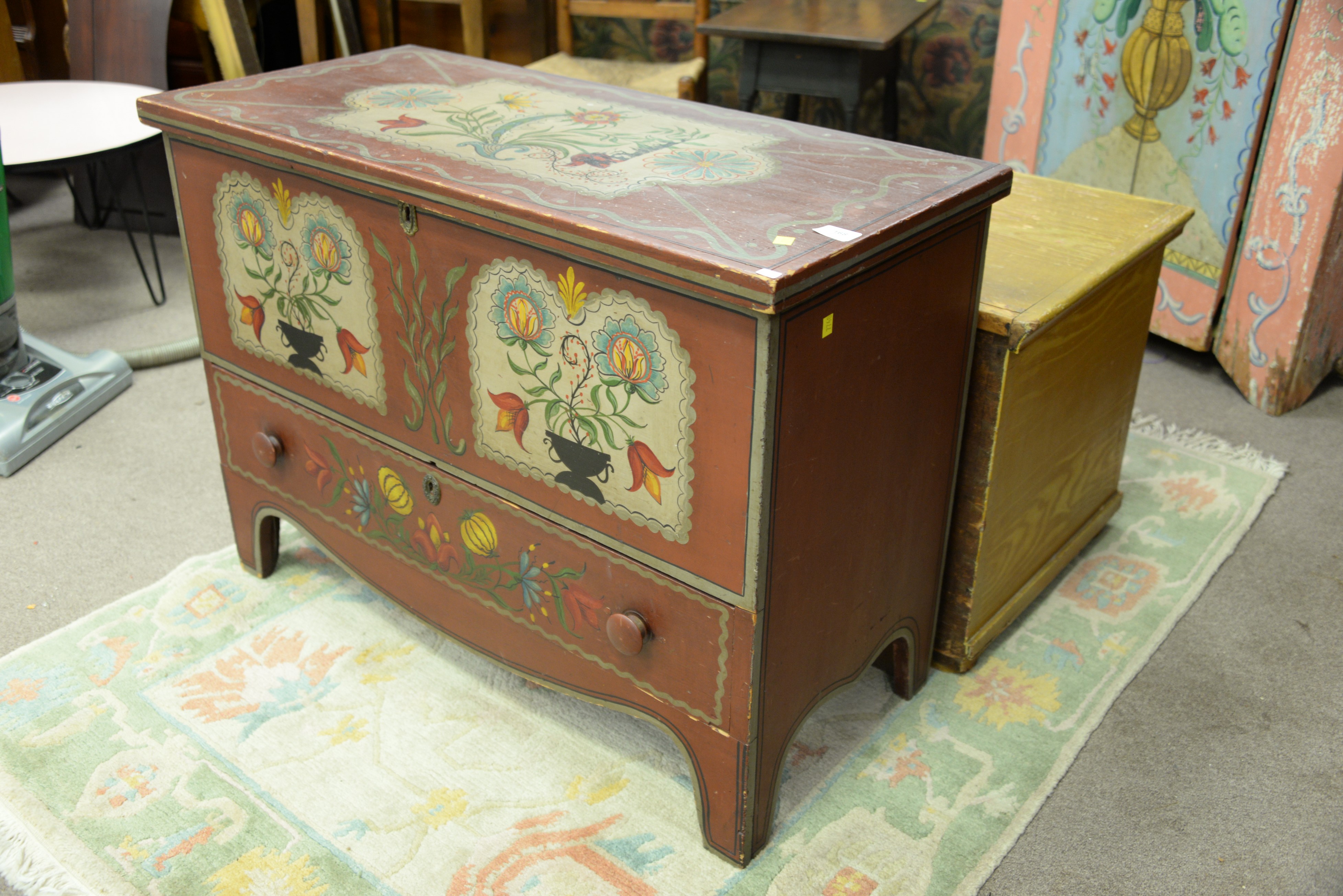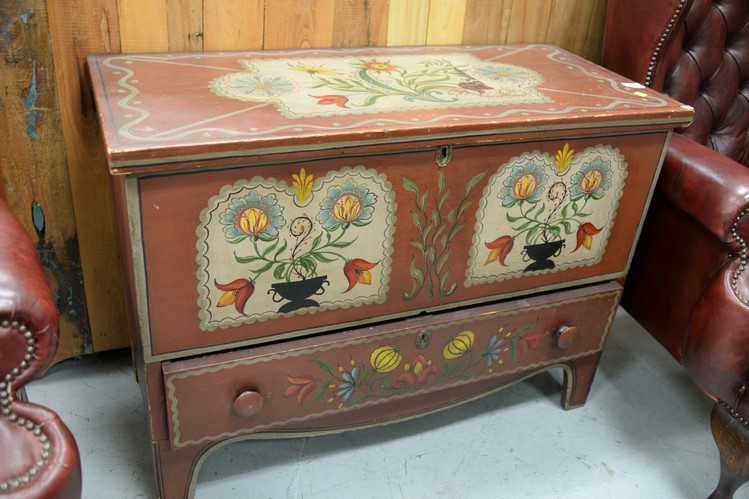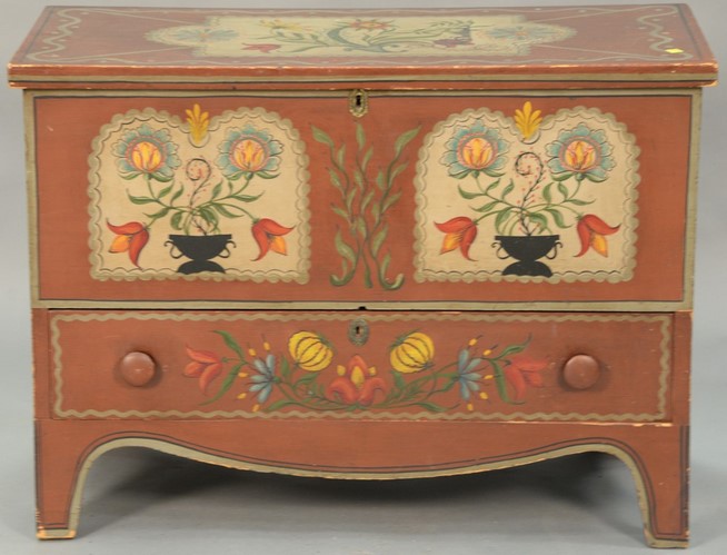 Lot 168: Federal lift top chest with one drawer in old paint not original, circa 1800. ht. 28 in. wd. 38 in. dp. 18 in.