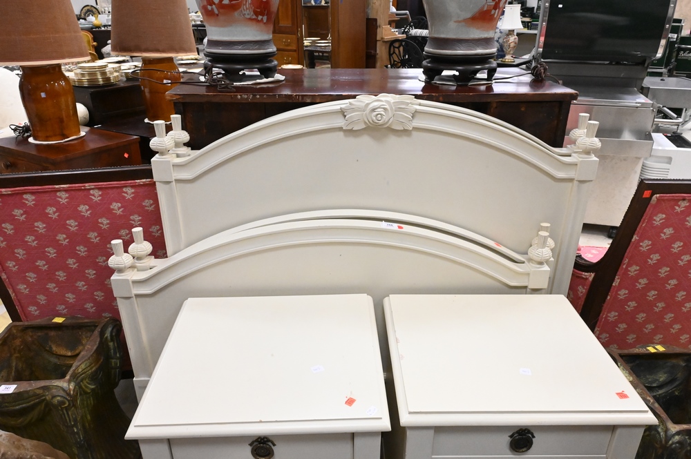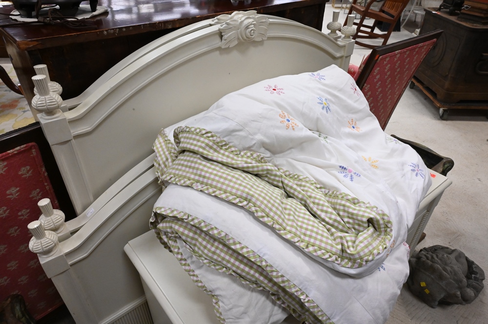 Lot 168: Four Piece Lot, to include a pair of custom twin beds with bedding along with a pair of custom night stands in cream paint, nightstands having one drawer over one door each, bed height 45 inches.