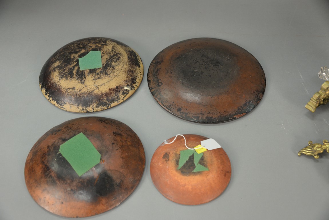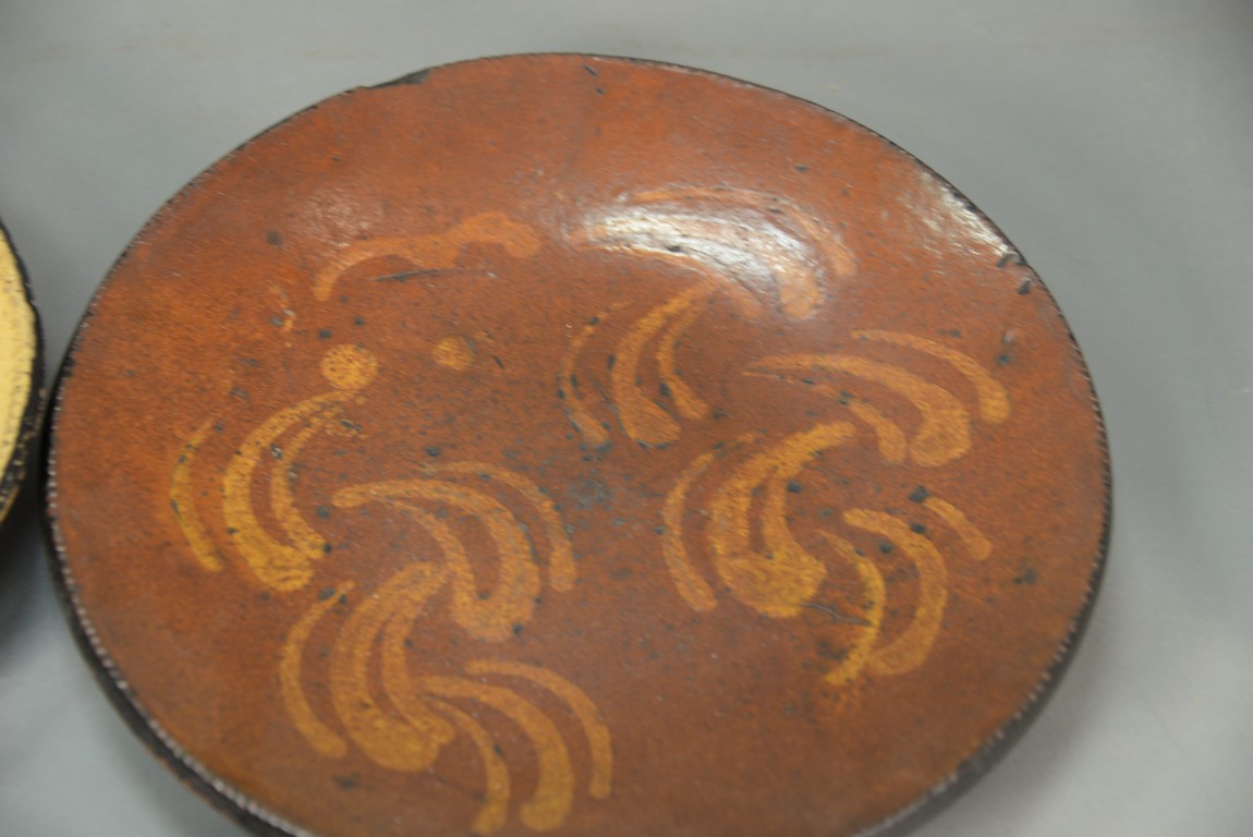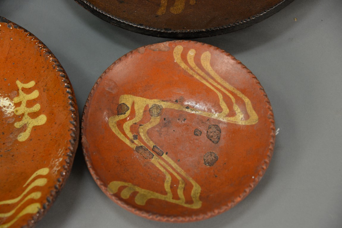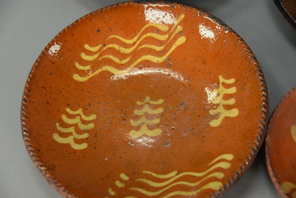 Four redware deep plates, three with slip decoration. dia. 6 in. to dia. 10 3/4 in.