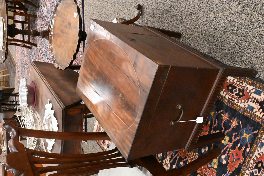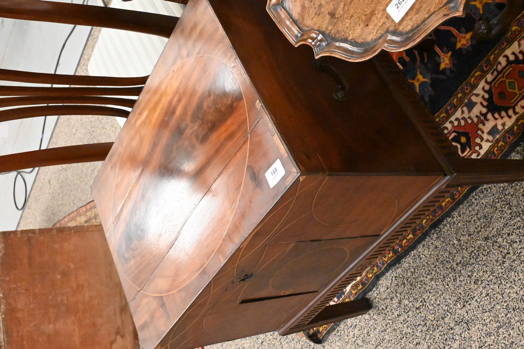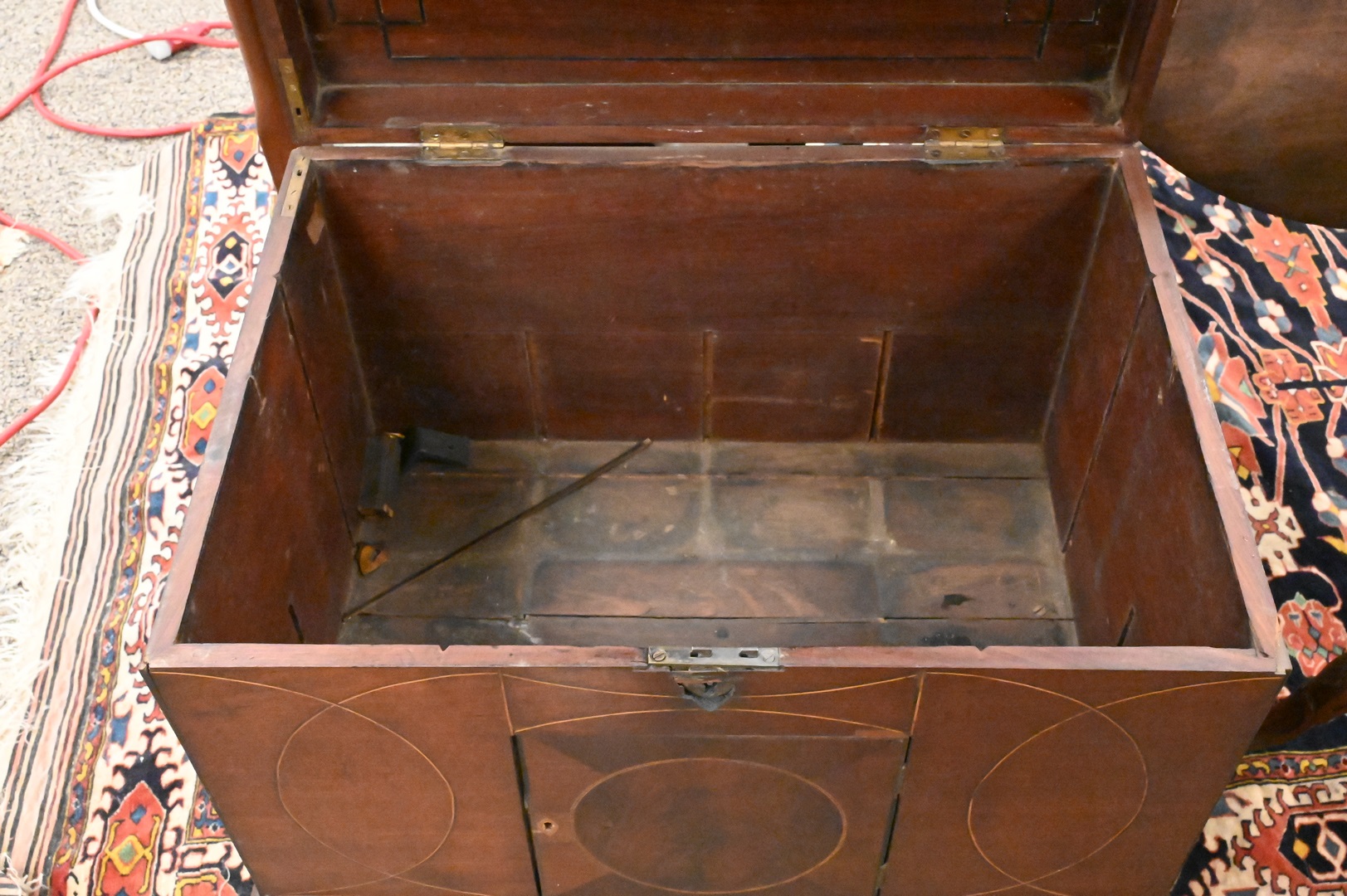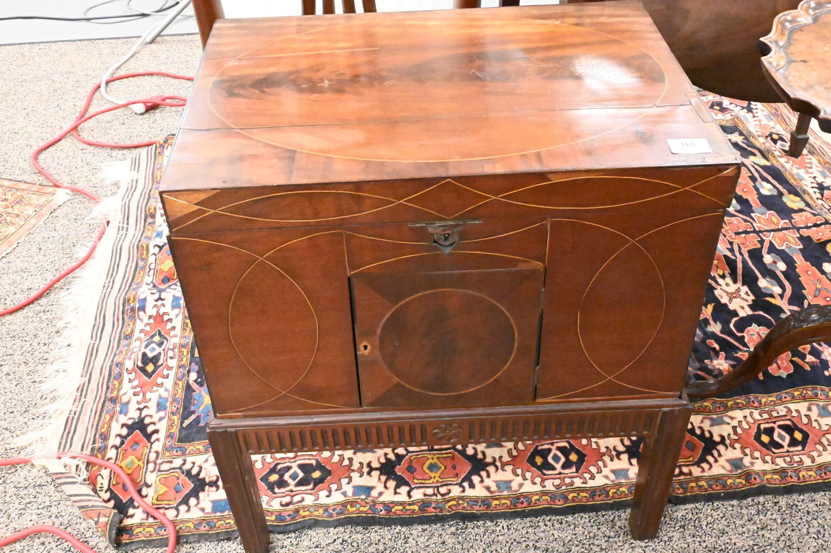 George III Cellarette, having inlaid top and front, on base with molded legs, circa 1800, several chips, no interior separators, height 24 inches, top 16″ x 22″., Provenance: Estate of Cyril H. Moore Jr, Kent, Connecticut.
