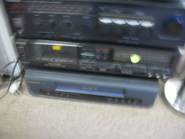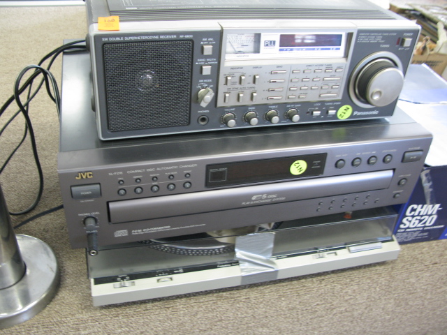 Group of electronic equipment to include a Panasonic shortwave double super heterdyne receiver, five disc player, turntable, VCR, Kenwood receiver and miscellaneous equipment.