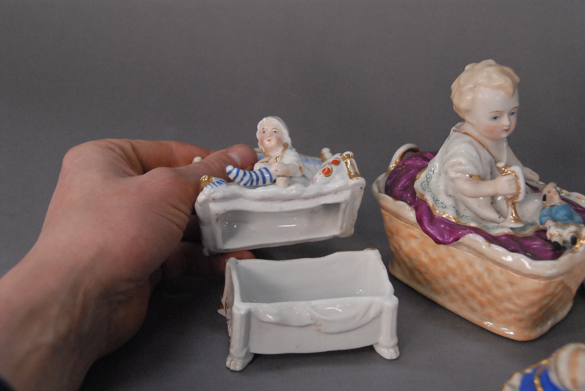 Group of five porcelain boxes, two figural of babies, two are pieces of furniture, and one of a young girl putting on her socks, smallest: ht. 2in. lg. 4 1/2in. largest: ht. 5in. lg. 4 1/2in.