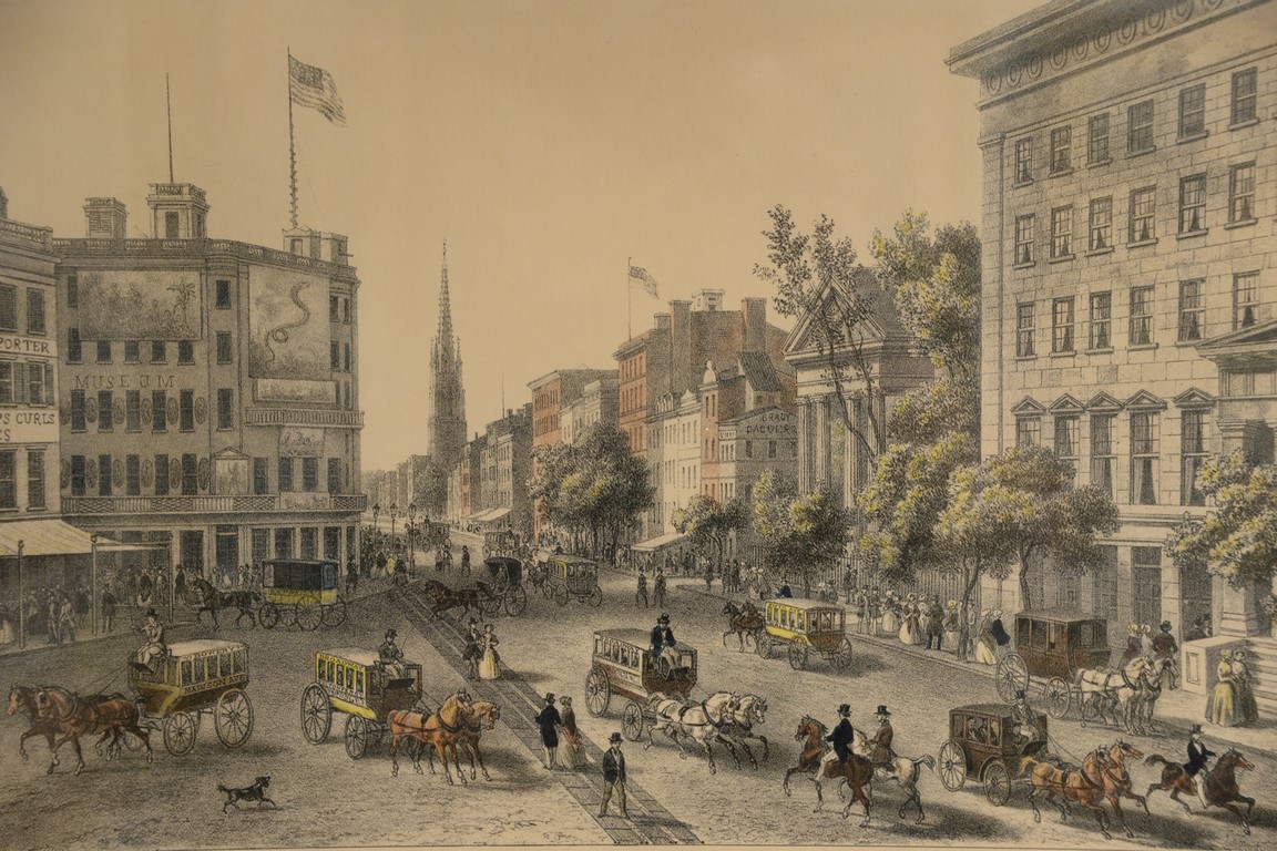 Isadore Laurent Deroy 1797-1886, hand colored lithograph, Drawn from Nature by Aug Kollner, Broadway, N.Y., 1848, Cityscape of New York with Barnum’s American Museum flying American Flag and the steeple of Trinity Church in the distance, sight size 16 1/2 x 21 1/4 Provenance: Property from Credit Suisse’s Americana Collection