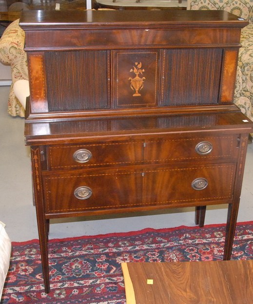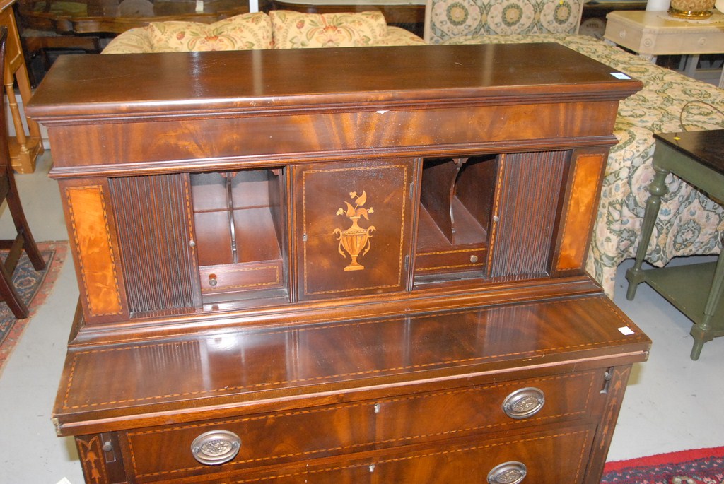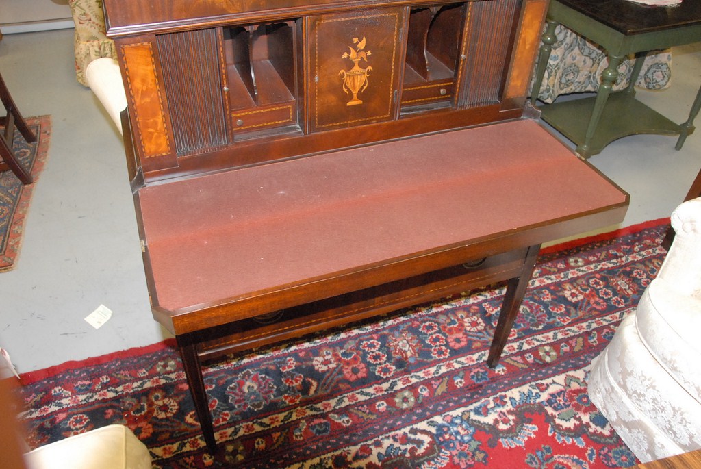 Kaplan custom mahogany tambour desk with two drawers, ht. 46in.