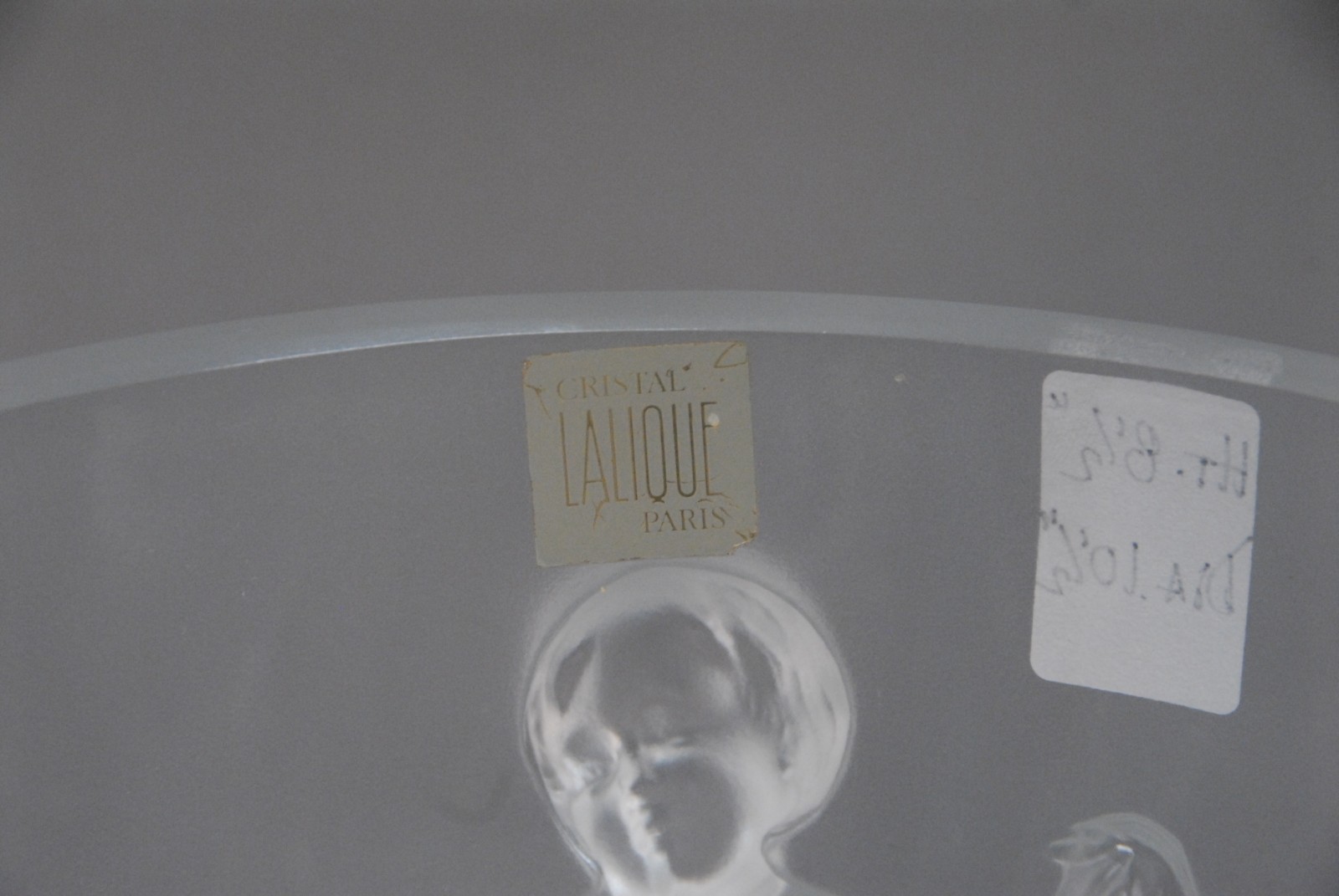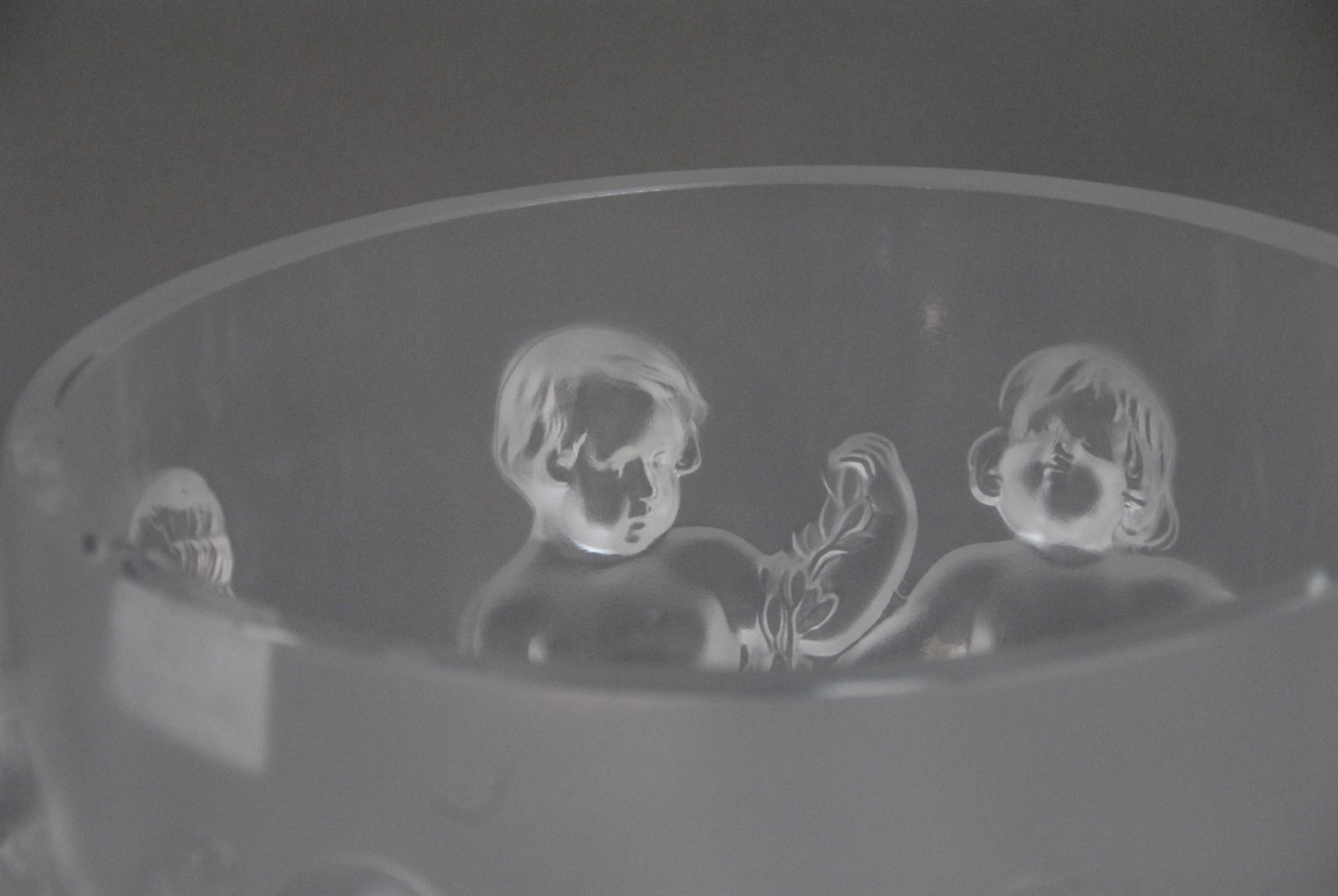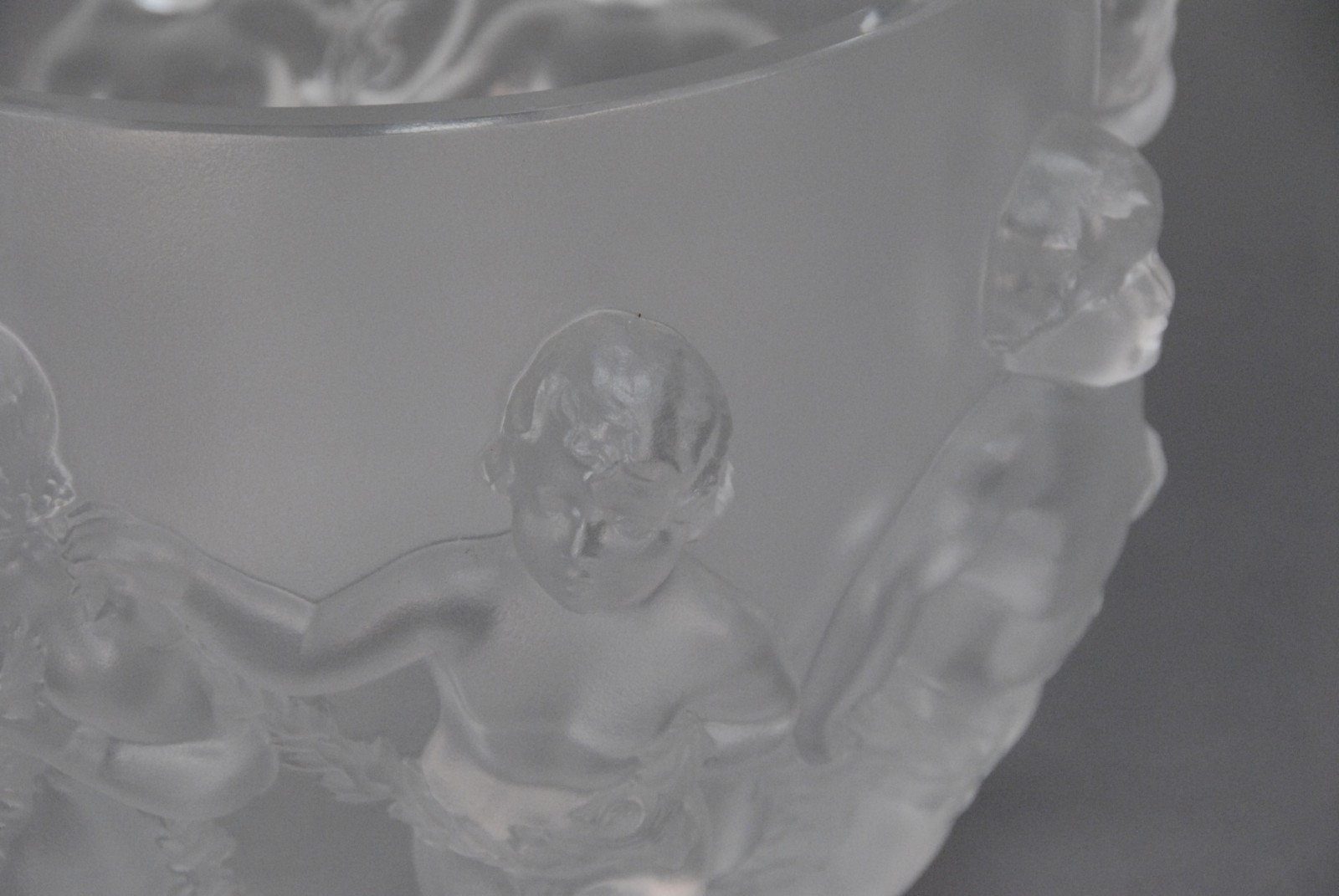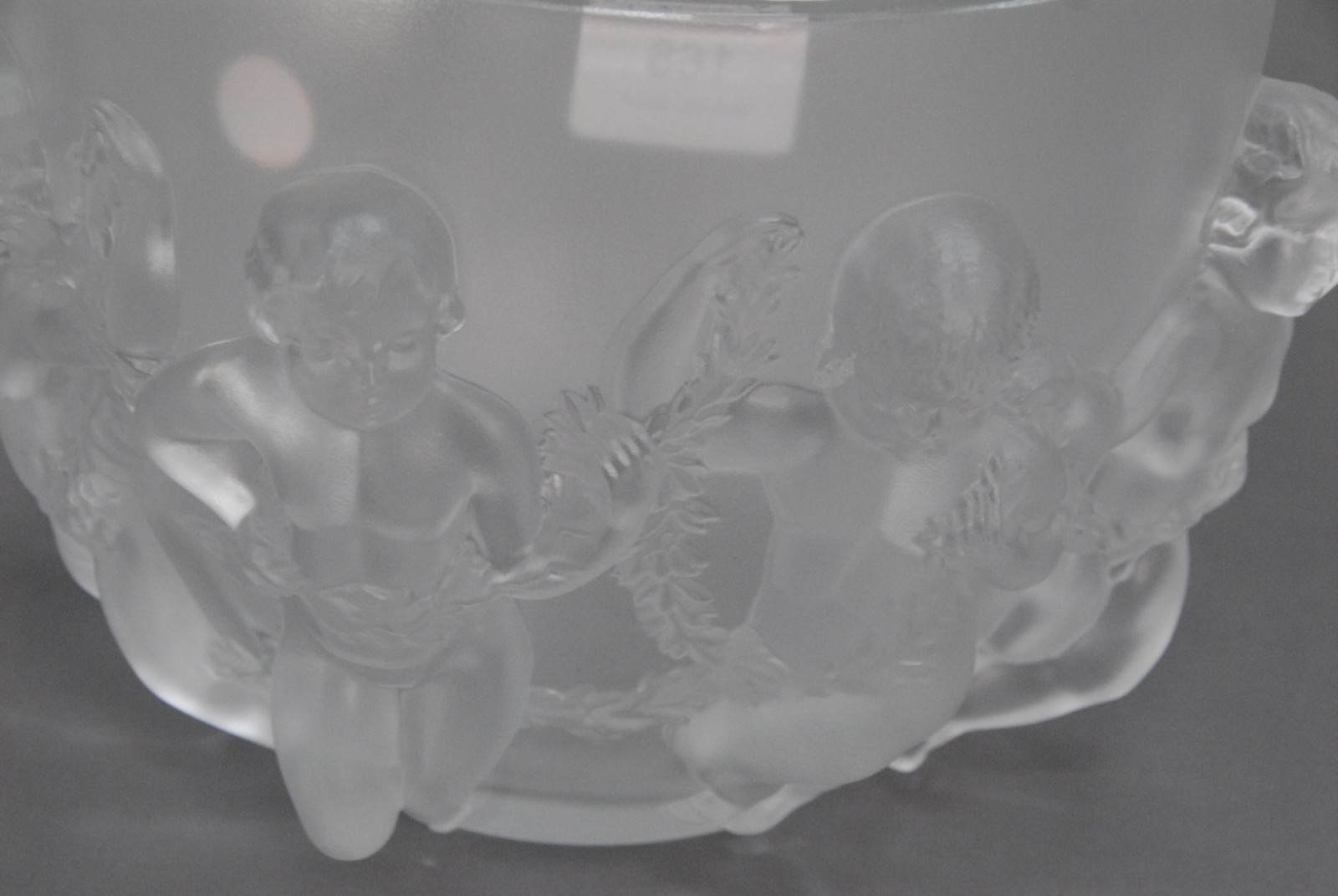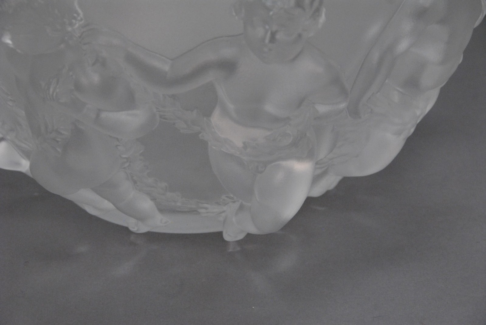 Lalique frosted bowl with eight three dimensional puttis signed Lalique France in script.