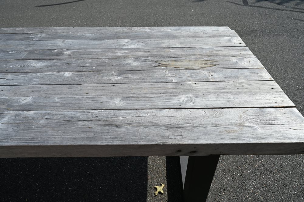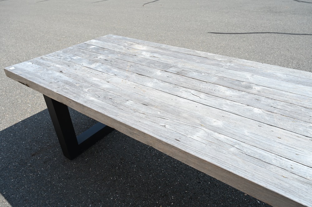 Lot 168: Large Teak Outdoor Patio Table, having slab wood top, height 32 inches, top 40″ x 99″.