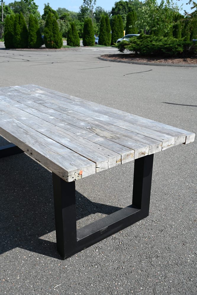 Large Teak Outdoor Patio Table, having slab wood top, height 32 inches, top 40″ x 99″.