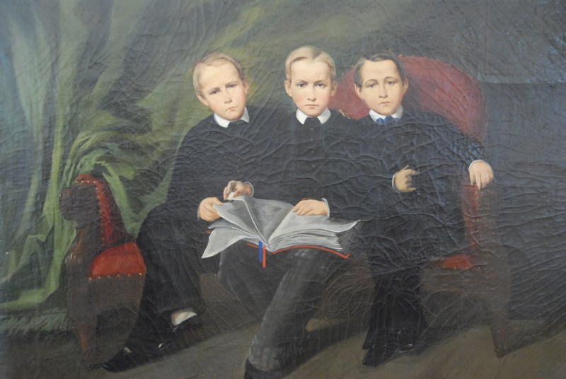 Lot 168: Oil canvas painting of three boys sitting with book signed lower right indistinctly, 19th century, restretched and relined, 26 x 33.