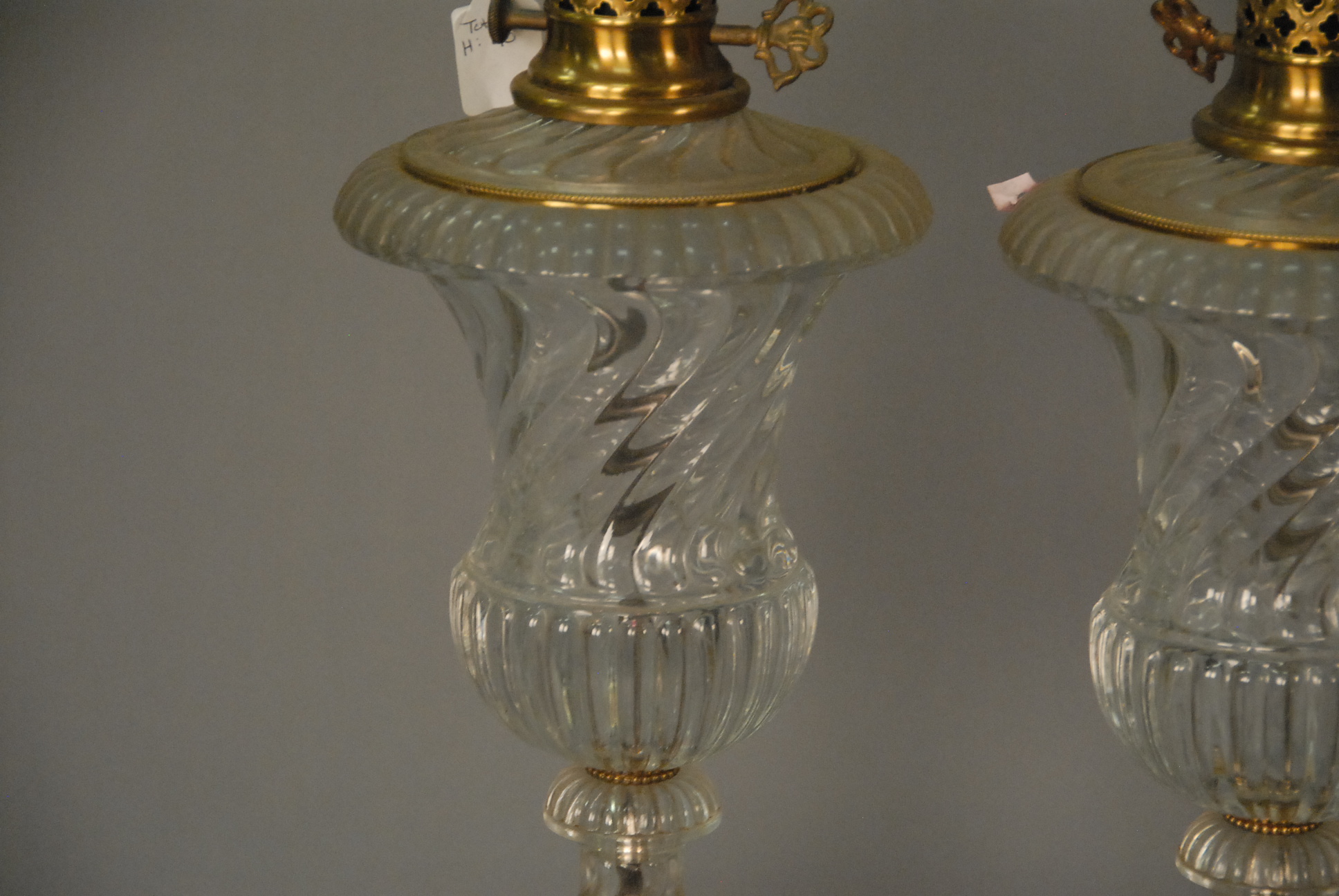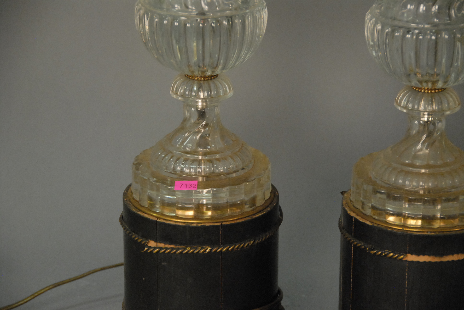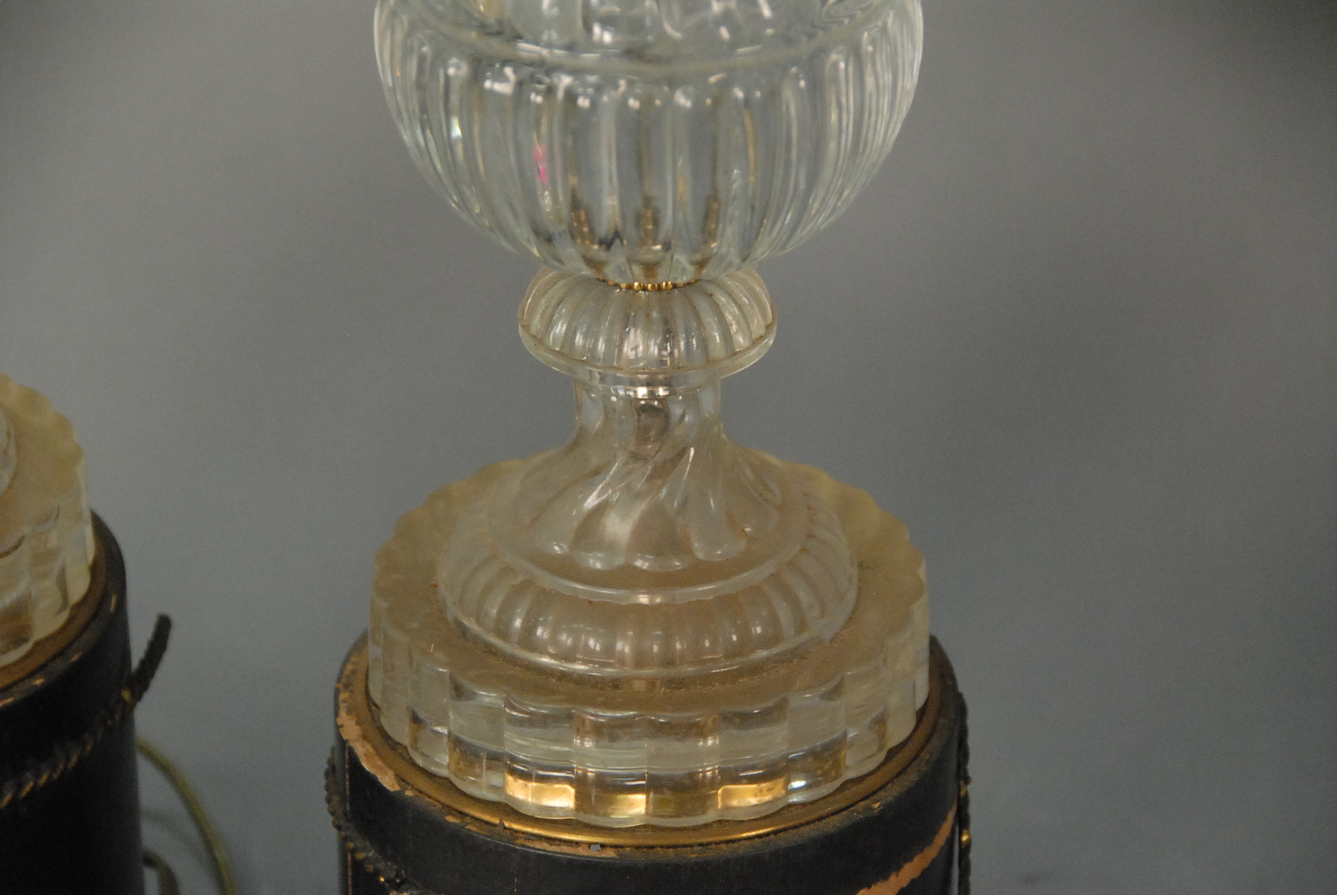 Lot 168: Pair of Baccarat molded glass urn form lamps mounted on wood base. ht. 39 1/2in.