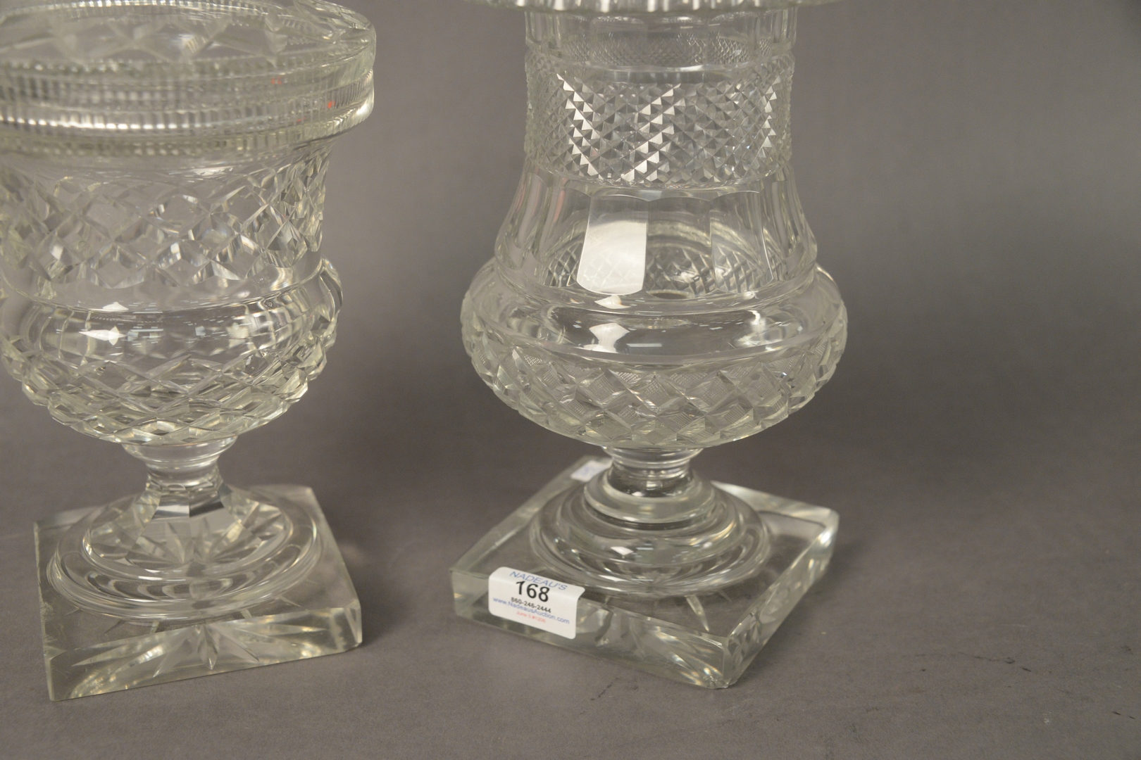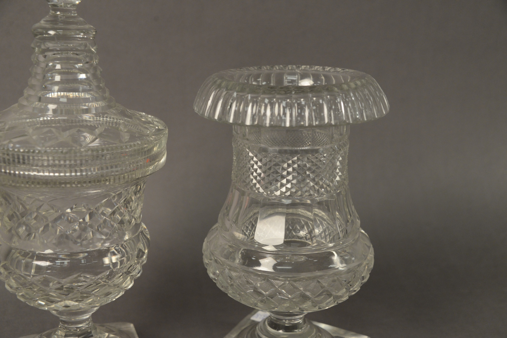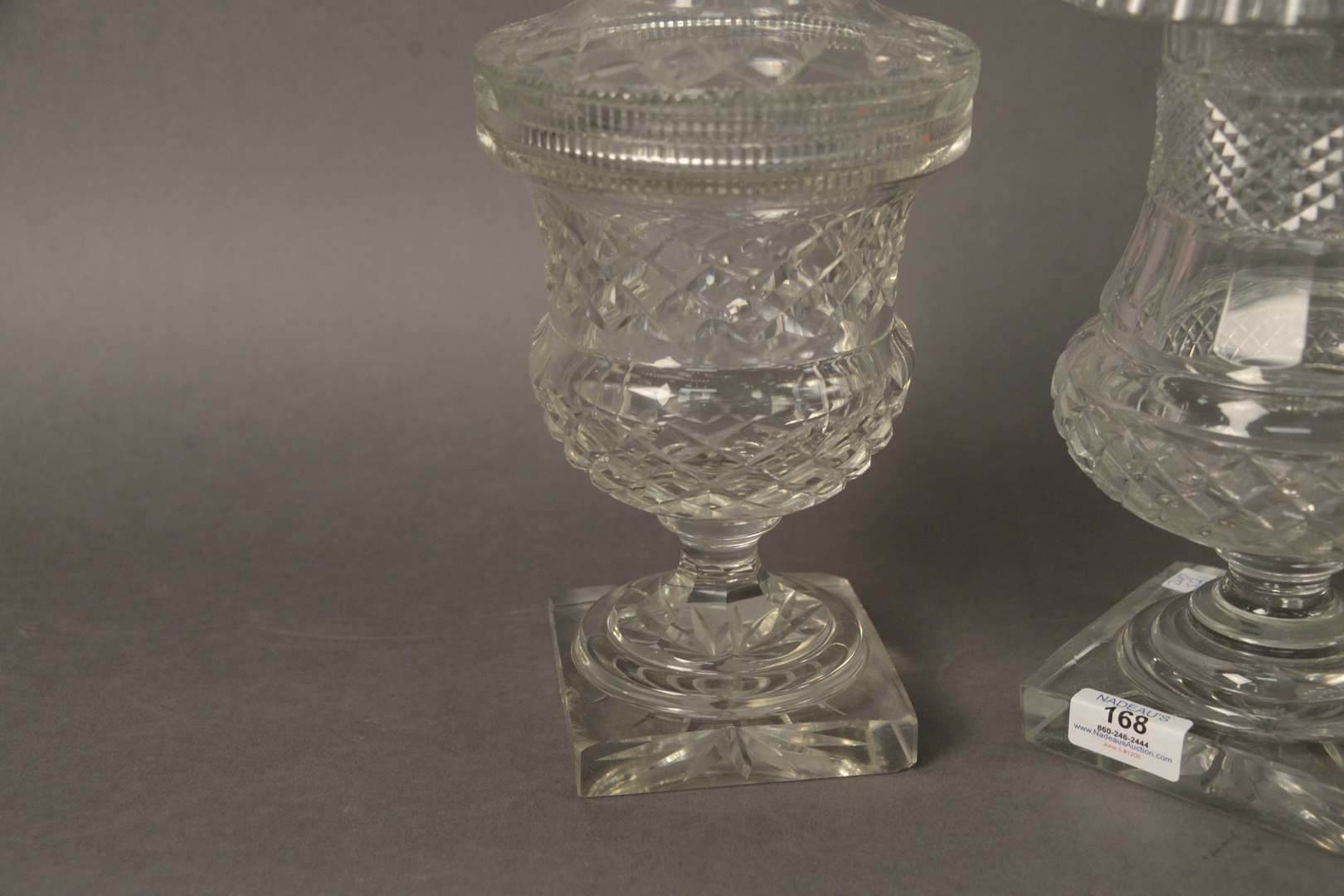 Lot 168: Pair of Crystal Sweetmeat Stands, one having cover height 14 inches, one open height 10 3/4 inches, diamond pattern on square bases,