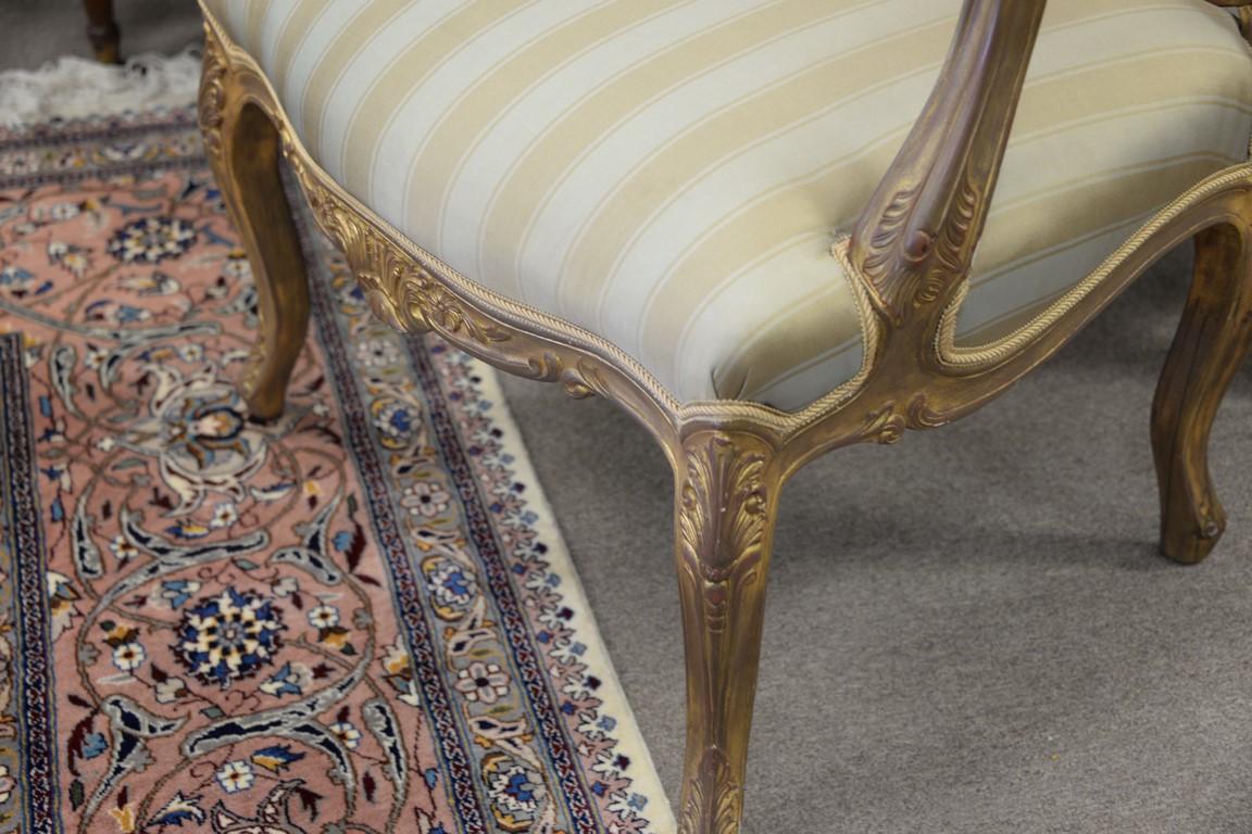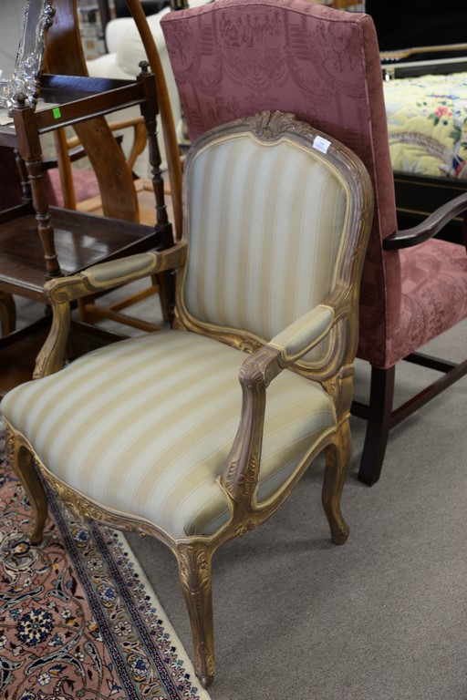 Pair of Louis XV style Contemporary armchairs with mixed silk upholstery.