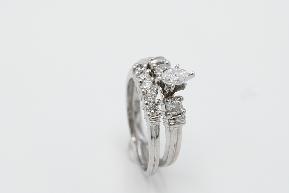Lot 168: Platinum Two Piece Bridal Set, to include engagement ring with center marquise diamond, 3.3 x 6 millimeters, flanked by diamonds alo…