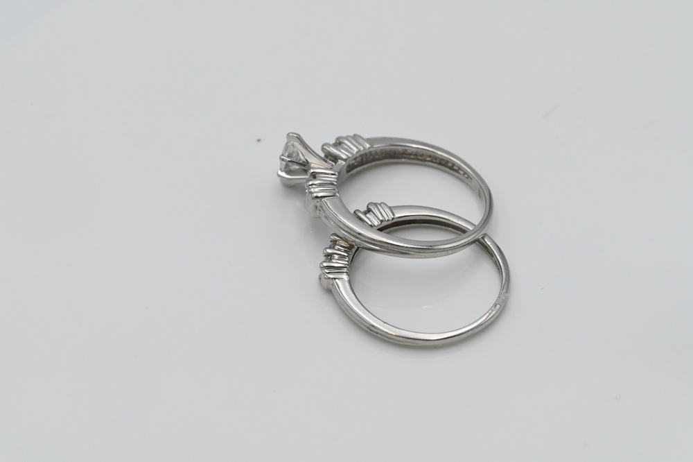 Platinum Two Piece Bridal Set, to include engagement ring with center marquise diamond, 3.3 x 6 millimeters, flanked by diamonds along with a band set with five diamonds, size 6 3/4, new $4,000.