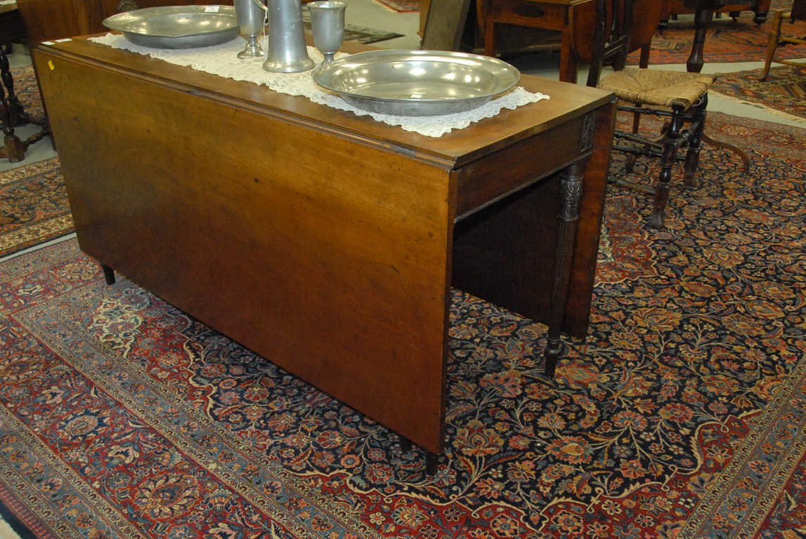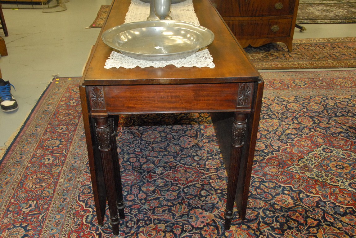 Lot 168: Sheraton mahogany drop leaf table with six feather carved and fluted legs. ht. 24in. open: 47 x 56 closed: 22 x 56 Provenanc…..