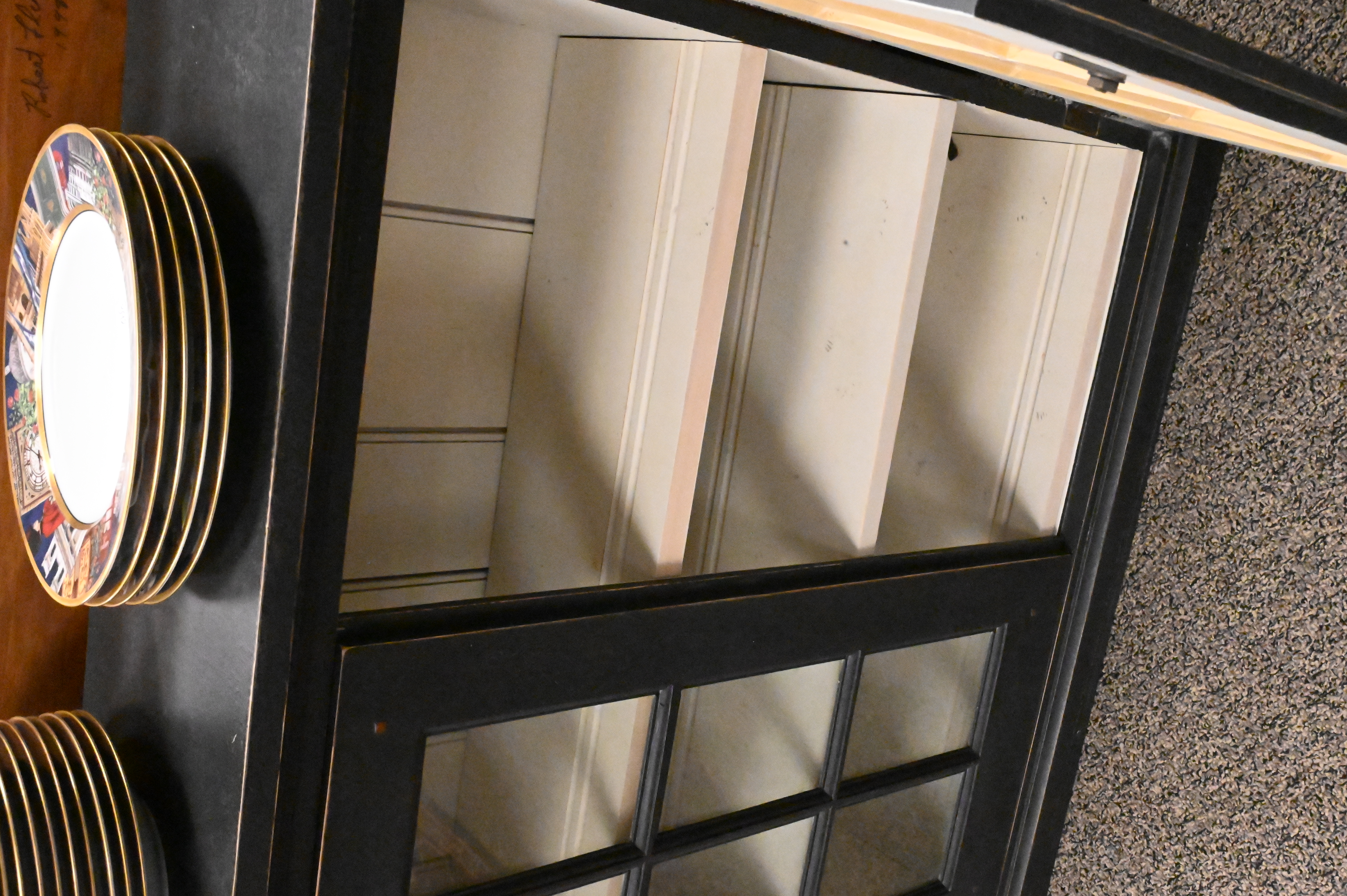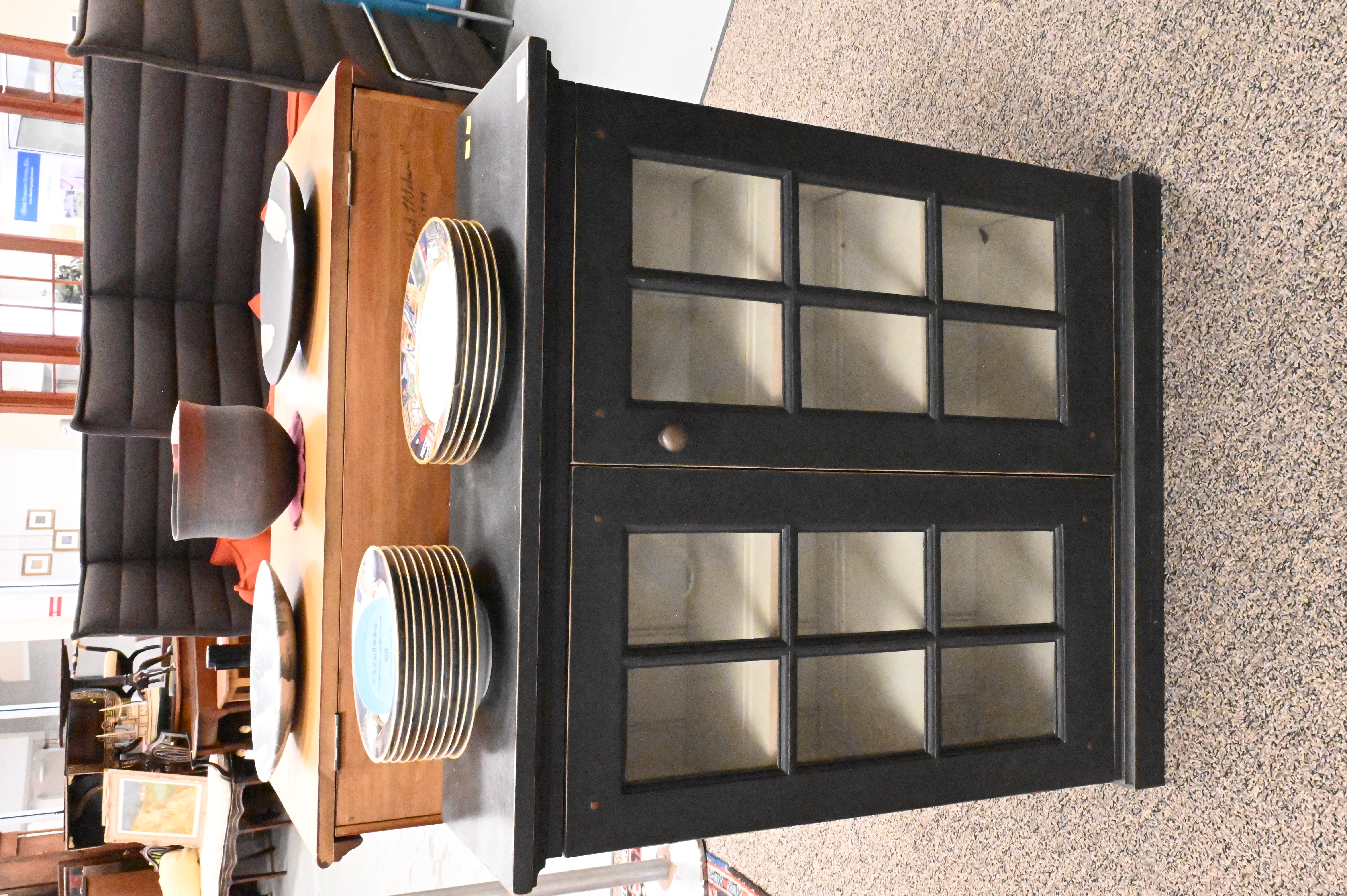 painted having two glazed glass panel doors open to reveal three shelves