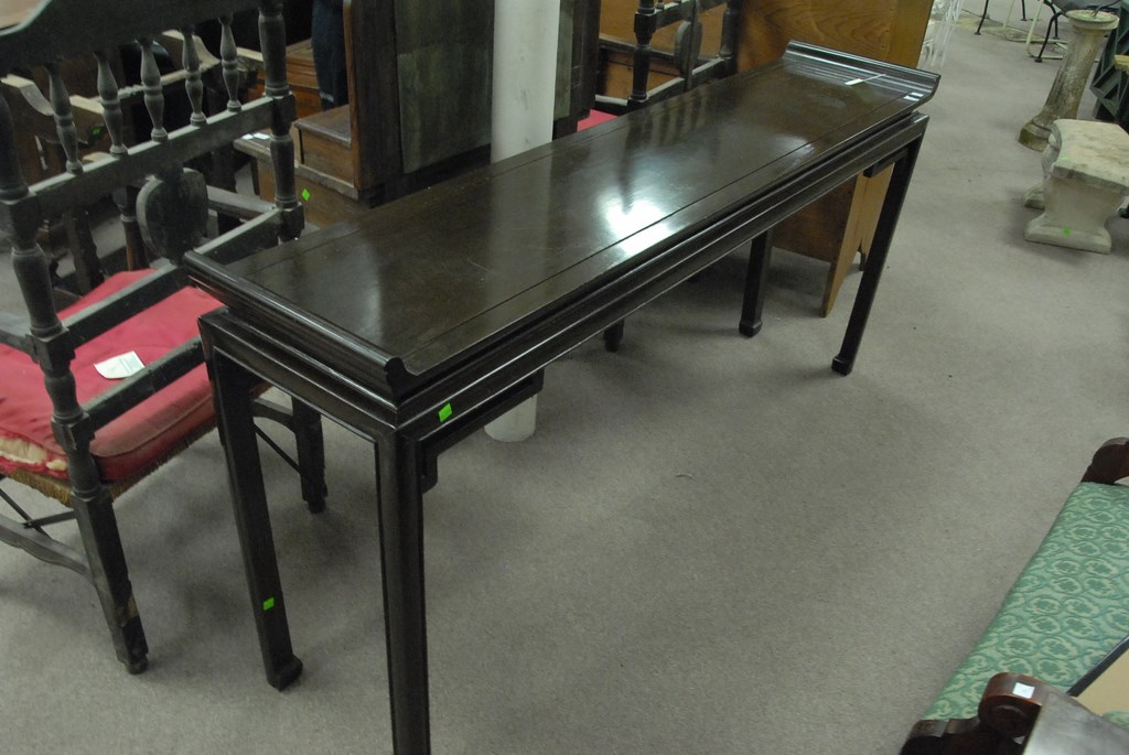 Three piece lot: Chinese alter style table lg. 70 in. and two mahogany one door cabinets.