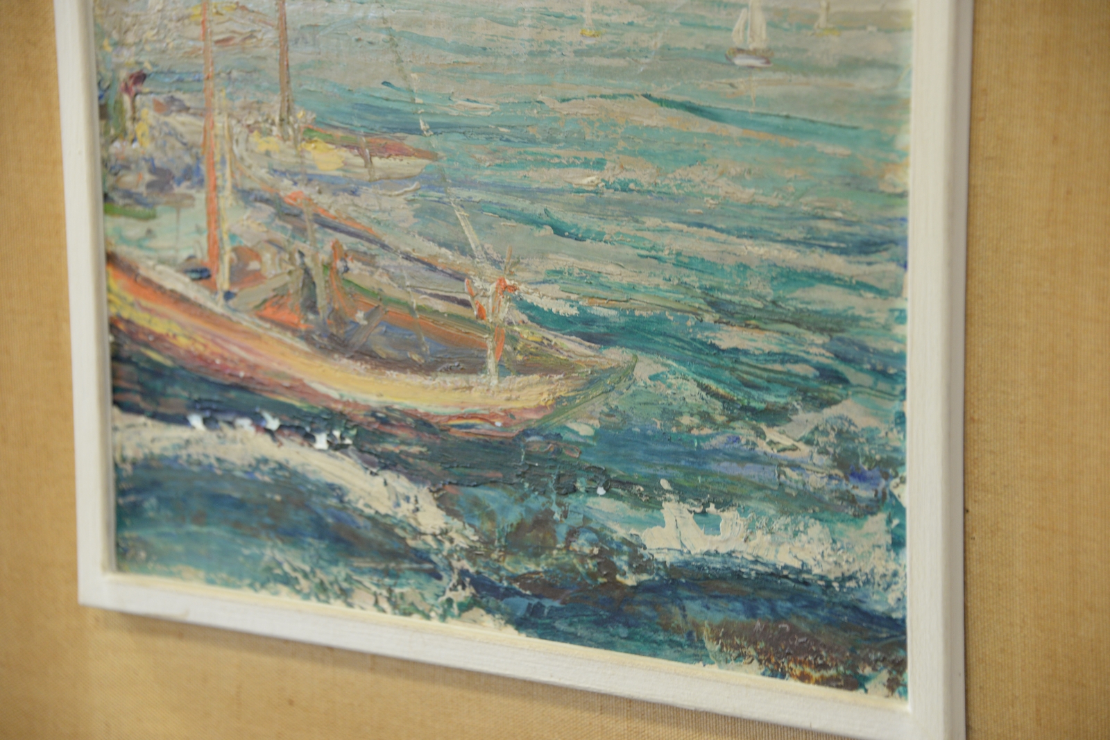 Two oil paintings including an oil on board sailing vessel at sea unsigned 16 x 12 and a geometric abstraction unsigned 24 x 17.