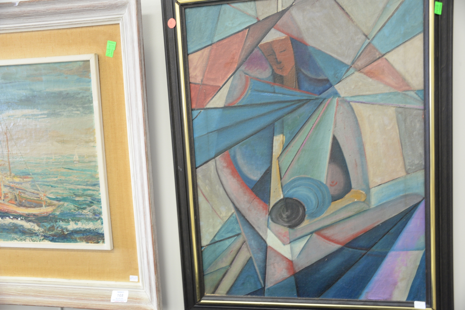 Lot 168: Two oil paintings including an oil on board sailing vessel at sea unsigned 16 x 12 and a geometric abstraction unsigned 24 x 1…
