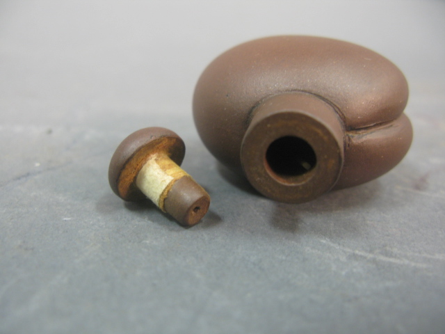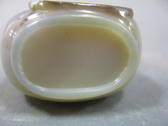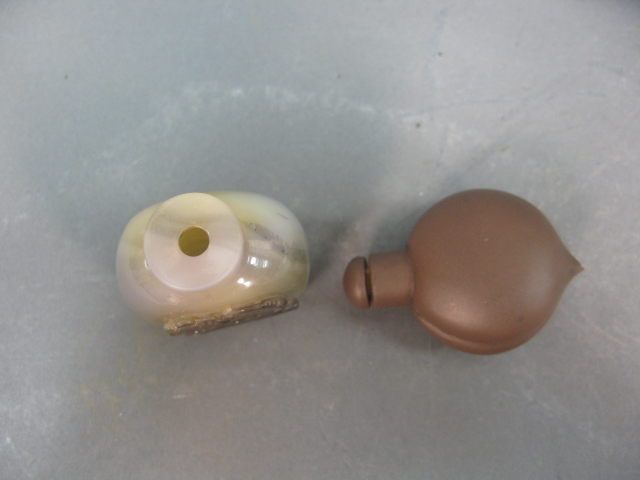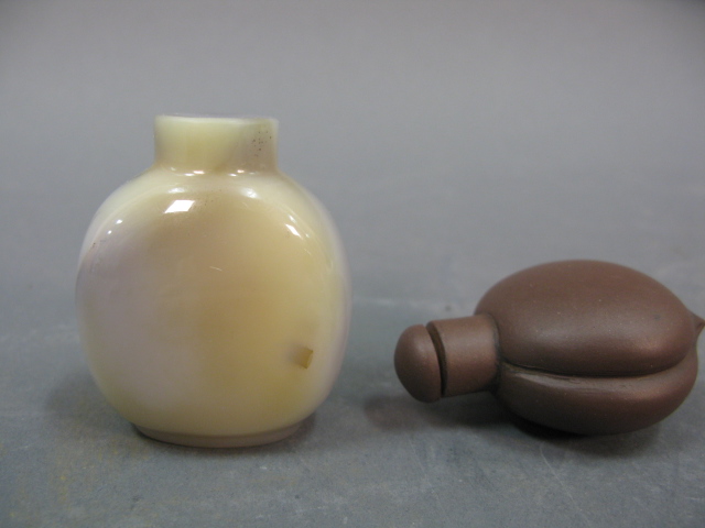 Two snuff bottles one carved agate with leaping fish and one red ware.