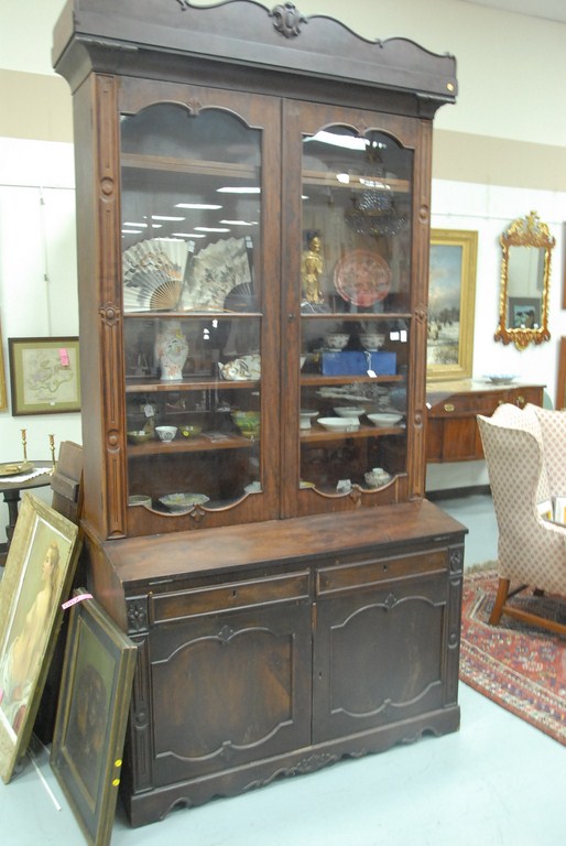 Victorian mahogany bookcase secretary desk in three parts, top section being a crest over middle with two glass doors over base with flip lid writing surface, drawer and two doors. ht. 106in. wd. 56in.