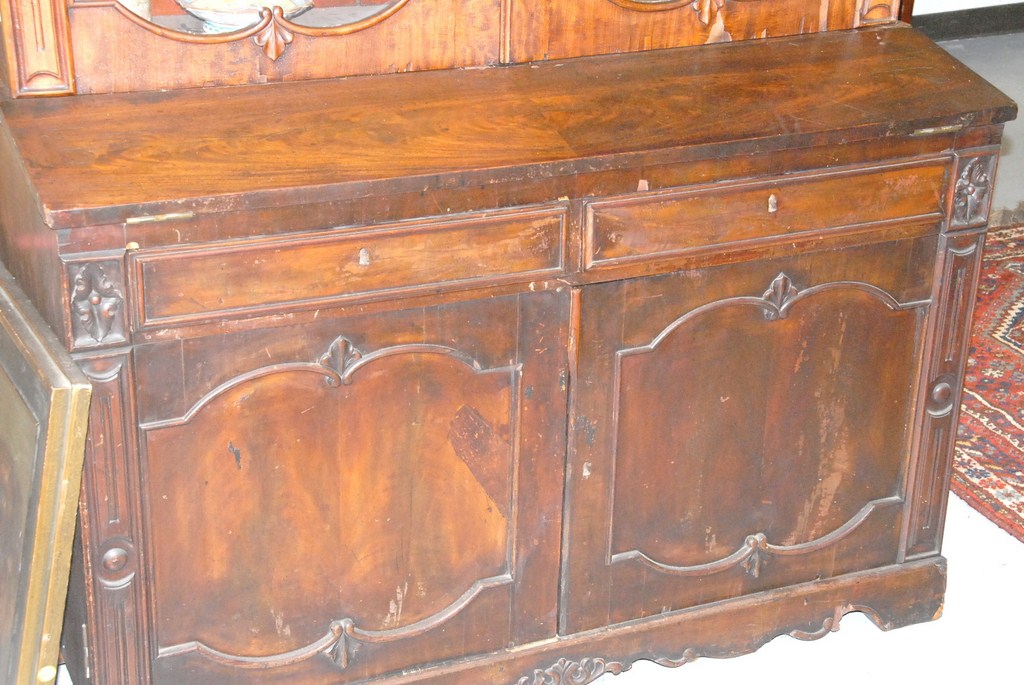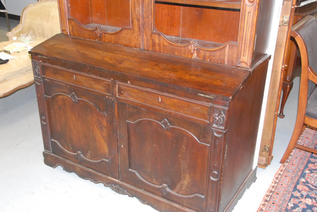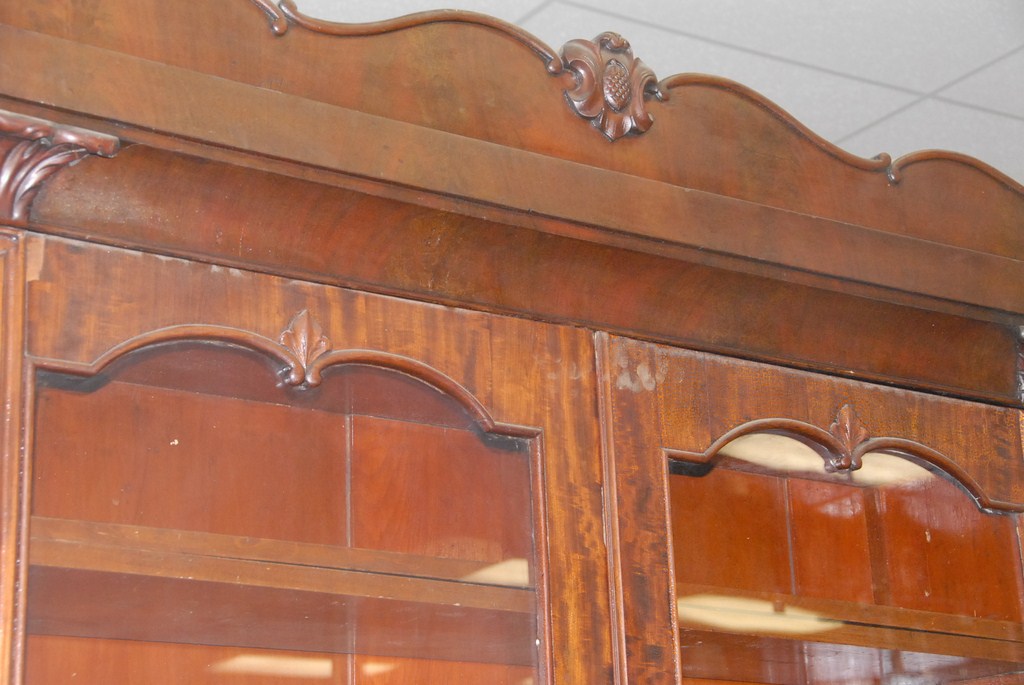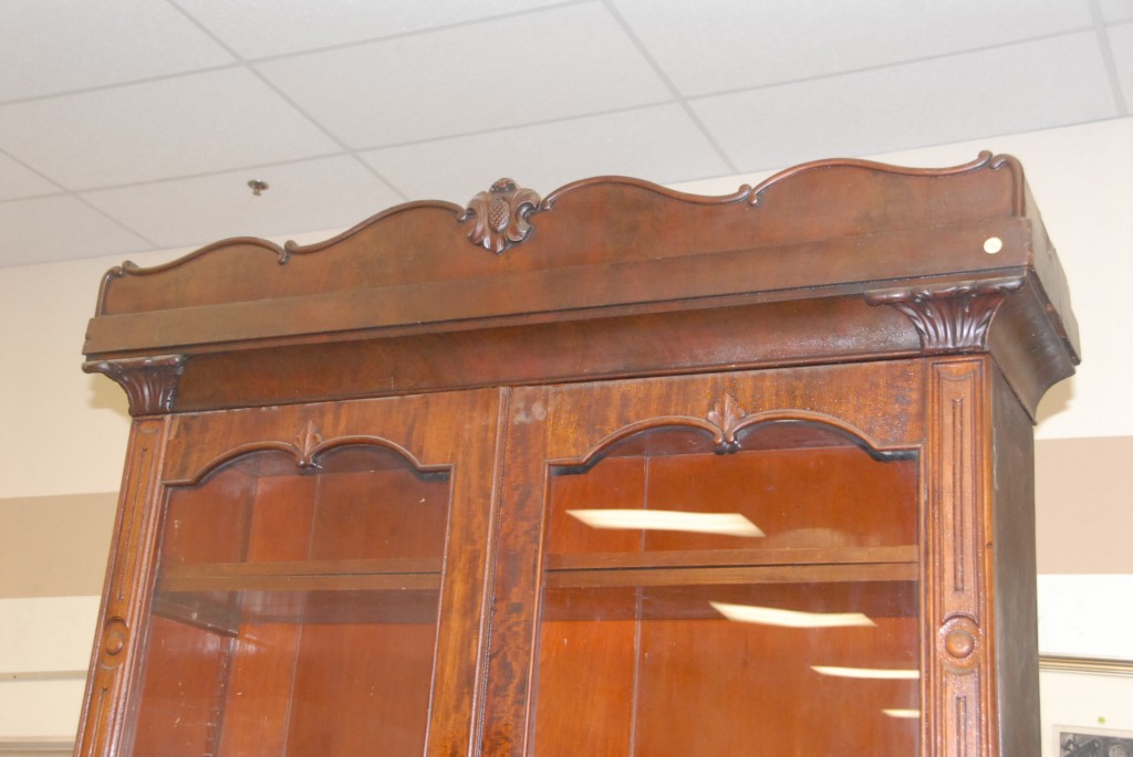 Lot 168: Victorian mahogany bookcase secretary desk in three parts, top section being a crest over middle with two glass doors over base with…