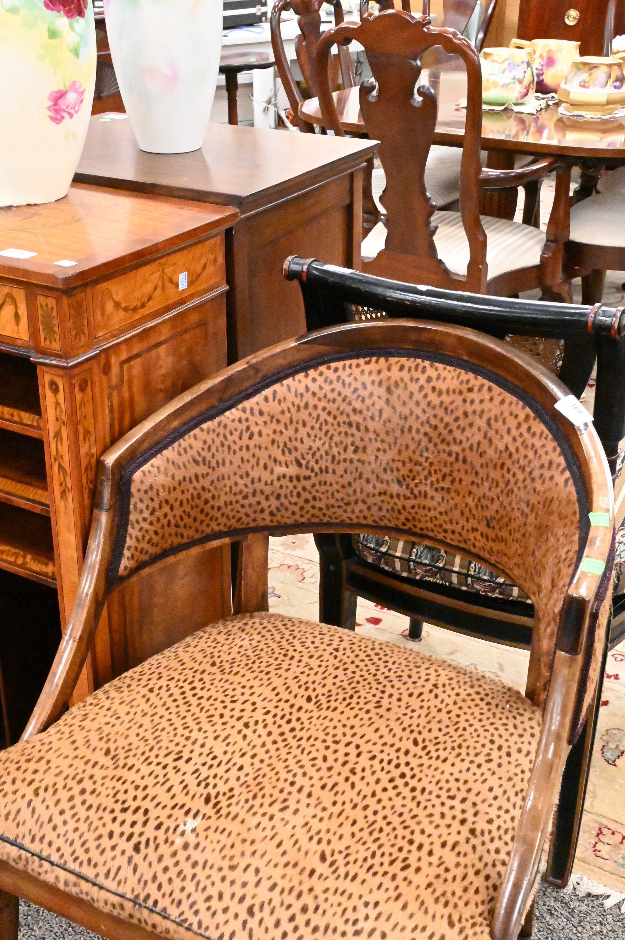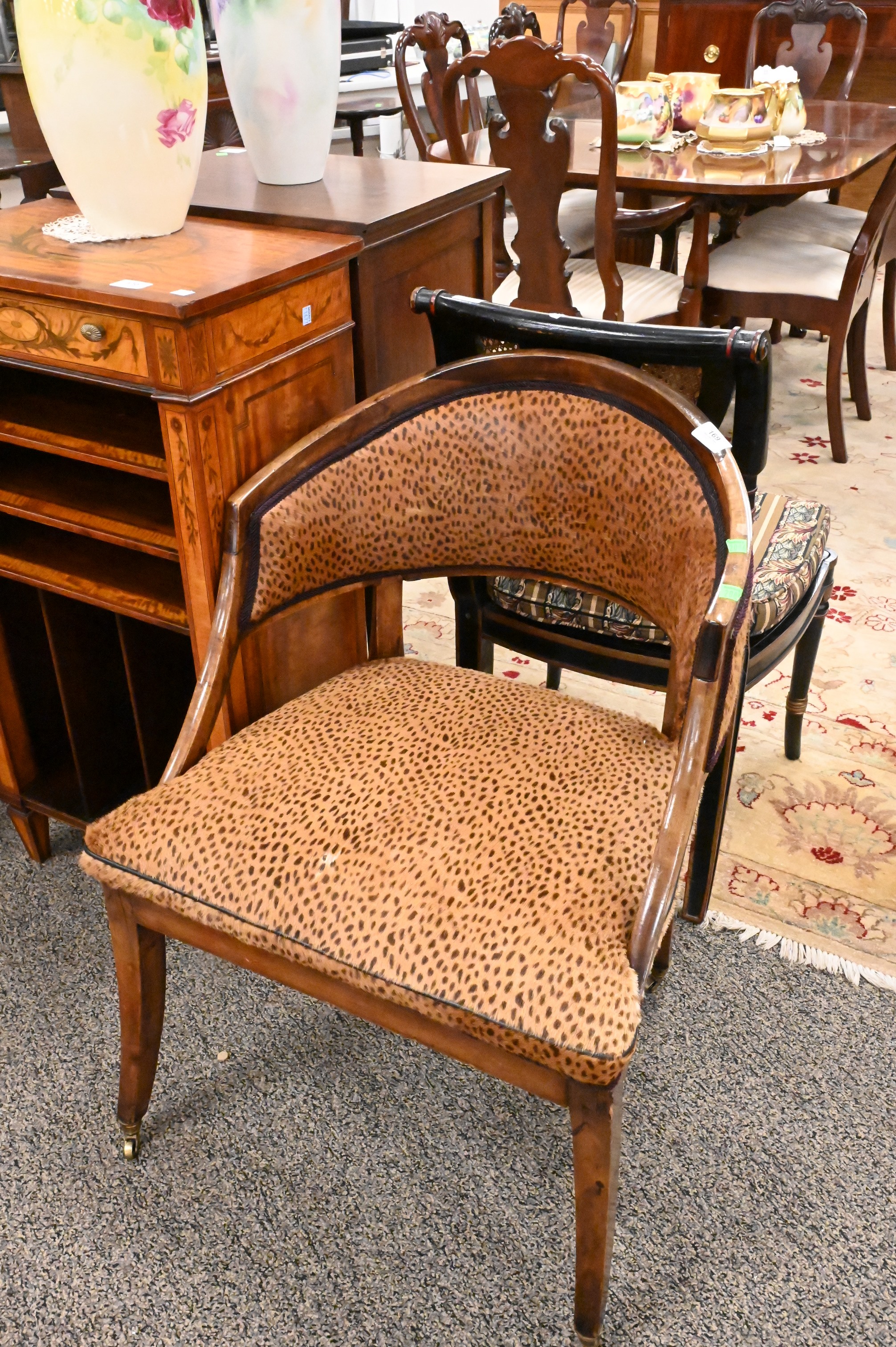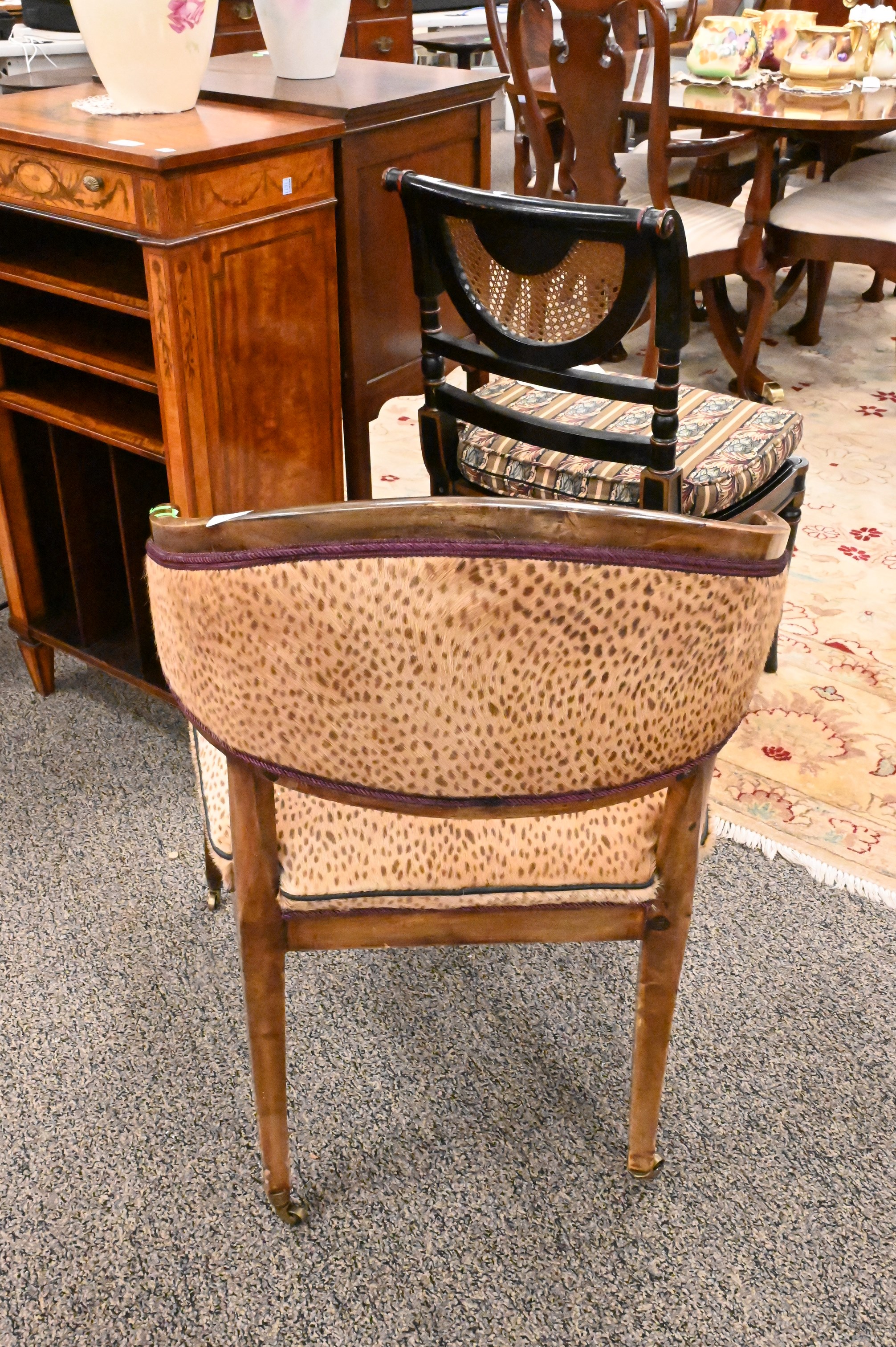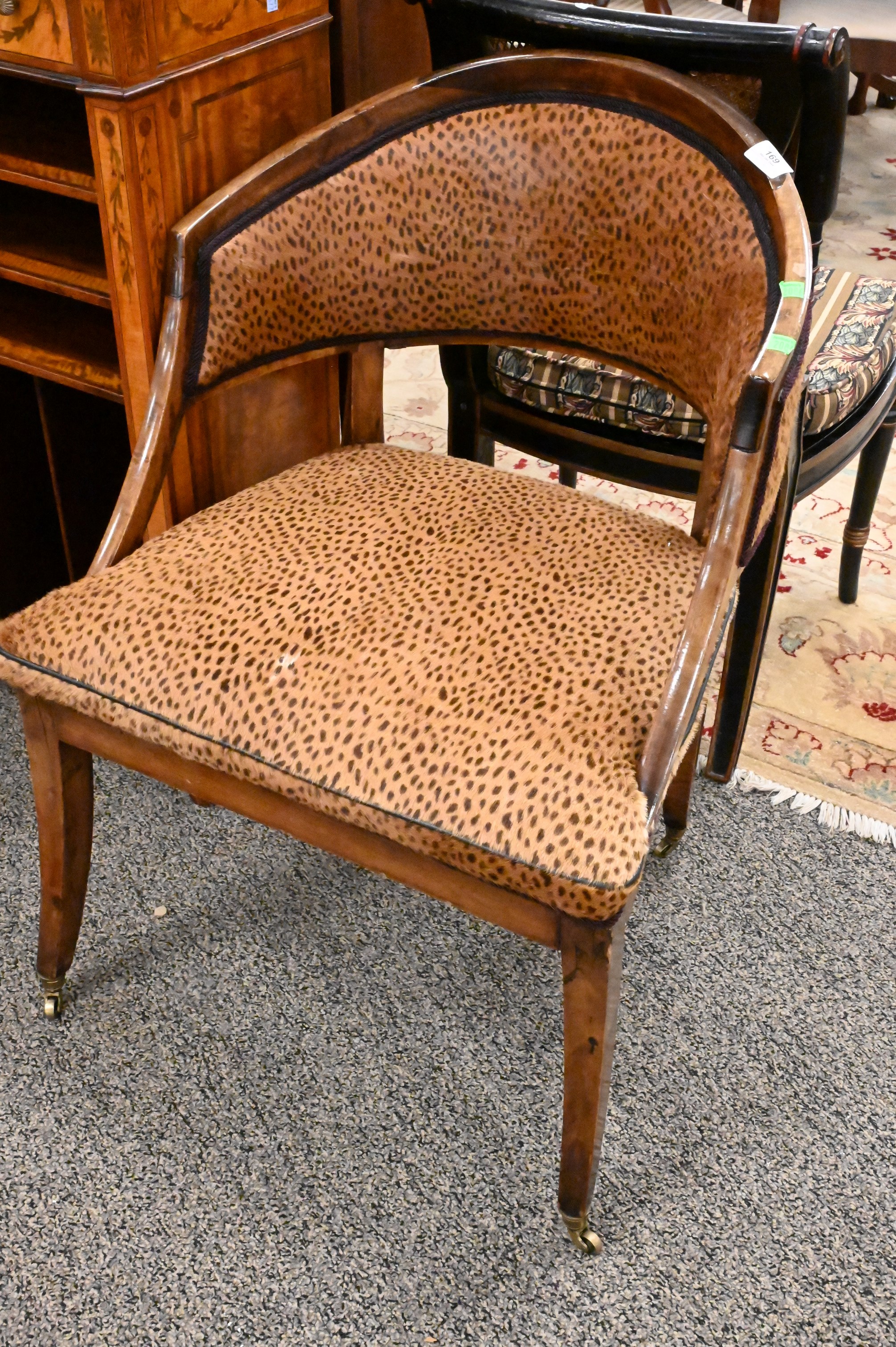 19th Century Continental Chair, having rounded back with cheetah upholstery, set on brass casters, height 33 1/2 inches, width 24 inches, seat height 19 inches.