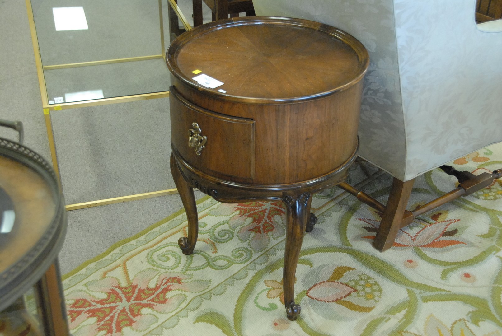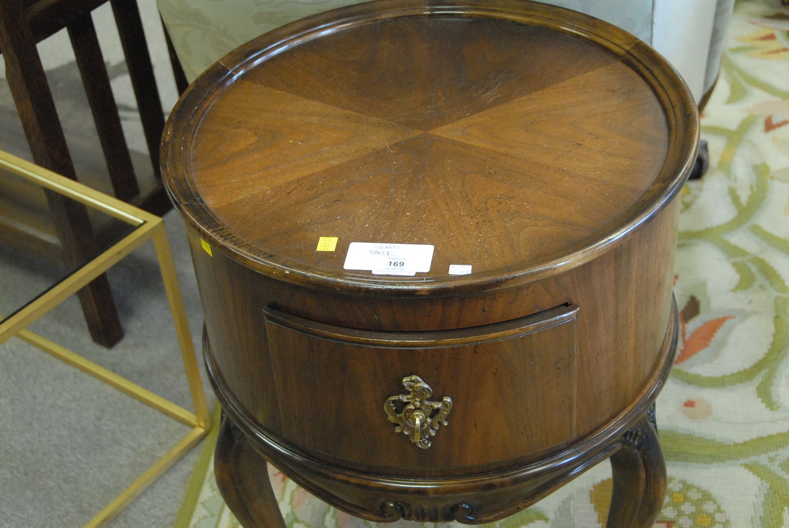 Lot 169: Baker drum table with drawer. ht. 28 1/2 in. dp. 20 3/4 in.