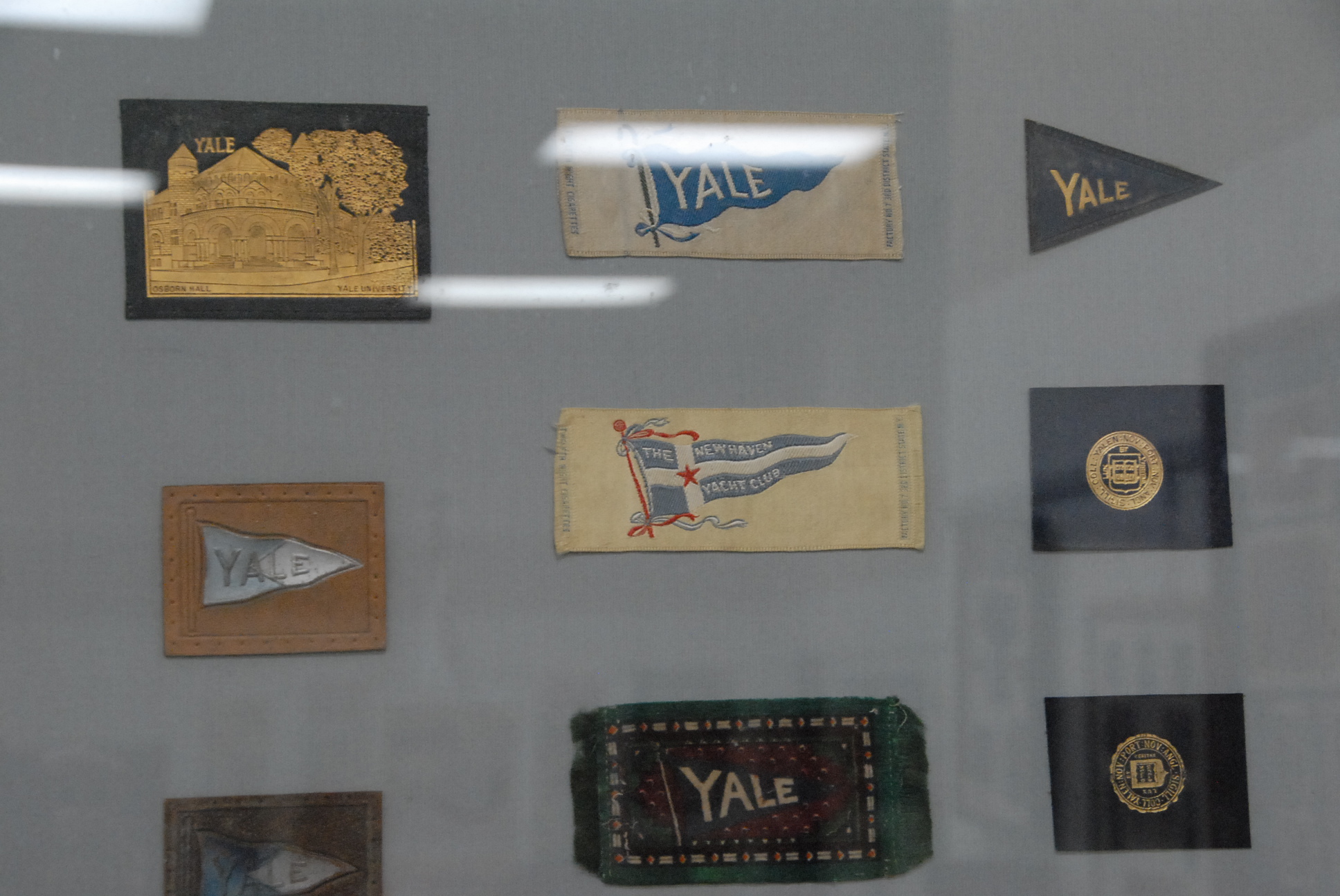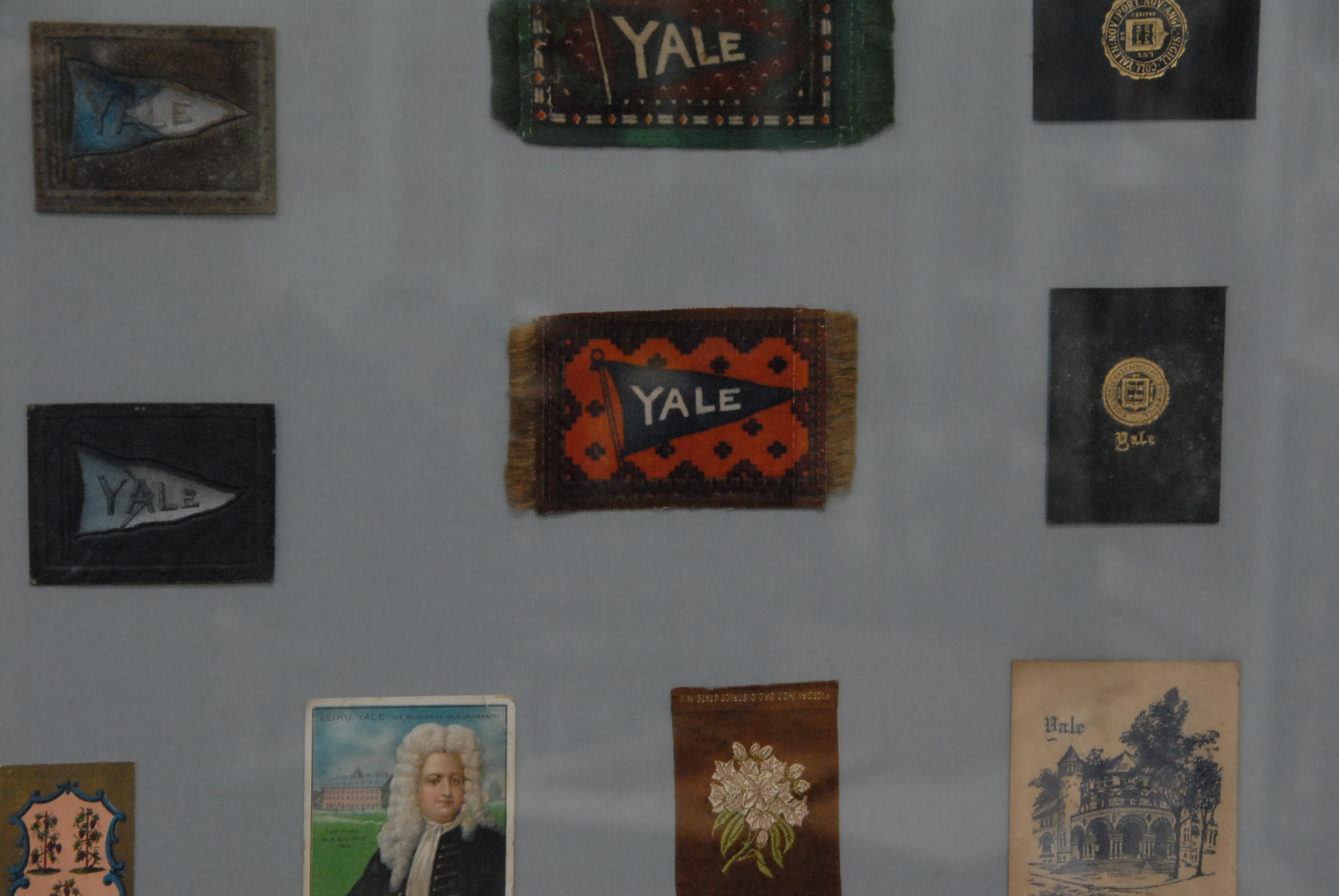 Collection of 16 tobacco silks and leathers 1900-1920 including two rare depictions of Osborne Hall, a portrait card of Elihu Yale, and New Haven Yacht Club banner, framed, 25 1/2 x 20.