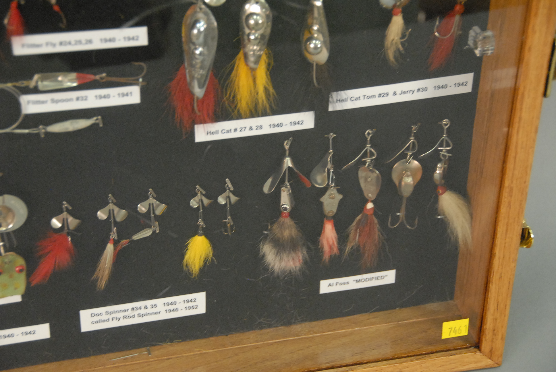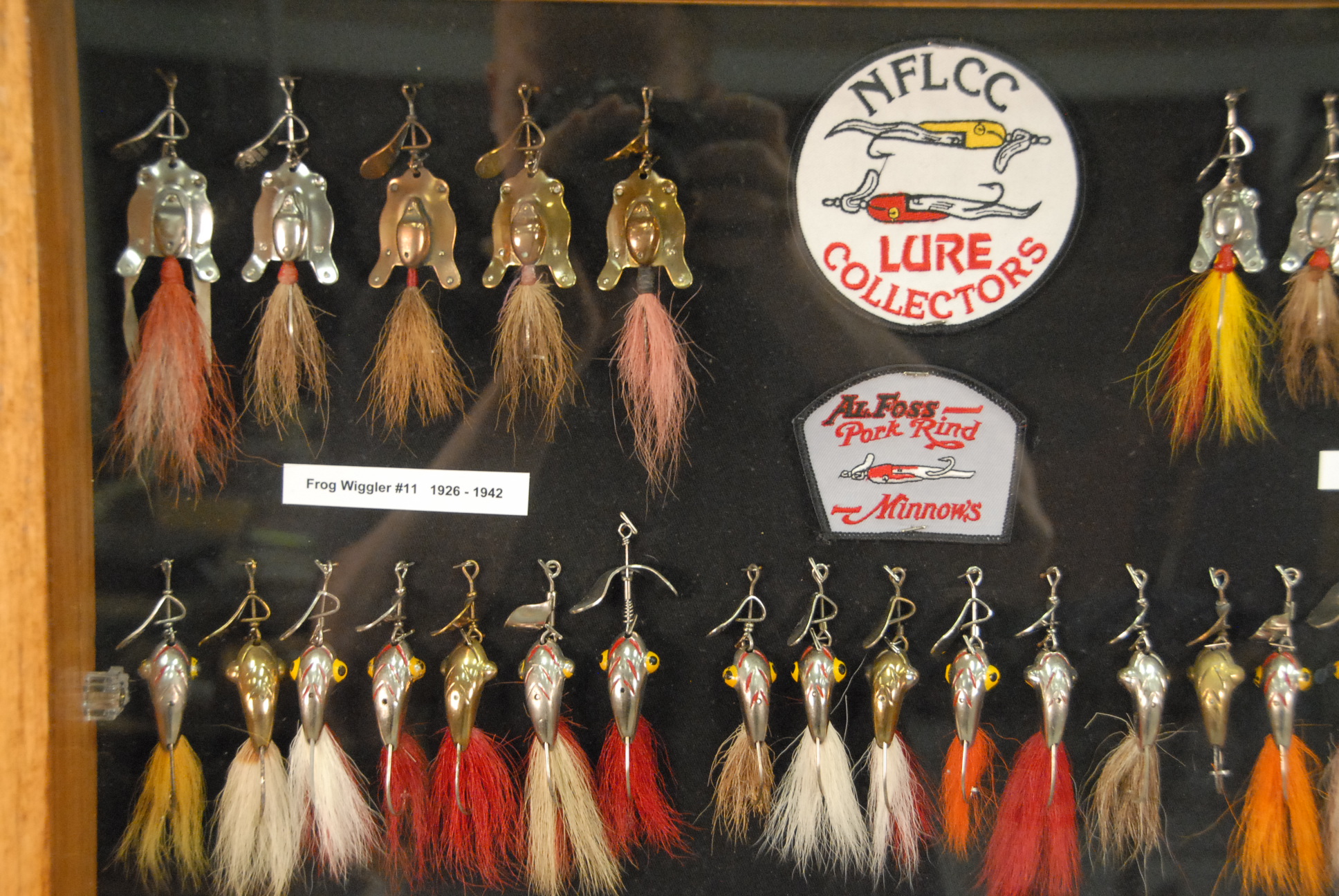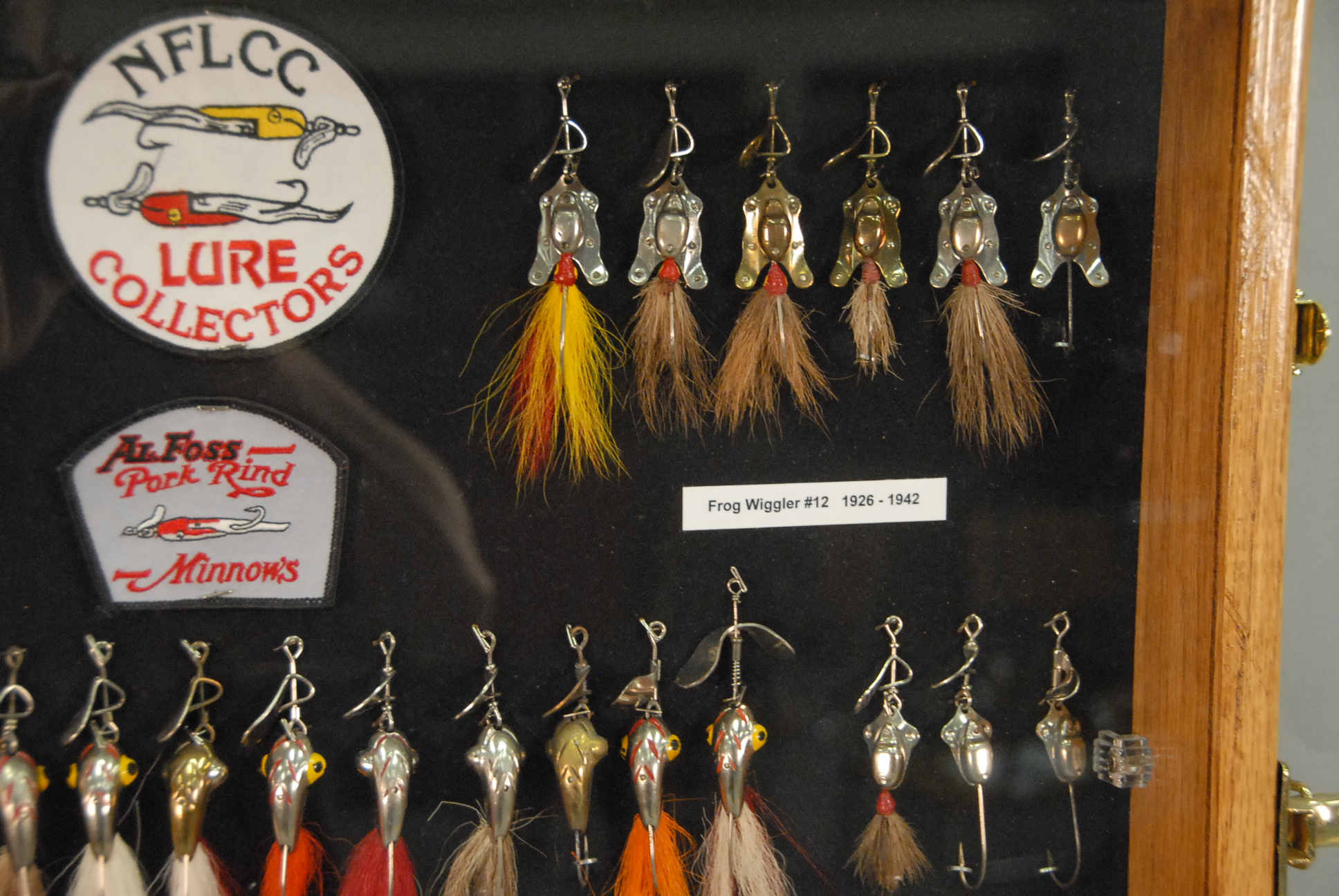 Collection of sixty-five All Foss lures to include eleven Frog Wiggler 1926-1942 #11 & #12, sixteen Dixie Wiggler 1928-1957 #3 & #4, three New Egypt #2 1928-1941, five Mouse Wiggler #15 1931-1941, three Fan Dancer #18 1936-1942, three Sheik #19 & #20 1941, five Flitter Fly #24, #25, & #26 1940-1942, one Flitter Spoon #23 1940-1941, three Hell Cat # 27 & #28 1940-1942, two Hell Cat Tom #29 and Jerry #30 1940-1942, three Frogs Wood Frog-Bass Pop #31 and Pork Chunk 1940-1942, five Doc Spinners #34 & #35 called Fly Rod Spinner, five Modified Lures, all in custom showcase.