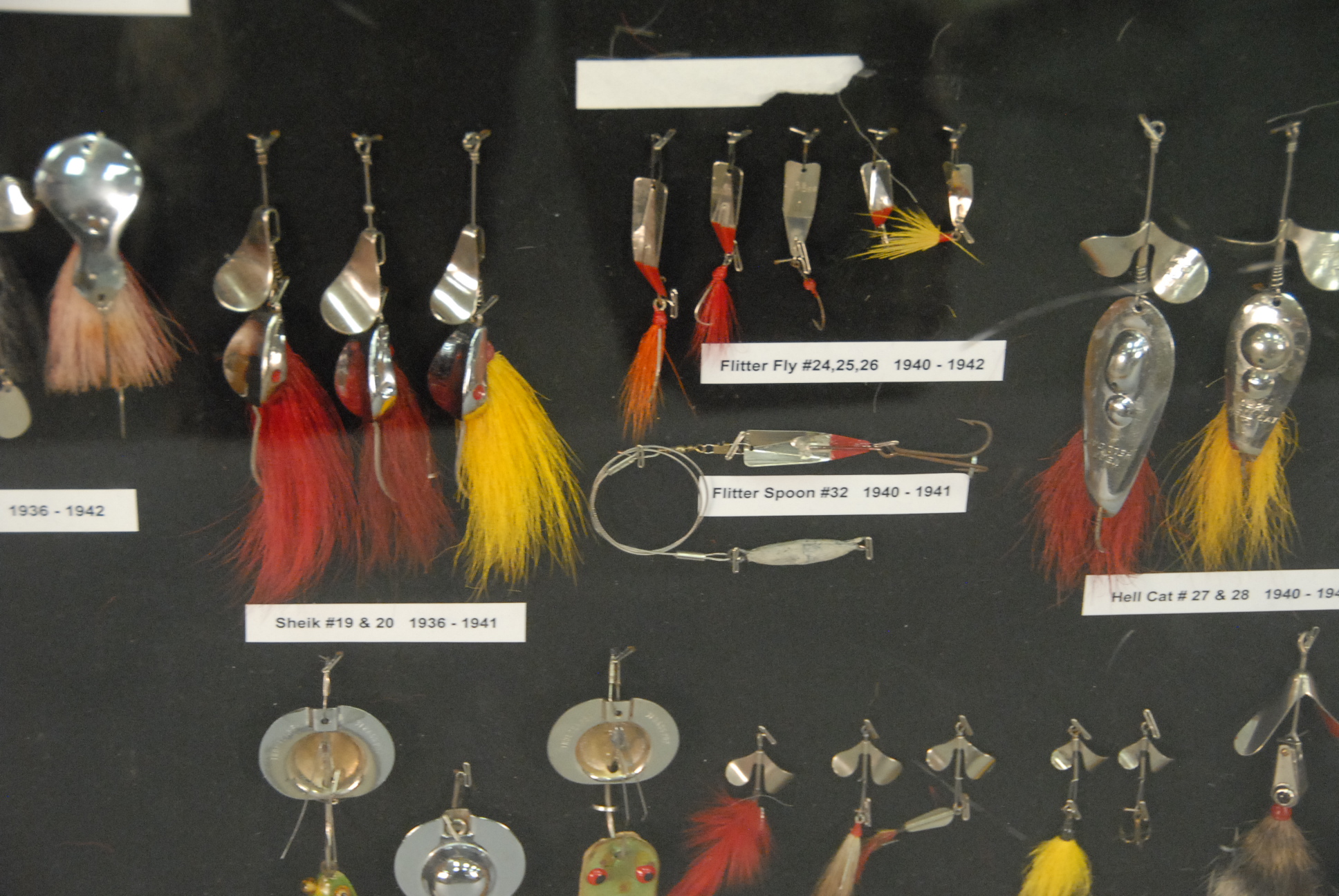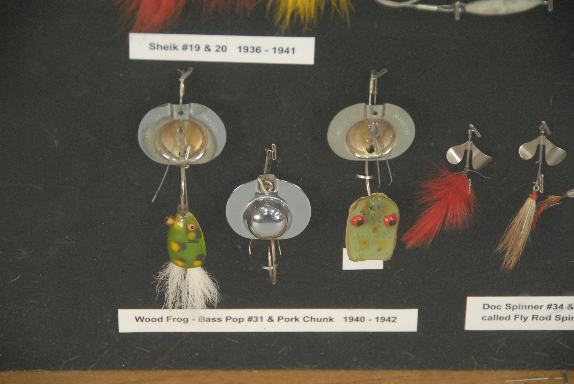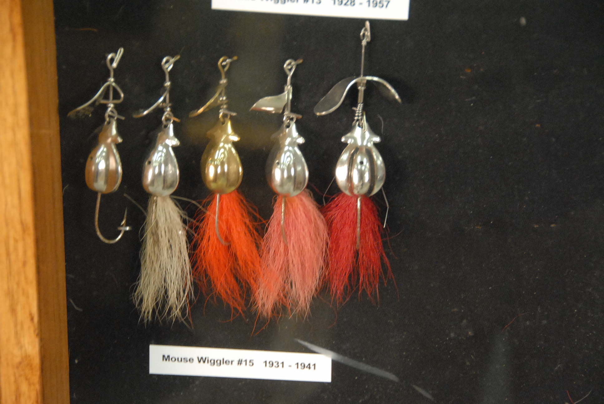 Collection of sixty-five All Foss lures to include eleven Frog Wiggler 1926-1942 #11 & #12, sixteen Dixie Wiggler 1928-1957 #3 & #4, three New Egypt #2 1928-1941, five Mouse Wiggler #15 1931-1941, three Fan Dancer #18 1936-1942, three Sheik #19 & #20 1941, five Flitter Fly #24, #25, & #26 1940-1942, one Flitter Spoon #23 1940-1941, three Hell Cat # 27 & #28 1940-1942, two Hell Cat Tom #29 and Jerry #30 1940-1942, three Frogs Wood Frog-Bass Pop #31 and Pork Chunk 1940-1942, five Doc Spinners #34 & #35 called Fly Rod Spinner, five Modified Lures, all in custom showcase.