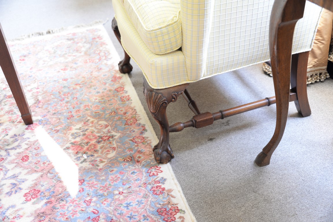 Lot 169: Custom Chippendale style mahogany ball and claw foot wing chair with clean custom upholstery.