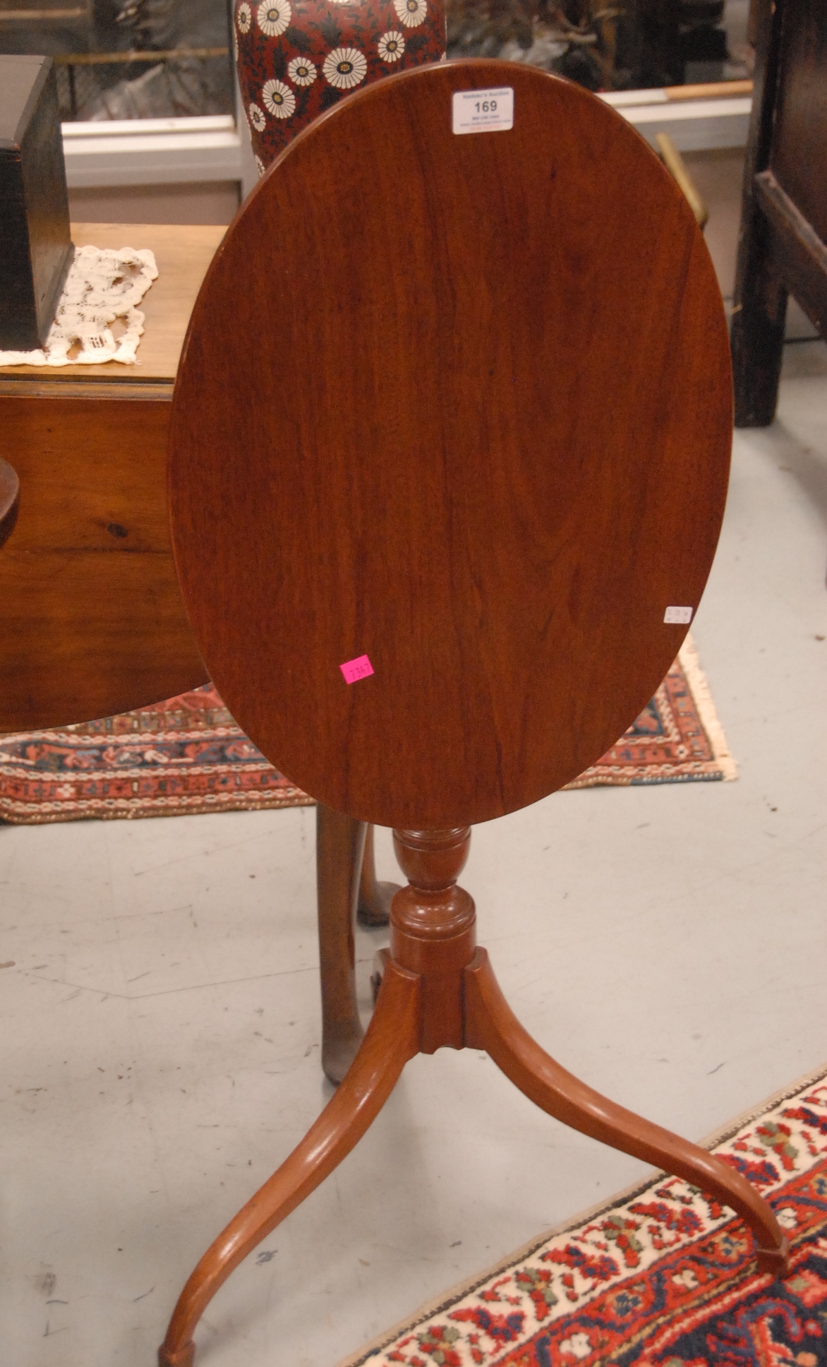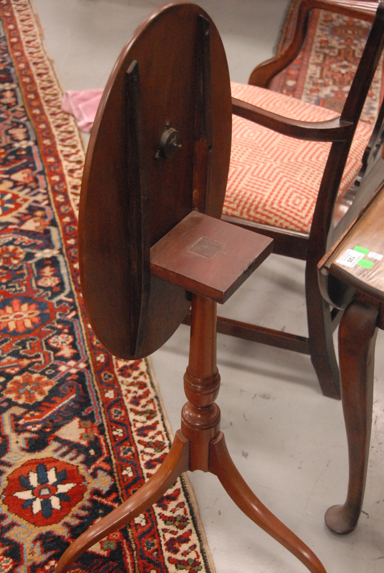 Lot 169: Federal mahogany oval tip stand with urn shaft. ht. 27 in. lg. 23 in. wd. 16 in. Provenance: Property from The Estate of W. Scott Van Alstyne of Essex, Connecticut.