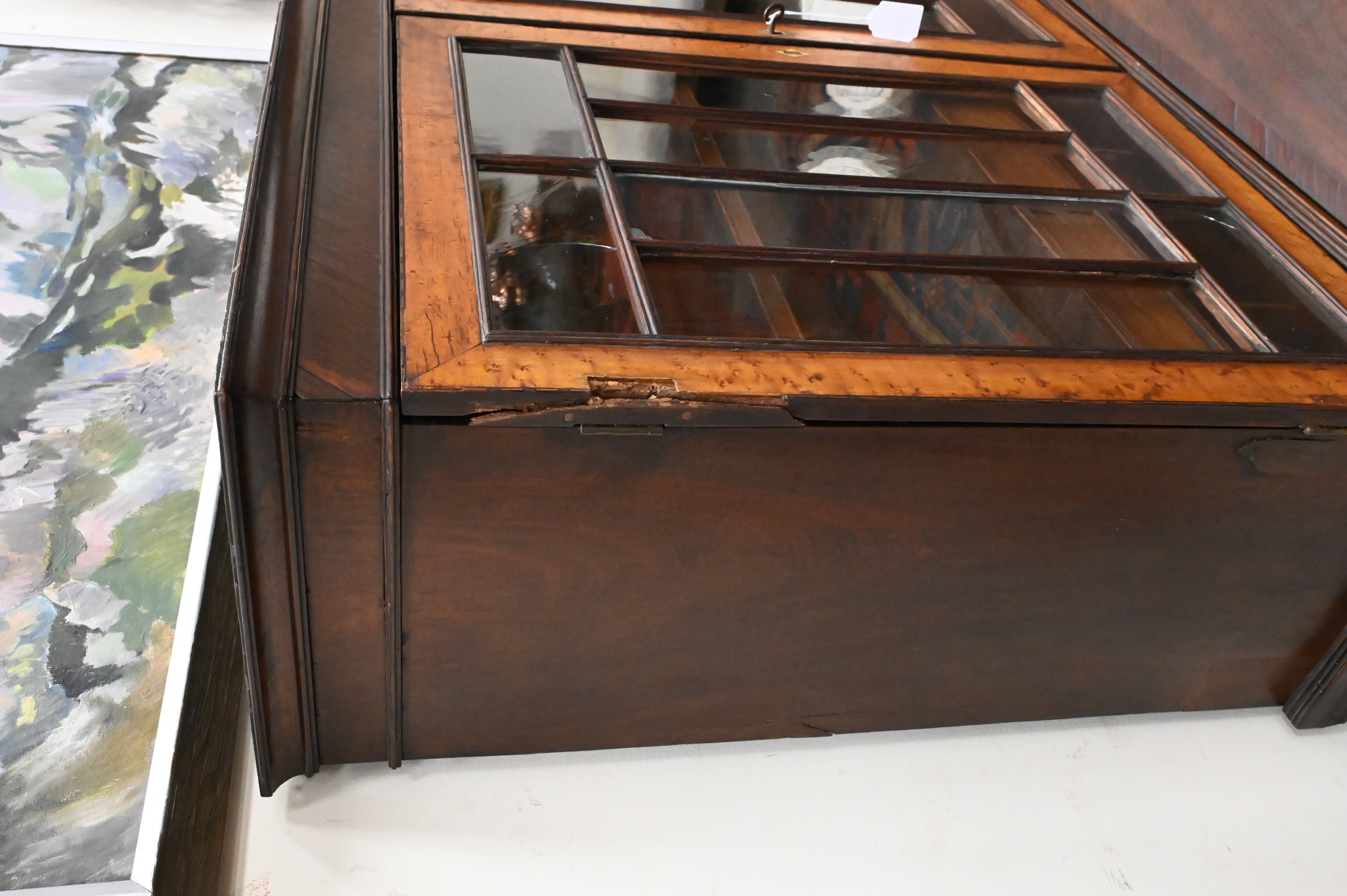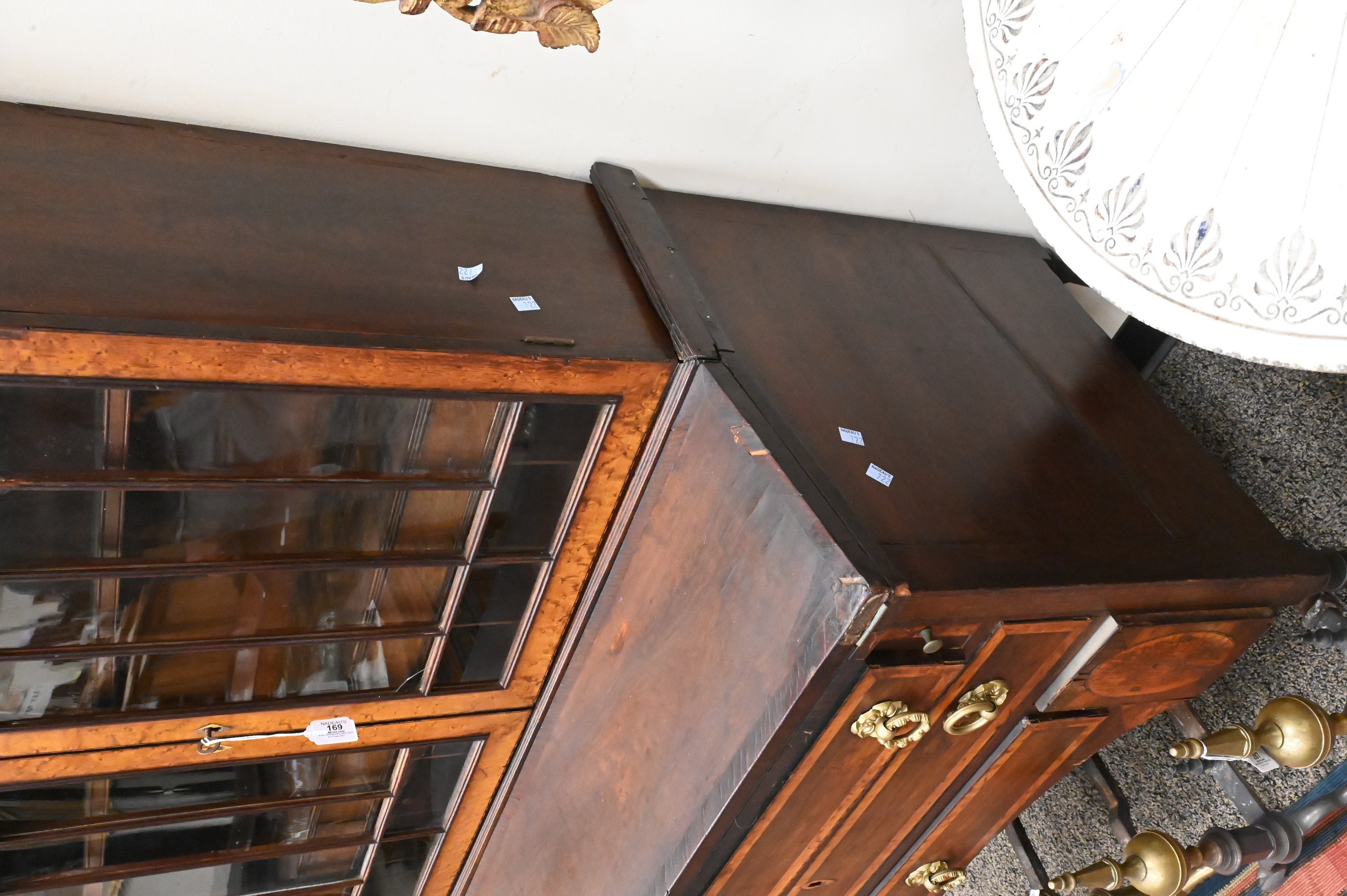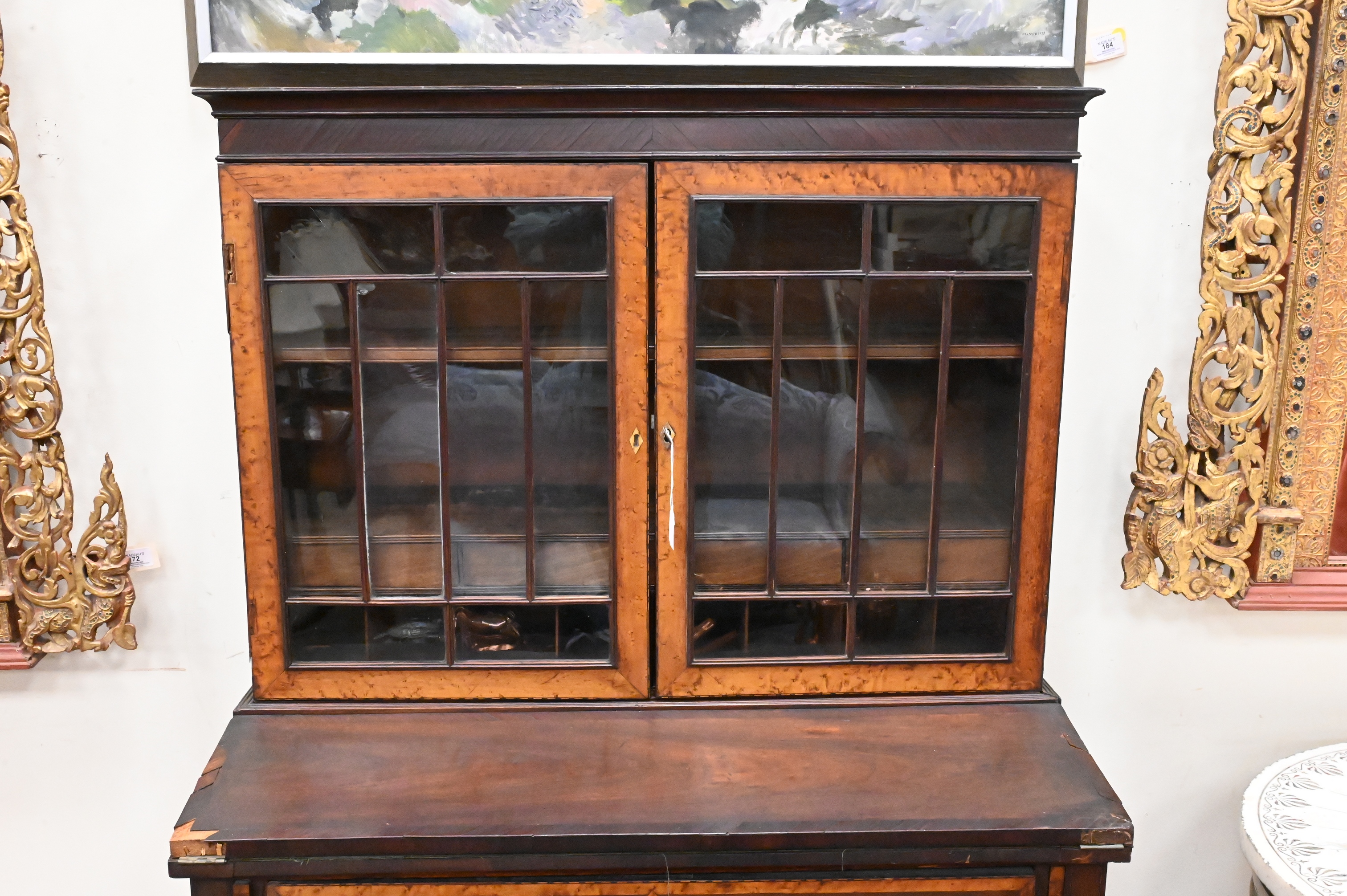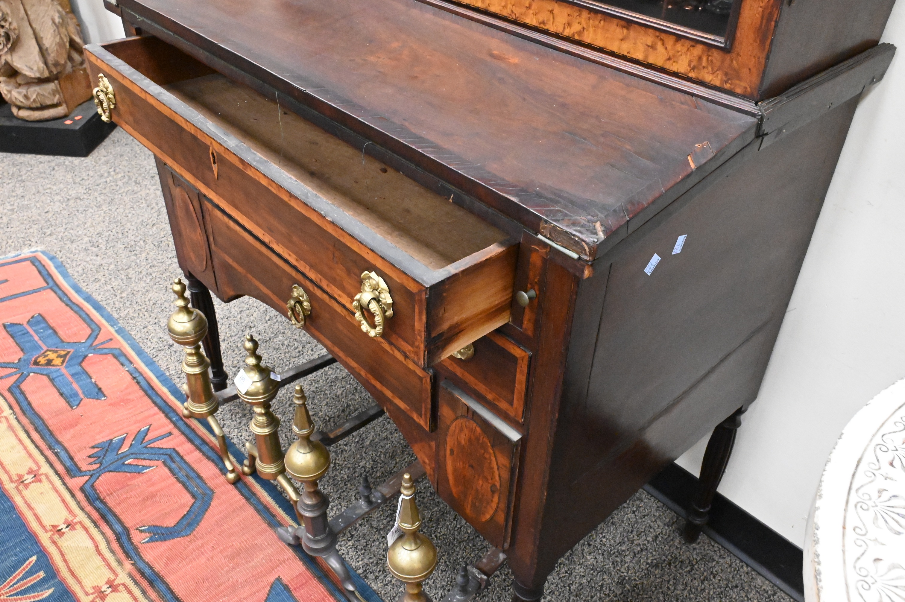 upper section having two glazed doors with adjustable shelves and three drawers over flip lid writing surface over three drawers and two bottle drawers with birdseye maple inlay and oval panels, all set on turned and fluted legs, veneer chips