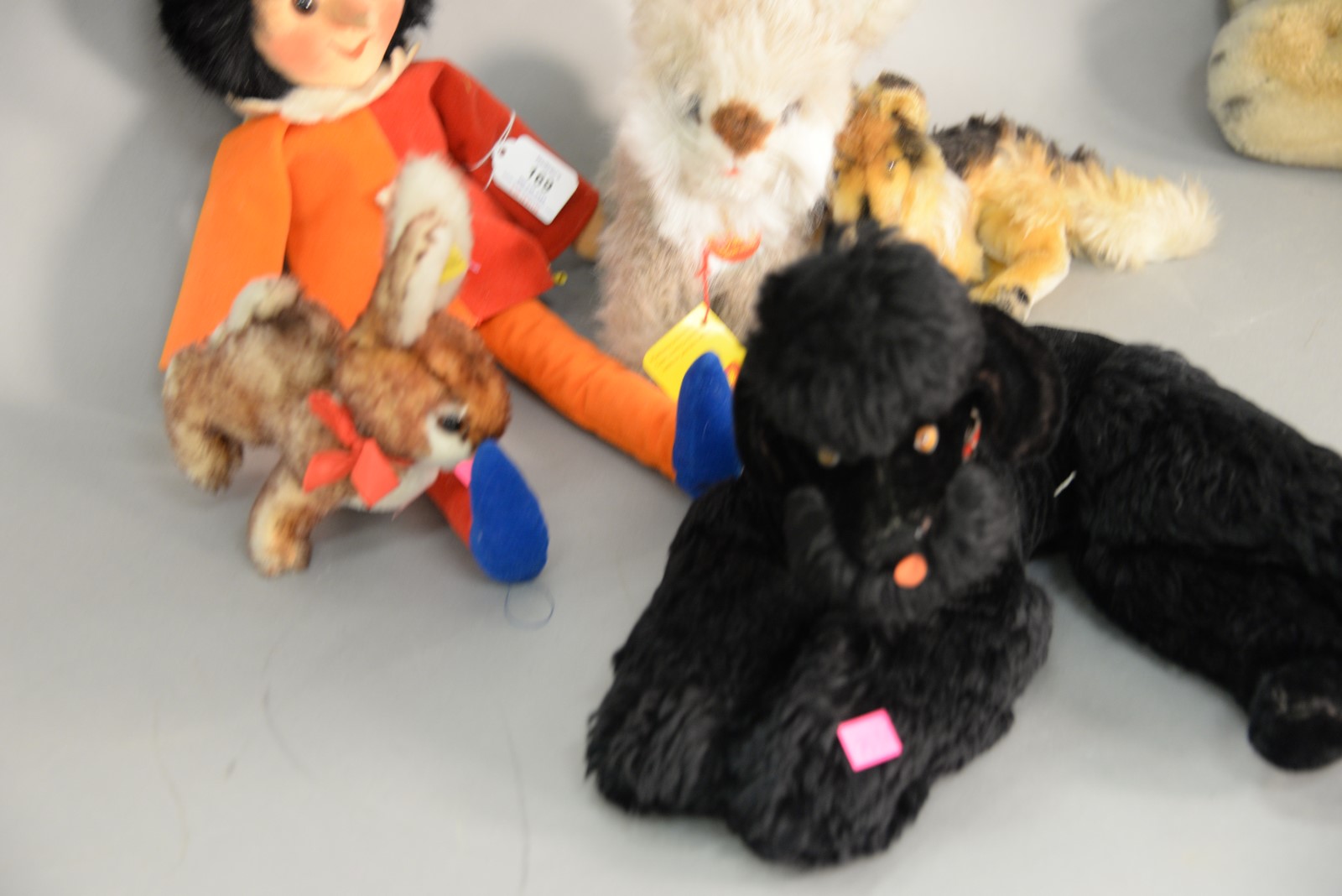 Lot 169: Five piece Steiff lot including poodle, two rabbits, collie and Fari doll, three with original button tags.lg. 6 1/2 in. – 14 1/2…