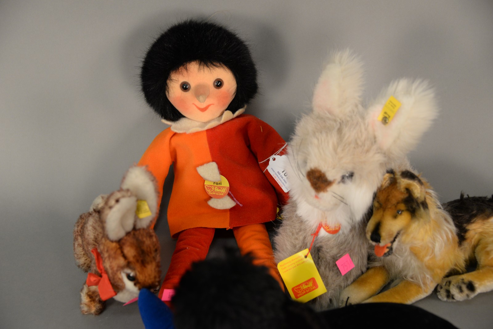 Five piece Steiff lot including poodle, two rabbits, collie and Fari doll, three with original button tags. lg. 6 1/2 in. – 14 1/2 in.