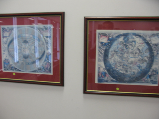 Four piece lot, print of palm trees, mirror and two prints of industrial maps, reproductions, Mid Eastern small watercolor and large pencil signed print.