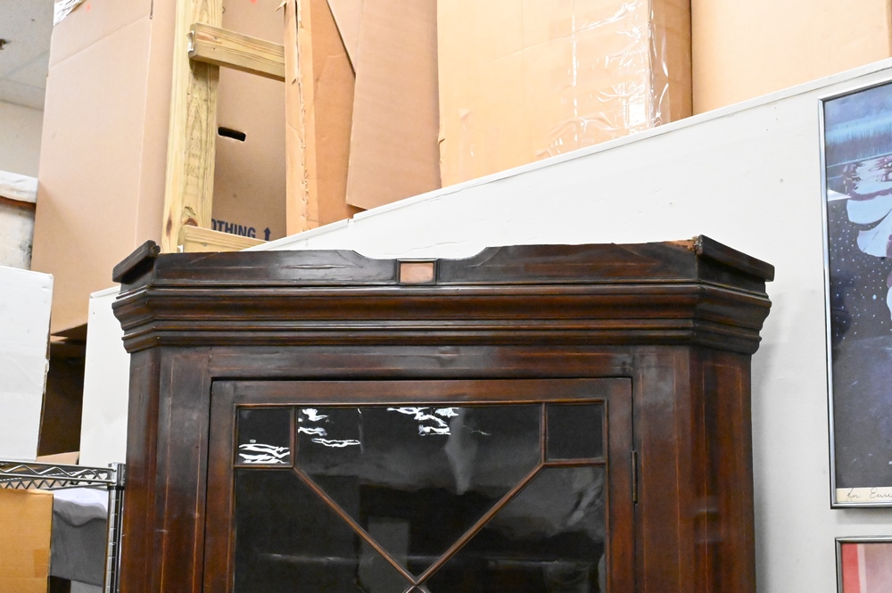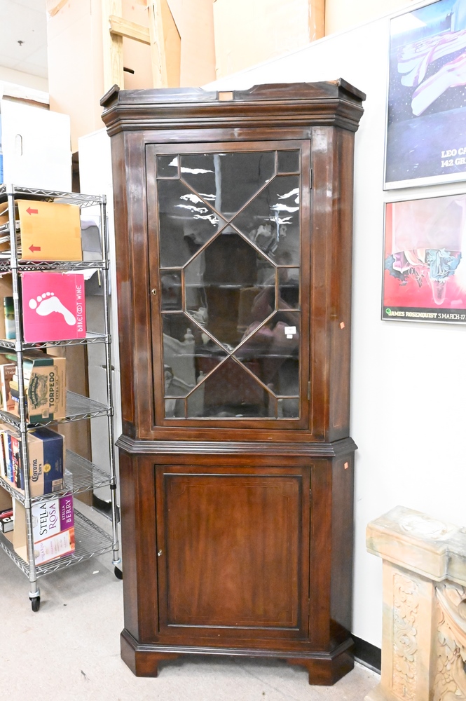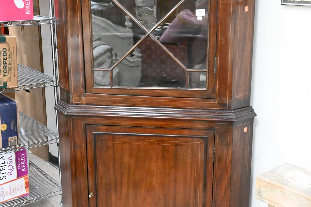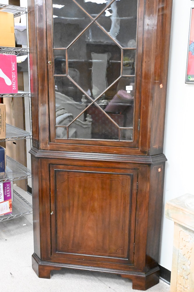 George IV Mahogany Corner China Cabinet, in two parts, (top crest broken), height 86 1/2 inches.