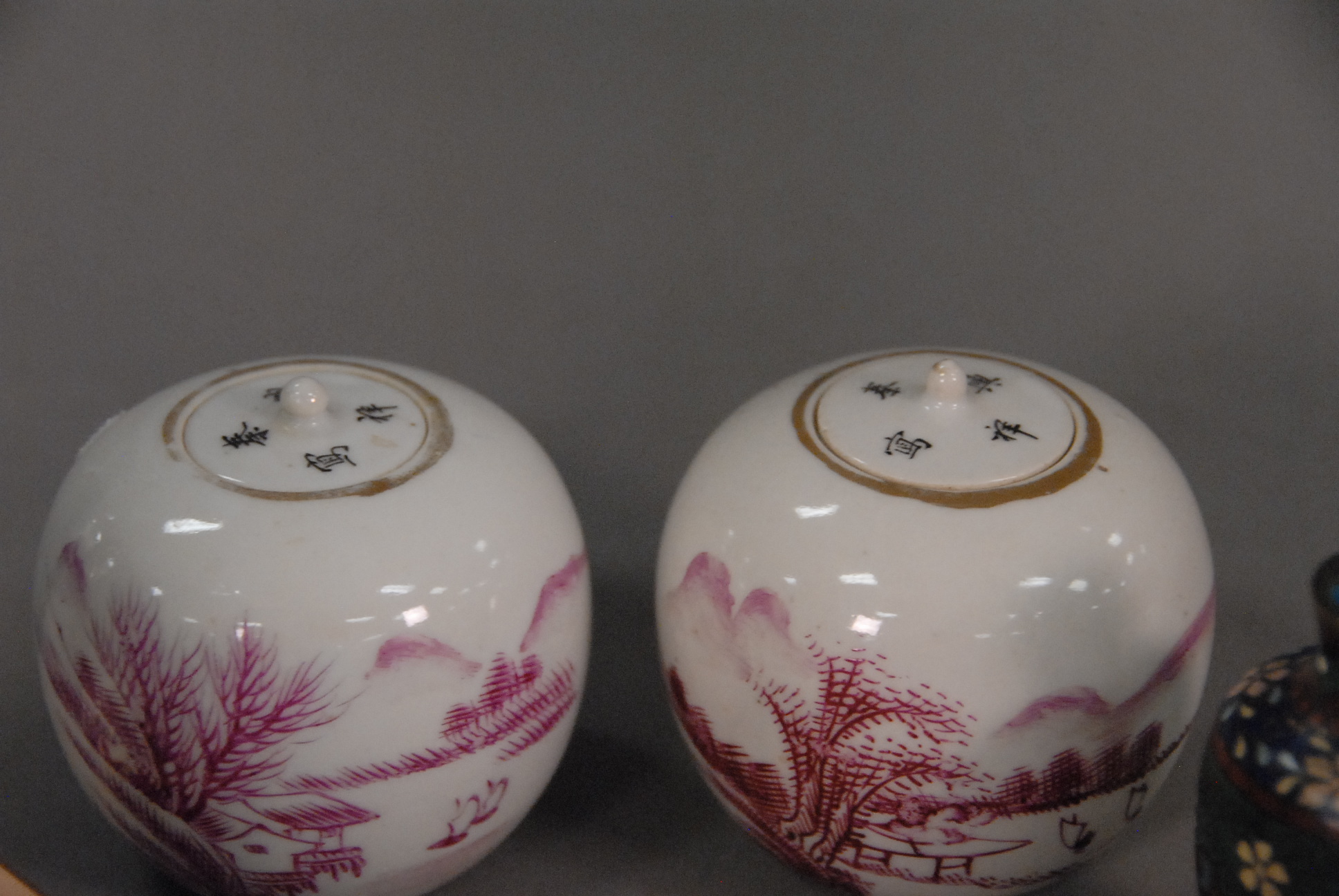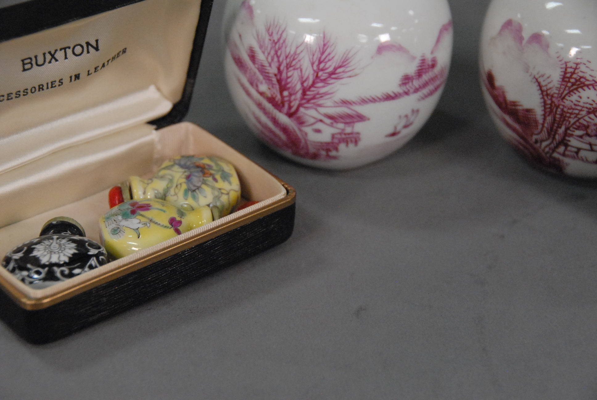 Group of Oriental items to include three small porcelain snuff bottles, a cabinet, cloissone vase, and a pair of porcelain jars with covers.
