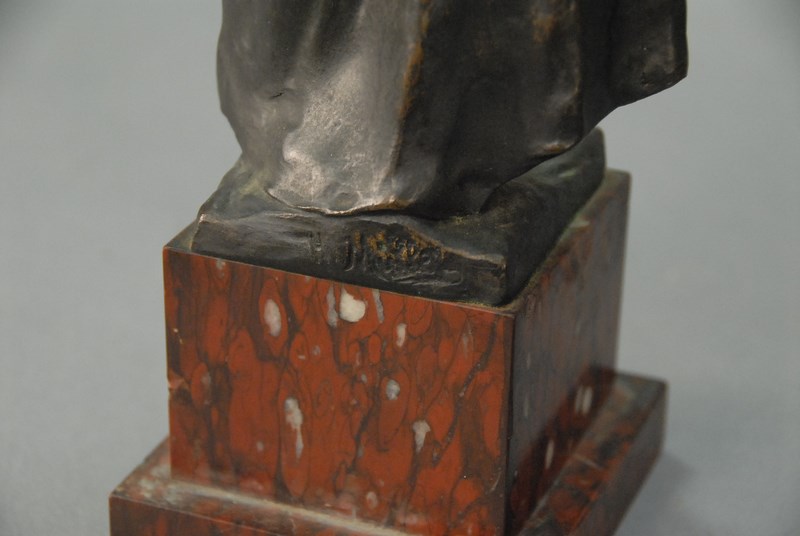 Hans Muller Bronze Sculpture Mozart on rouge marble base gilt bronze plaque marked Mozart signed on reverse H. Muller chip in base ht. 14in.