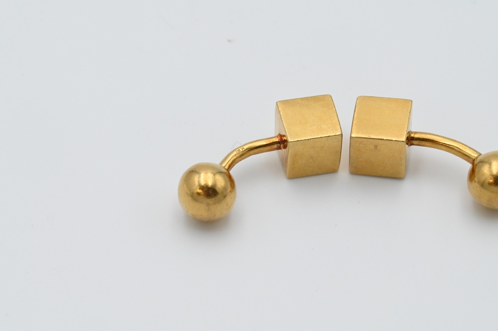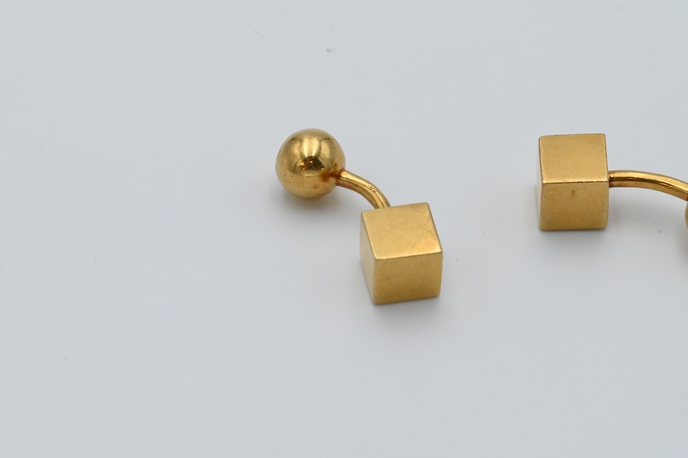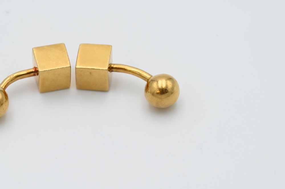 Lot 169: Pair of 18 Karat Yellow Gold Cufflinks, having square and round ends, 27 grams.