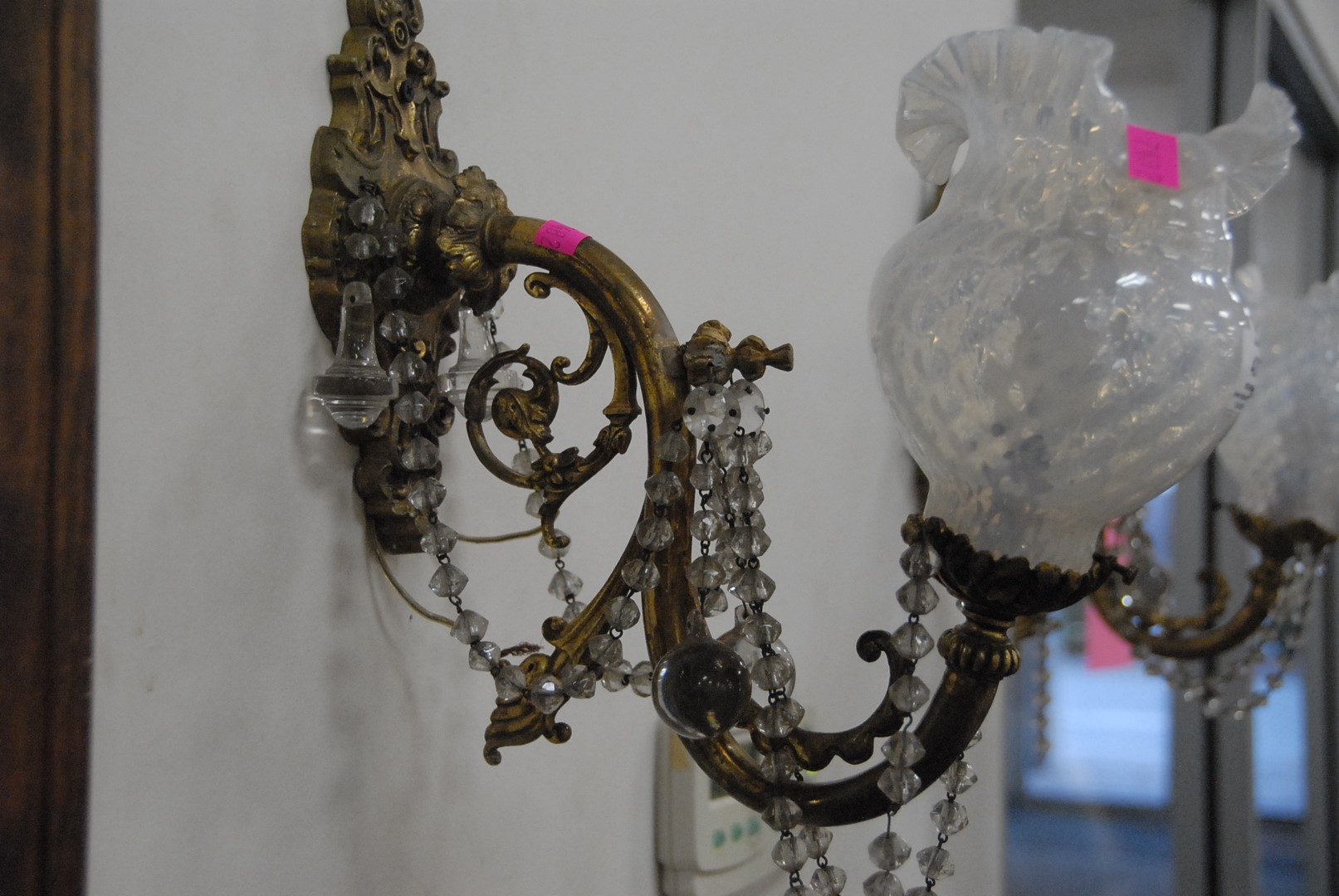 Lot 169: Pair of brass wall sconces with embossed wall plaque mounted with brass decorated shaft, single light with opalescent shades, each with chained crystals. total ht. 13 1/4 in. dp. 11 1/2 in.