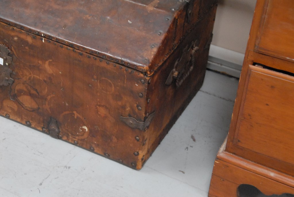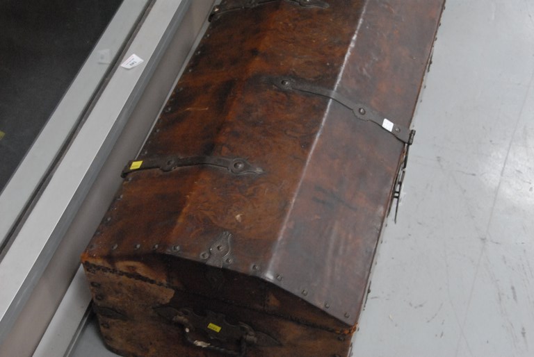 Lot 169: Primitive trunk having domed top all in original brown leather covering with iron hardware and tacks, 18th century Continental. ht. …