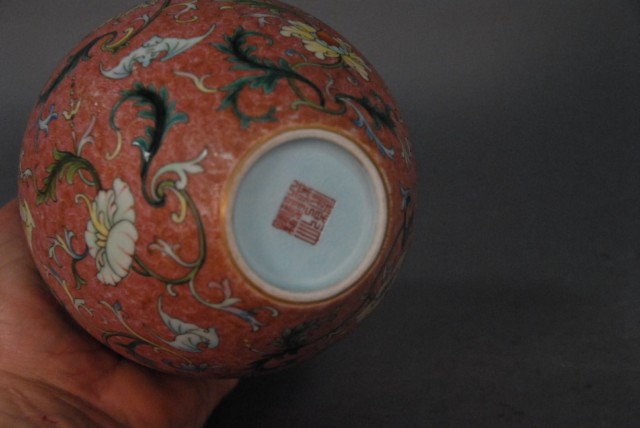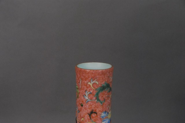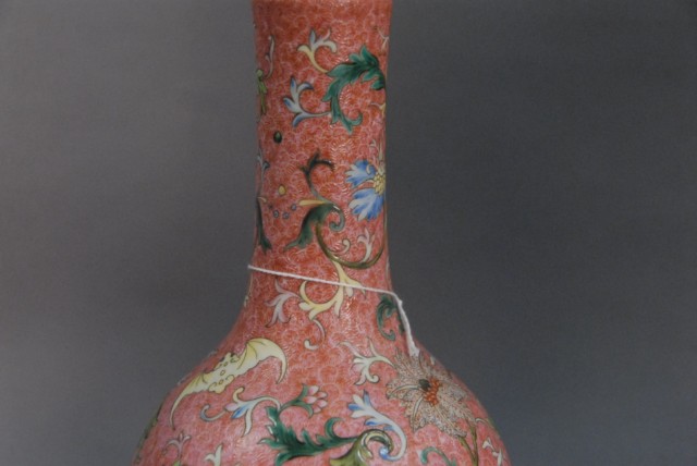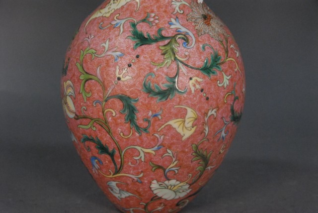 Qing Dynasty Famille Rose porcelain vase pink background.